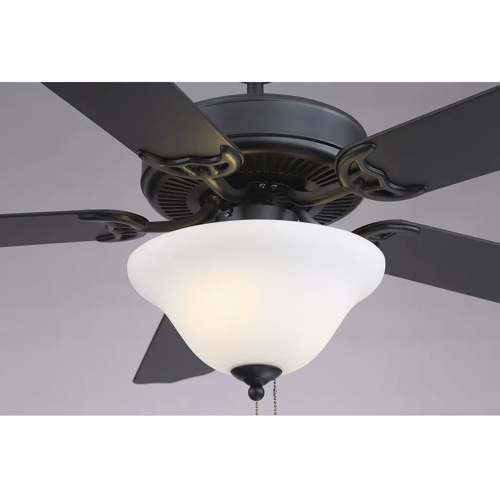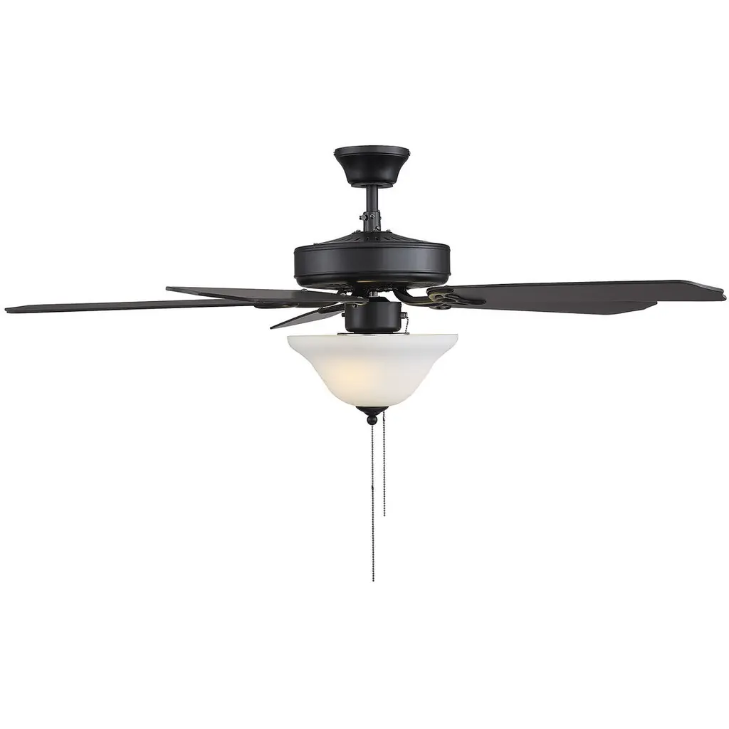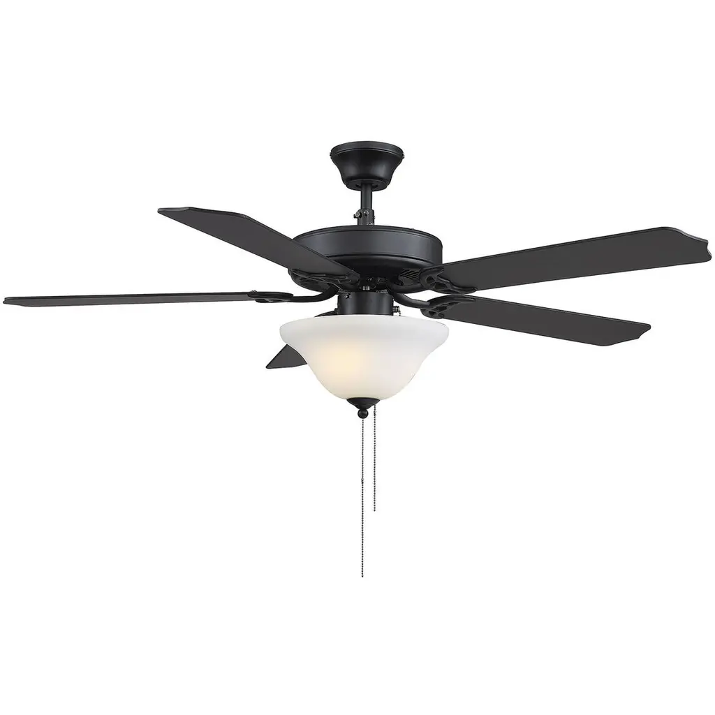 Classic ceiling fan style with incredibly versatile finishes. You’ll love the timeless color combination of matte black finish and white glass lamp shade — it matches beautifully with other finishes and color schemes in your home, whether in your living room, family room, bedroom, or home office. And the fixture design seamlessly blends with traditional, transitional, or modern farmhouse decor. A powerful motor and 52” blade span provide comfort; two included 9W LED bulbs provide superb light. This ceiling fan features a pull chain for 3-speed, reversible control and includes a dual mounting system, with downrod and hugger, for most ceiling heights. All together it’s a terrific value: classic style plus high-quality Savoy House performance.