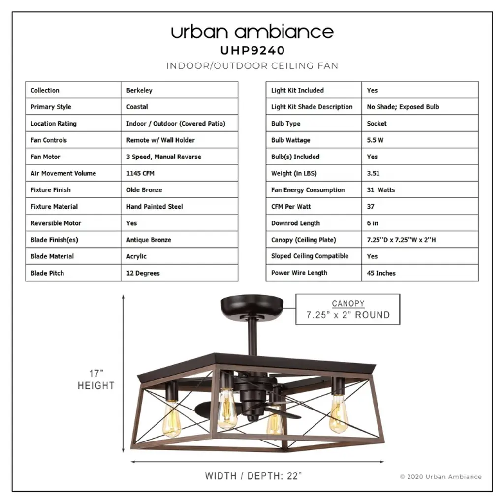 Urban Ambiance Luxury Farmhouse Ceiling Fan 17''h X 22''w, Olde Bronze Finish, Berkeley Collection, Uhp9240