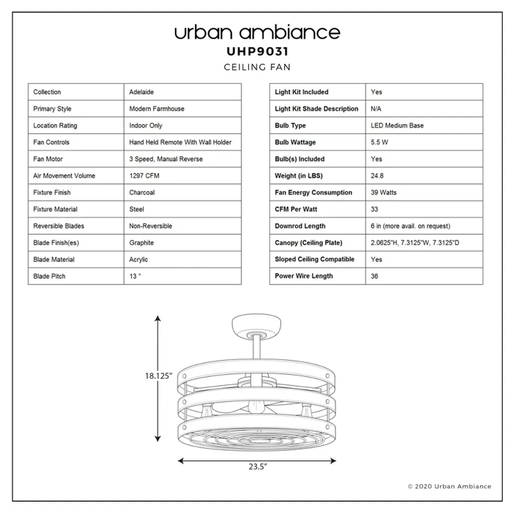 Urban Ambiance Luxury Modern Farmhouse Indoor Ceiling Fan, 18.1"h X 23.5"w, Charcoal, Uhp9031