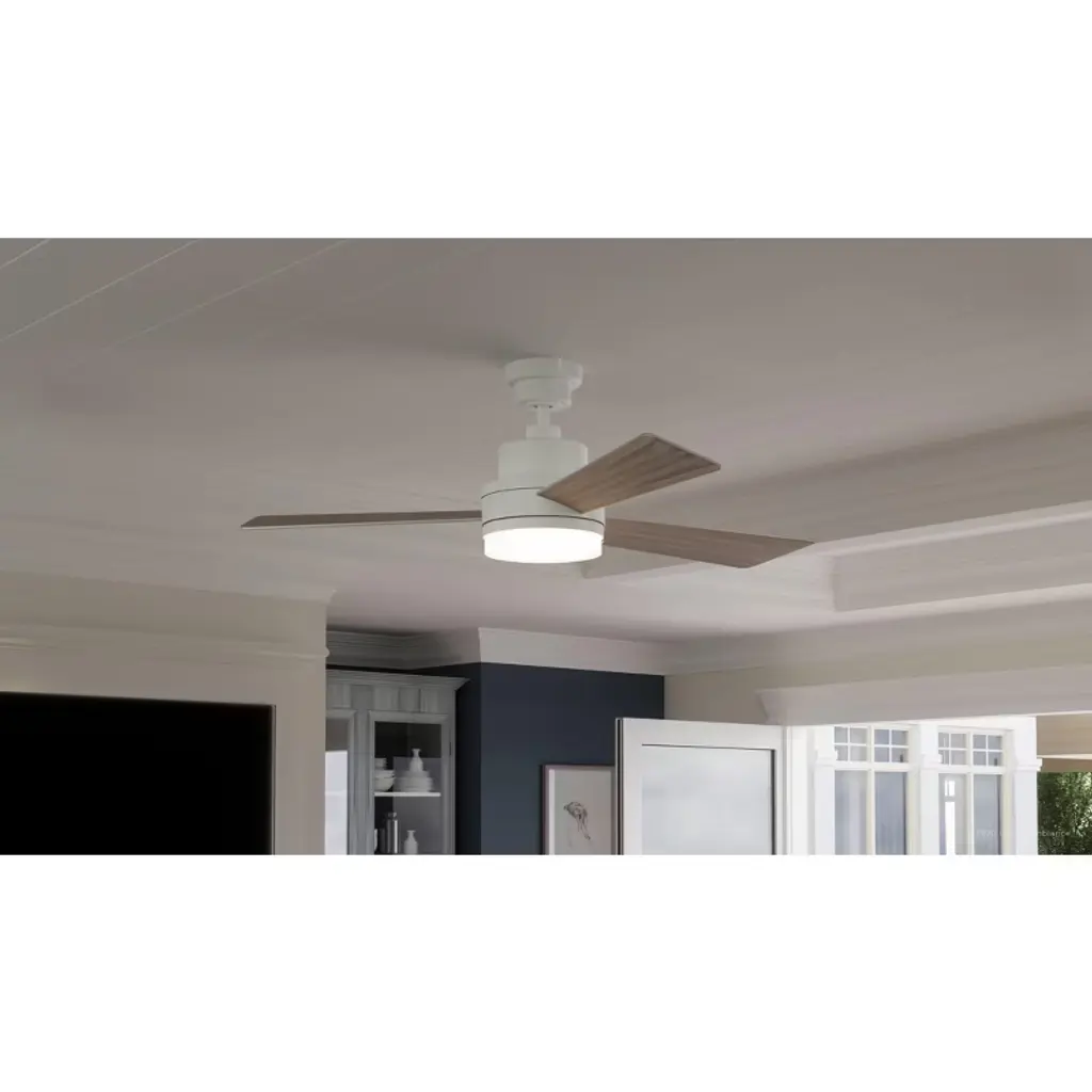 The Capitola collection is underscored by a contemporary allure sure to impress. The suspension stem barely drops at all before stepping out into a series of smooth bumps and sleek rings. From the lower center ring, three thin blades extend out, exiting the ring at an angle before expanding out into gently curved square edges. Complementing the blade ring suspension is a thinner underhanging ring that functions as a white opal glass diffuser. Concealed within the neat shade is an energy-saving LED light source to complement the cool breeze from the blades.