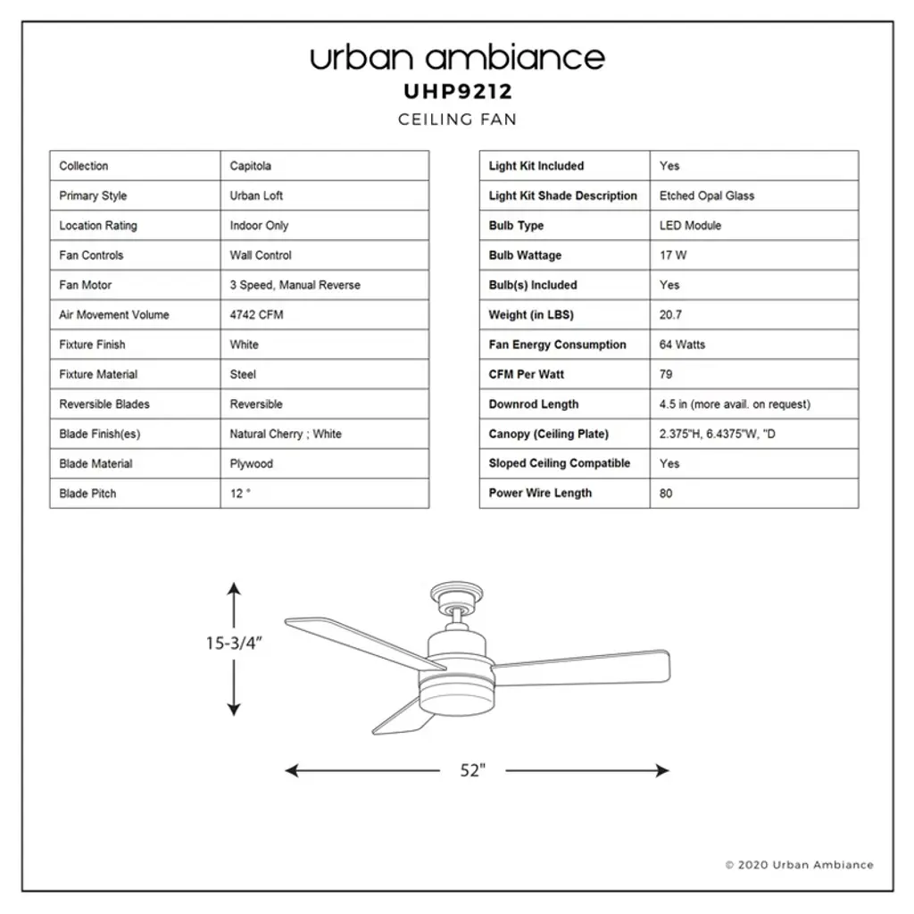 Urban Ambiance Luxury Modern Indoor Ceiling Fan, 15.8"h X 52"w, White, Uhp9212