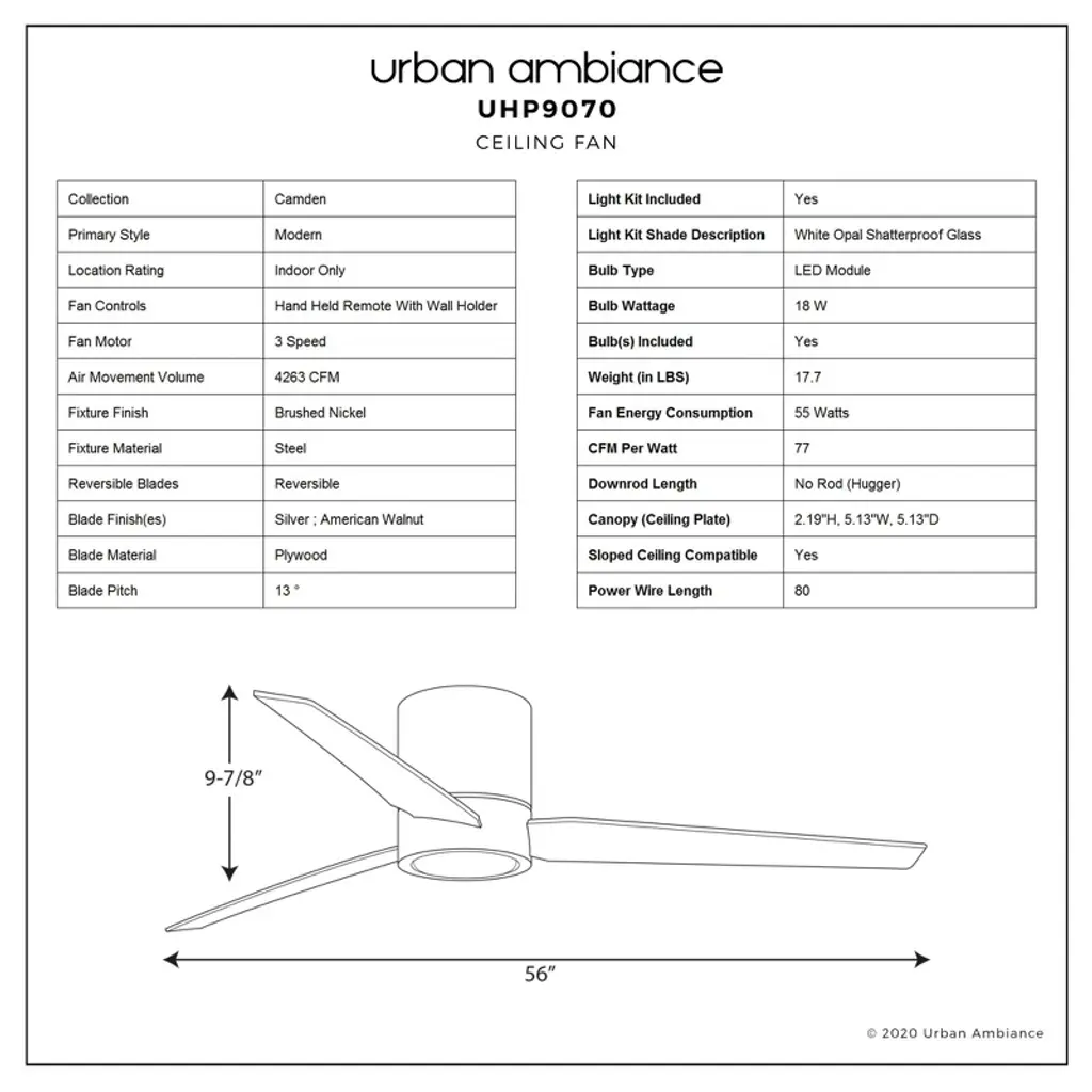 Urban Ambiance Luxury Modern Indoor Ceiling Fan, 9.9"h X 56"w, Brushed Nickel, Uhp9070