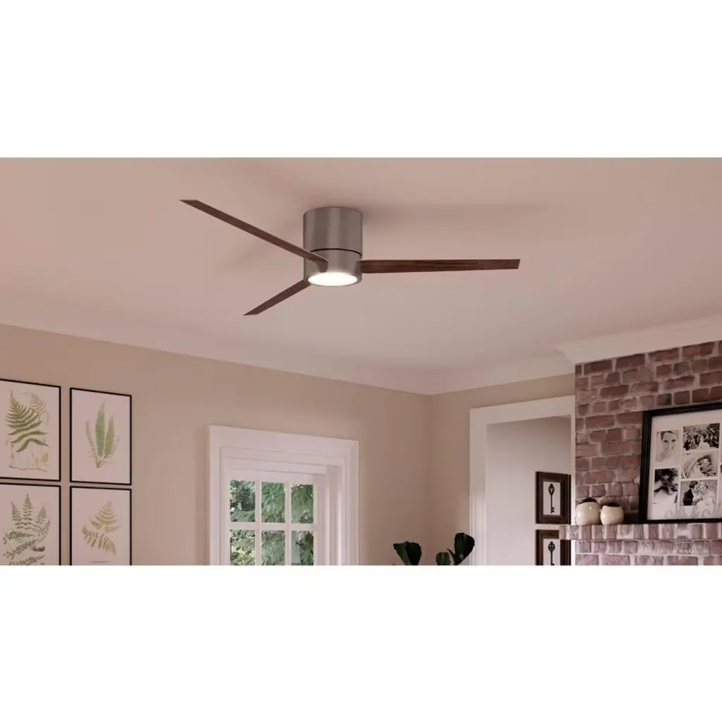 The Camden collection adds a luxurious look indoors with a clean modern design. Borrowing heavily from traditional hugger fans, this design showcases clean lines captured in both the suspension and the suspended detail. A sleek cylindrical column harmonizes with another underhanging cylindrical compartment to house the diffuser and the extending fan blades. The wood-textured blades slash the center cylinder at an intriguing angle before sprawling out in a similarly slanted manner. The tapered blade trio then cedes the stage to a shatterproof white opal glass shade that peeps out from below. Equipped with a remote control, the reversible blades will do all the work to sustain your comfort.