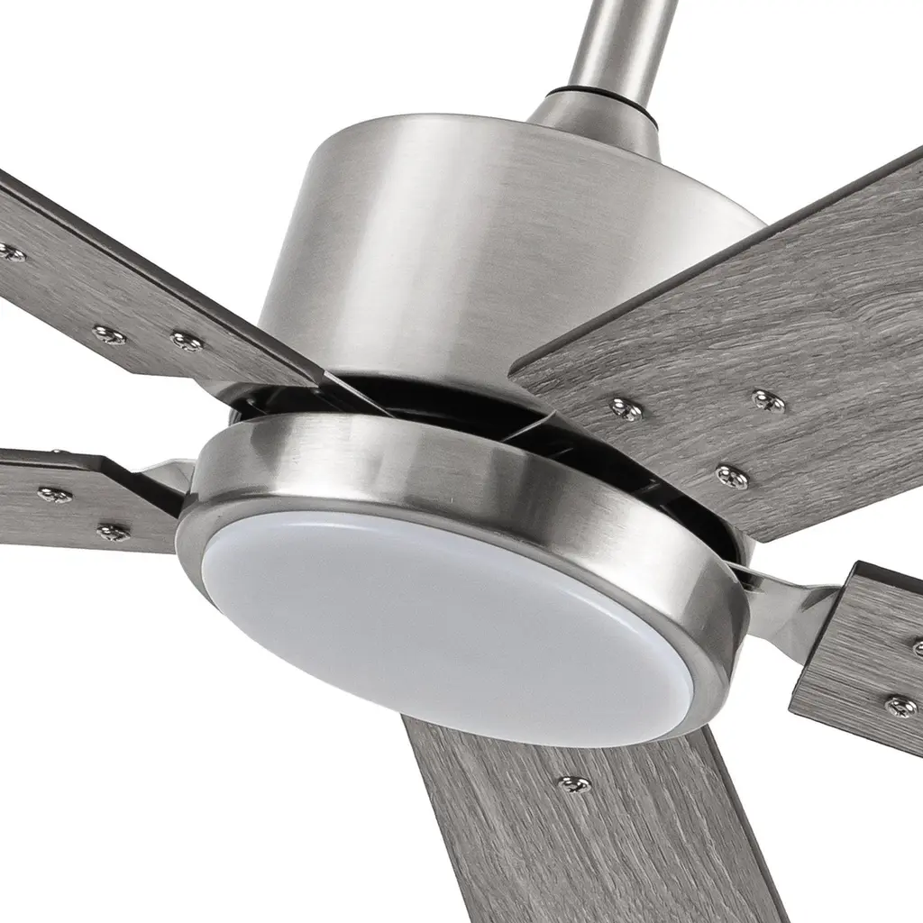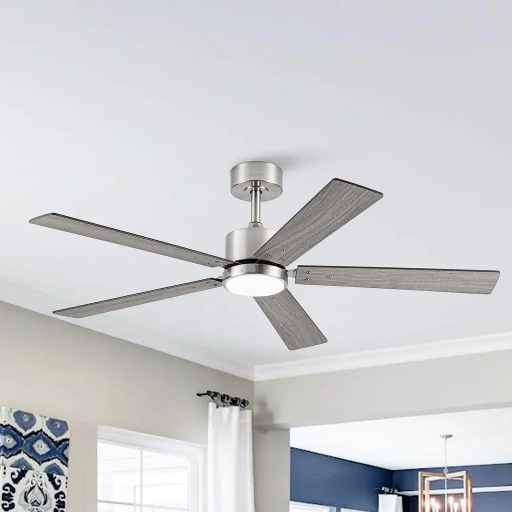 Make your space feel cooler with this Merwry 52-inch industrial-style ceiling fan. LED indoor ceiling fan. Integrated LED light sources provide energy efficiency for large spaces. For easy operation, it is equipped with a handheld remote control that can control 6 levels of wind speed. The acrylic shade, black/brush nicke/white finish and five blades add style. Suitable for use in large space environments.