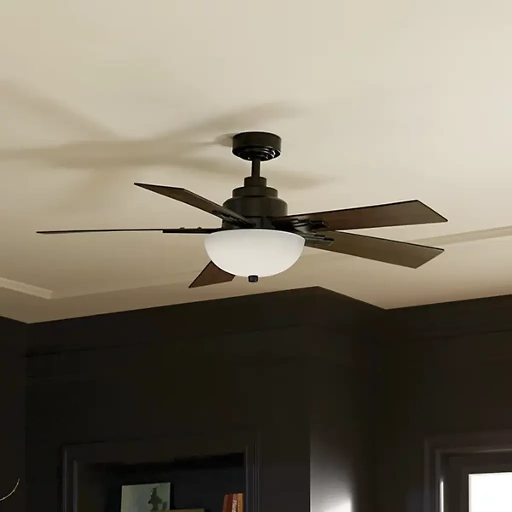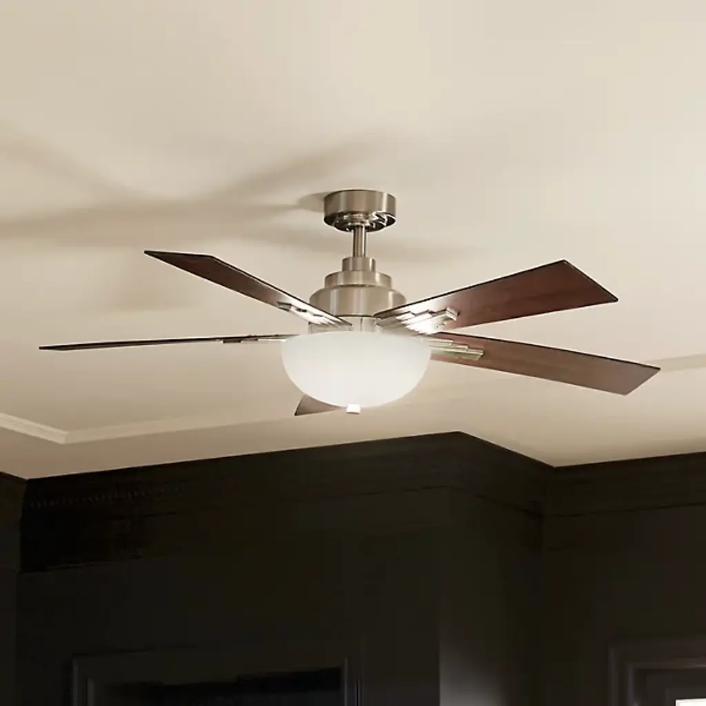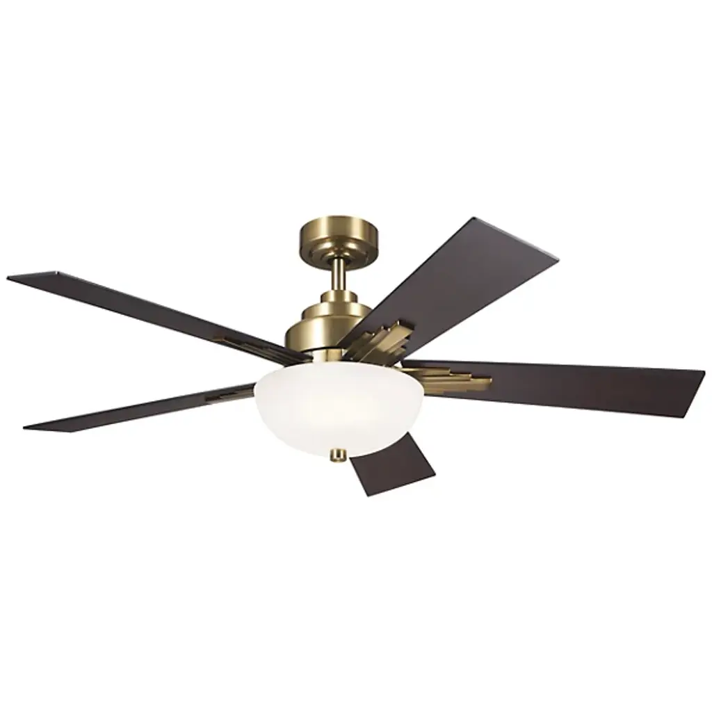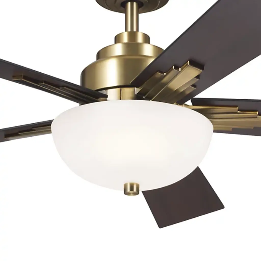 Receive comfort in luxury with the Art Deco-inspired Vinea LED Ceiling Fan from Kichler. This recognizable piece decorates the overhead space with stepped metal hardware and angular accents. The angular accents jump out visually against either side of the reversible blades. The blades look sharp and cut through the air at 3 separate speeds. A powerful engine lets the blades create an upsurge or downflow of air. At the core, an opal glass dome scatters a glare-free LED for an enhanced atmosphere.