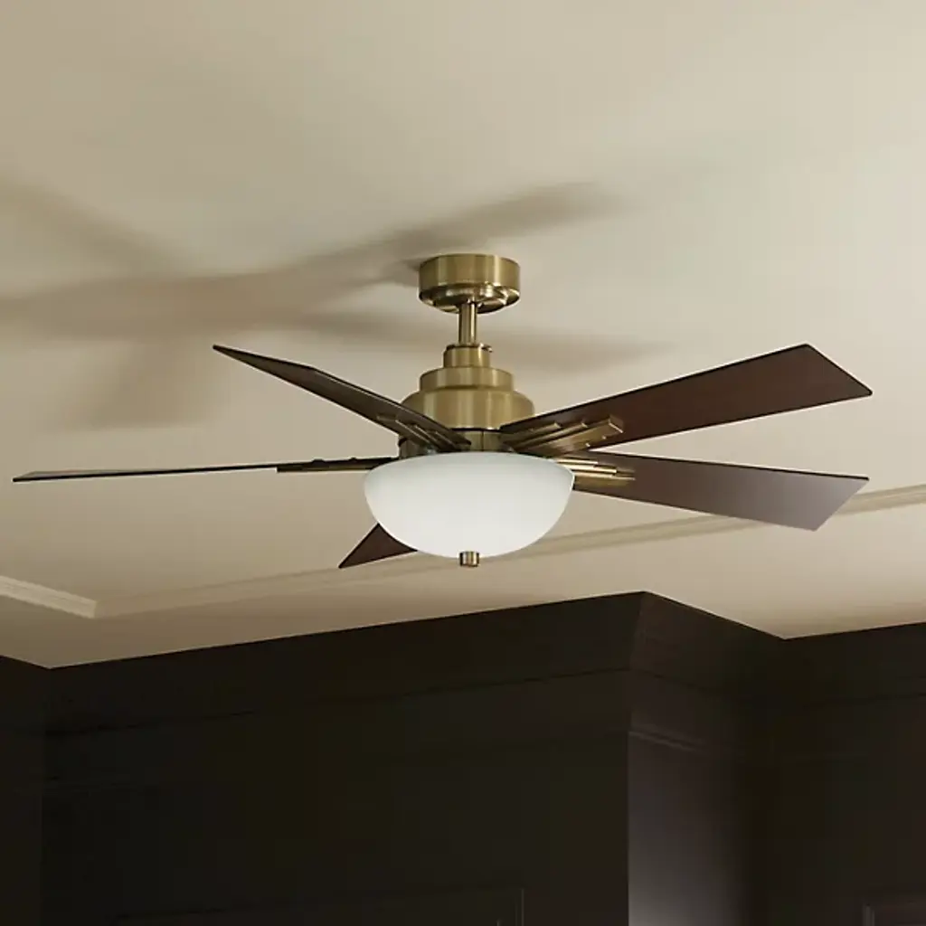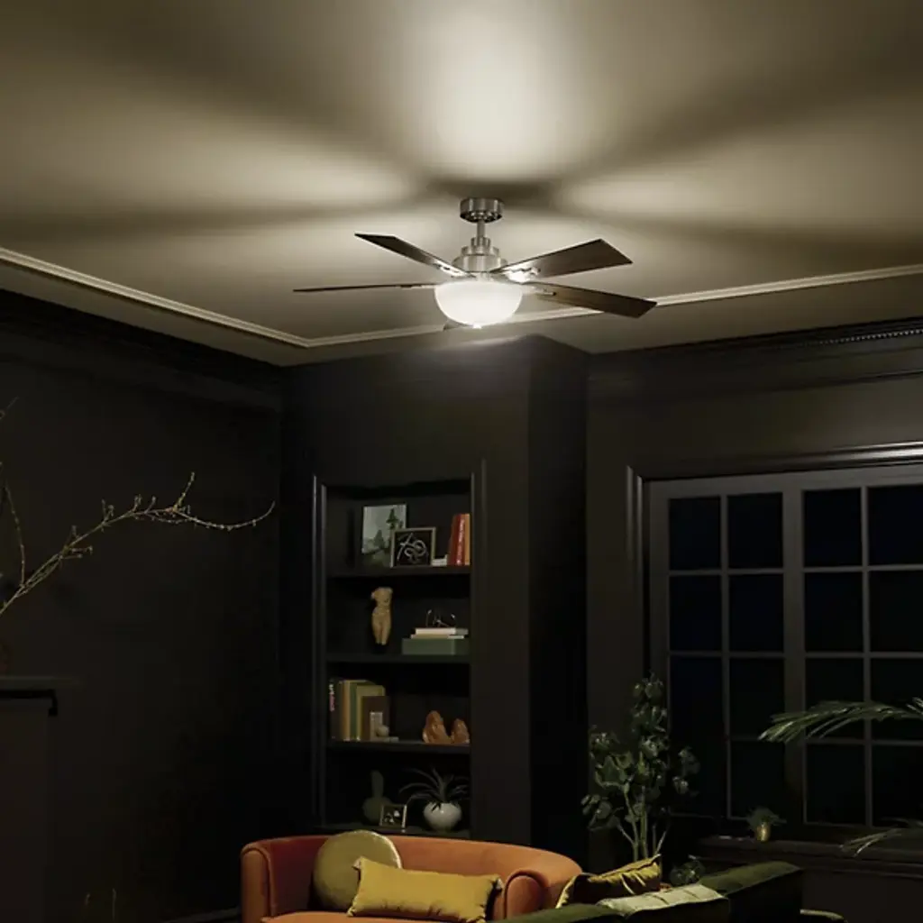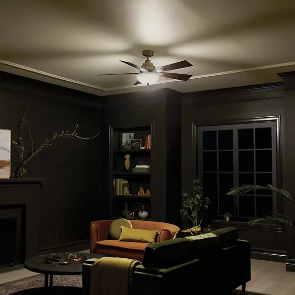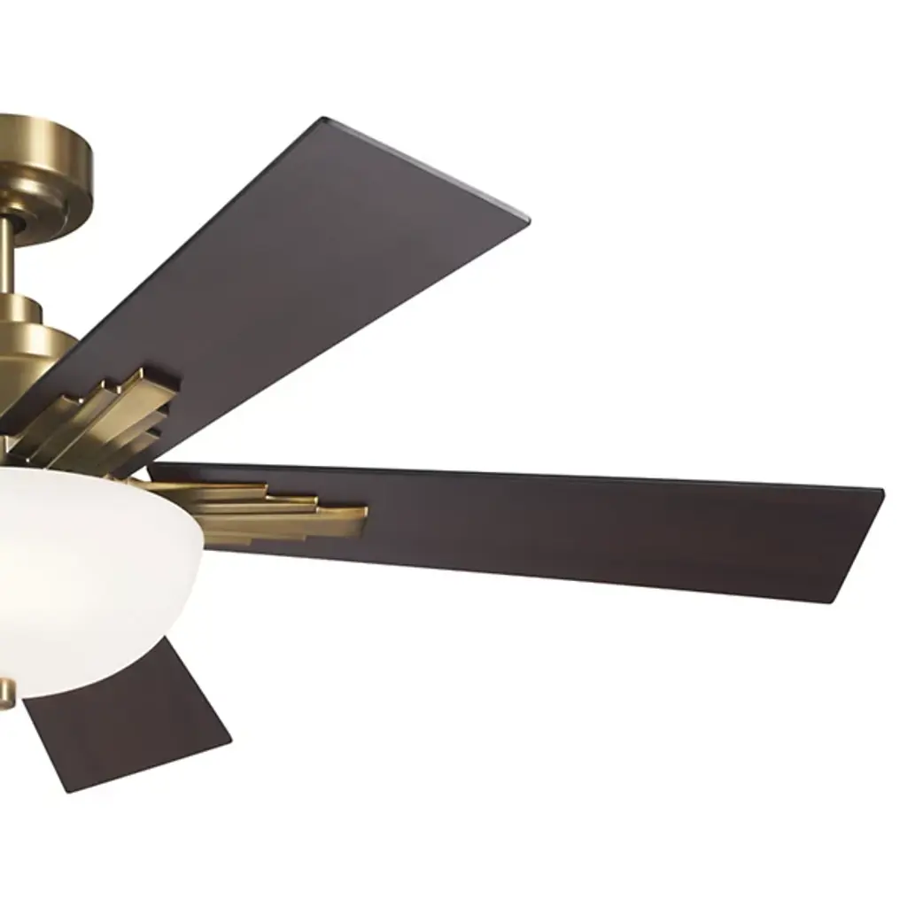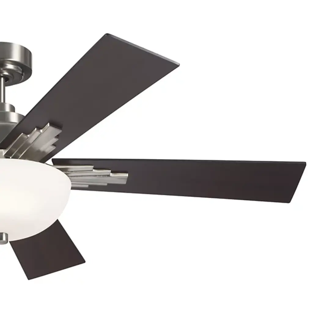 Receive comfort in luxury with the Art Deco-inspired Vinea LED Ceiling Fan from Kichler. This recognizable piece decorates the overhead space with stepped metal hardware and angular accents. The angular accents jump out visually against either side of the reversible blades. The blades look sharp and cut through the air at 3 separate speeds. A powerful engine lets the blades create an upsurge or downflow of air. At the core, an opal glass dome scatters a glare-free LED for an enhanced atmosphere.