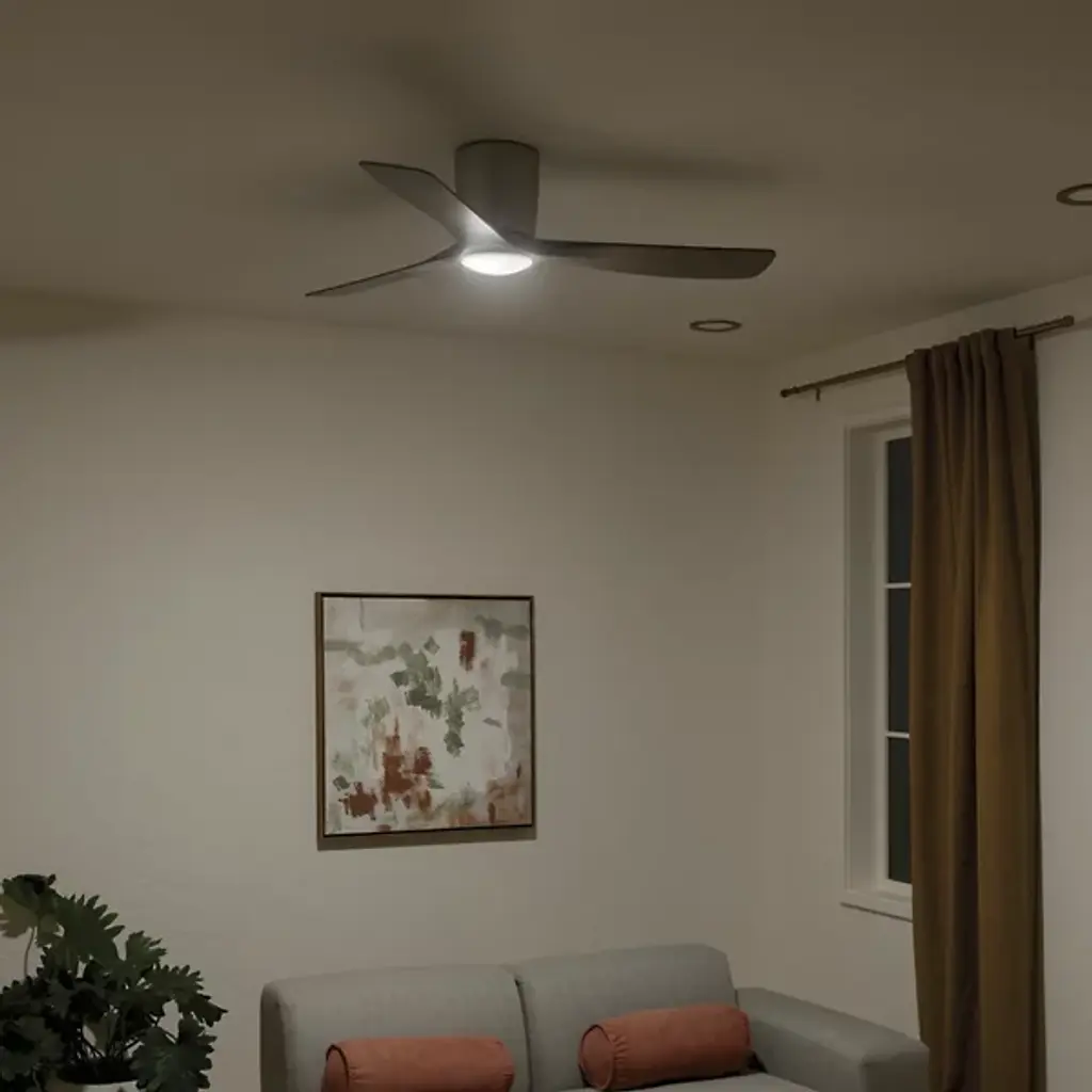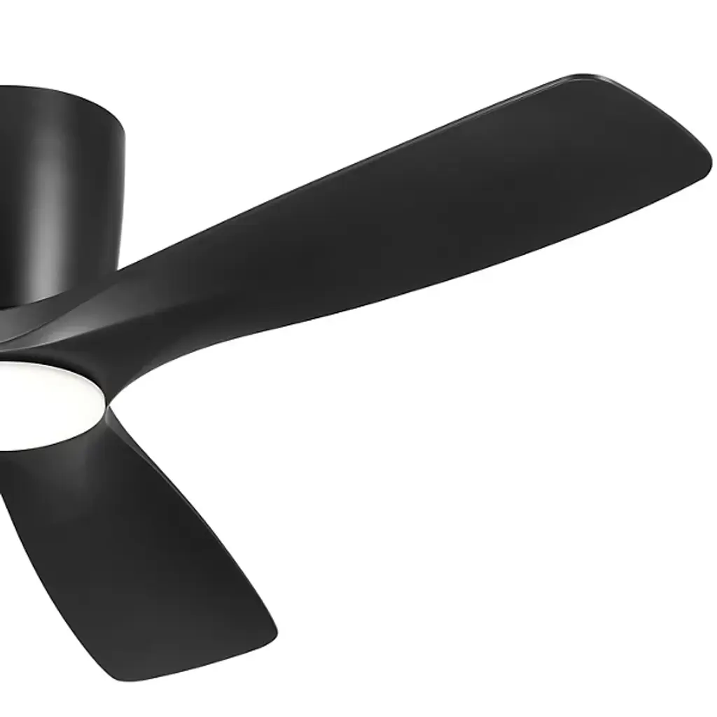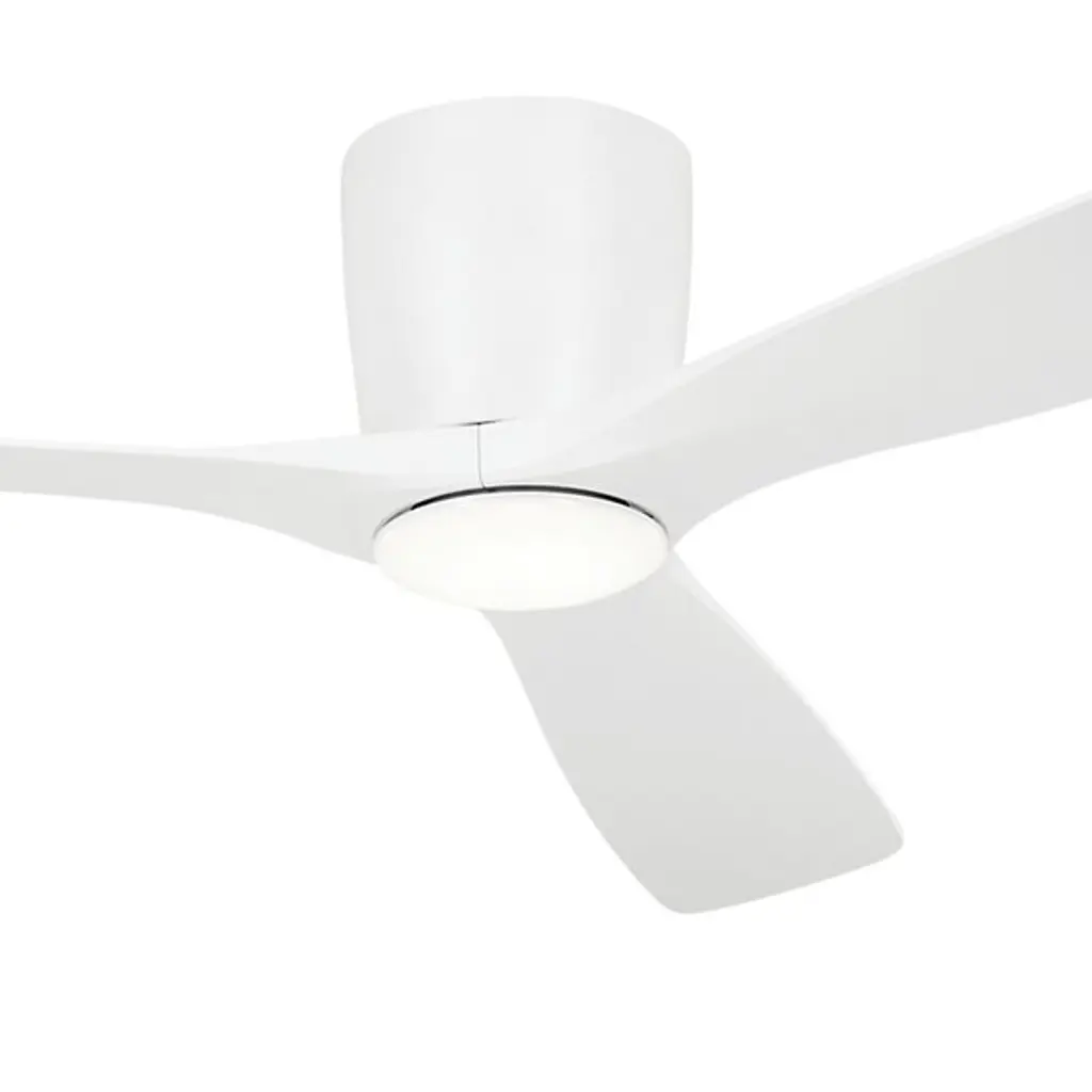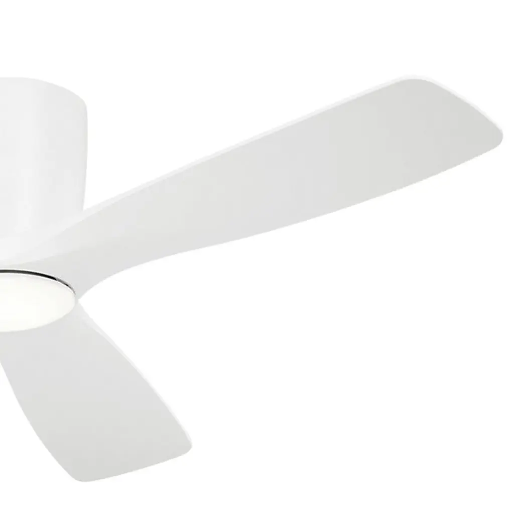 Bring an expressive elegance to your interiors with the simple, sculptural styling of the Volos LED Ceiling Fan from Kichler. Descending from a sleek steel housing that slightly contracts as it drops, three robust ABS blades extend from a sleek button hub, each fluidly extending into the other blades to provide a clever continuity of shape. Illumination is provided by an LED lamp integrated into the central hub in the middle of the blades, extending a warm wash of light through a lens of frosted white polycarbonate that coordinates well with the rest of the fan, bathing its surroundings in a pleasing glow of ambient light.