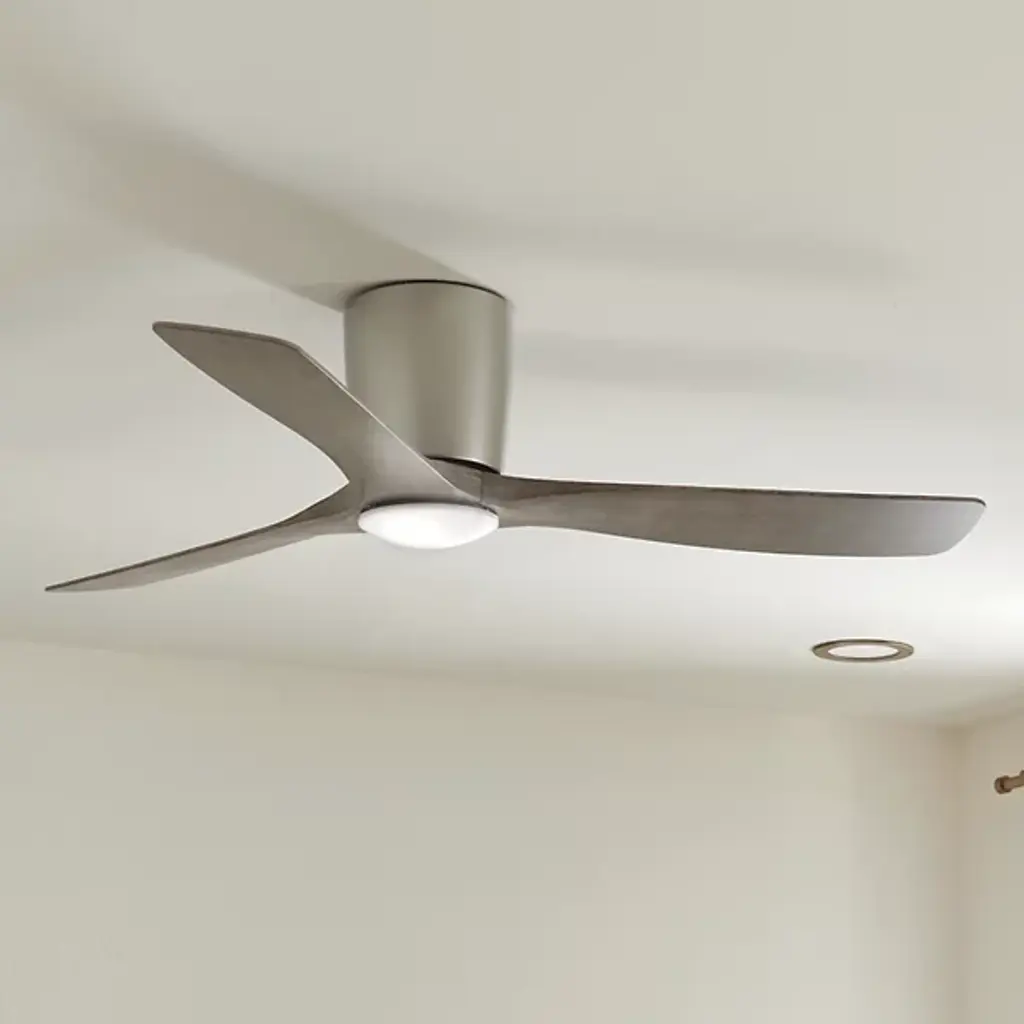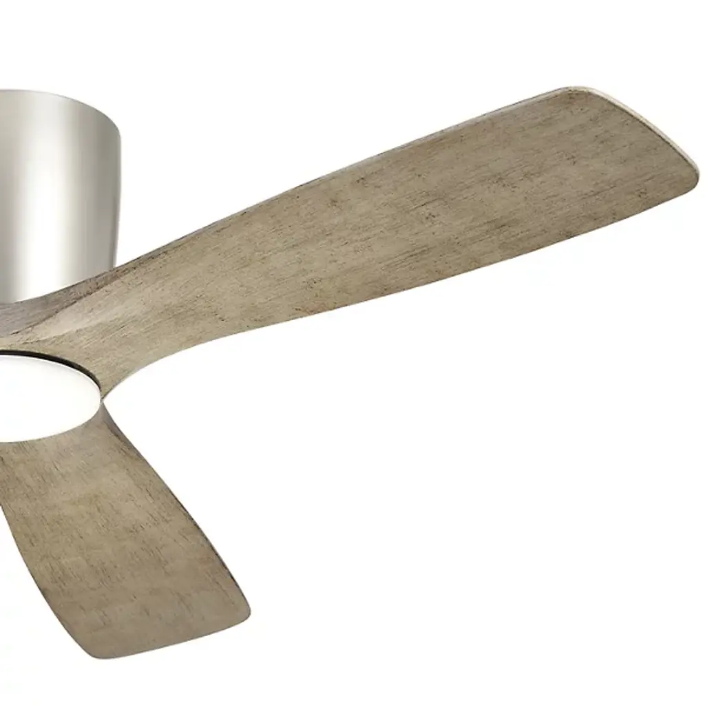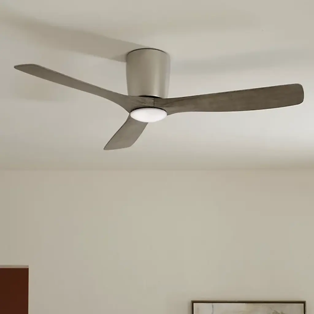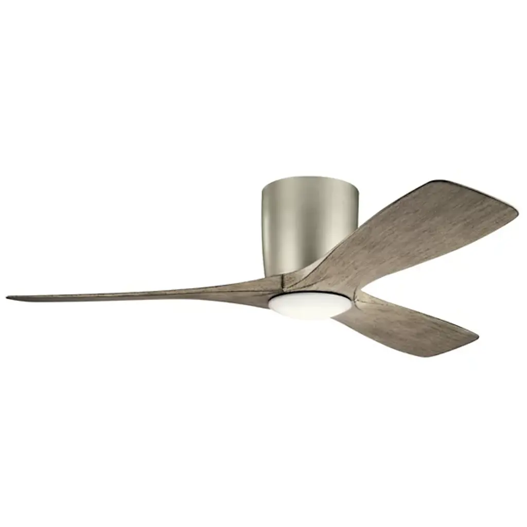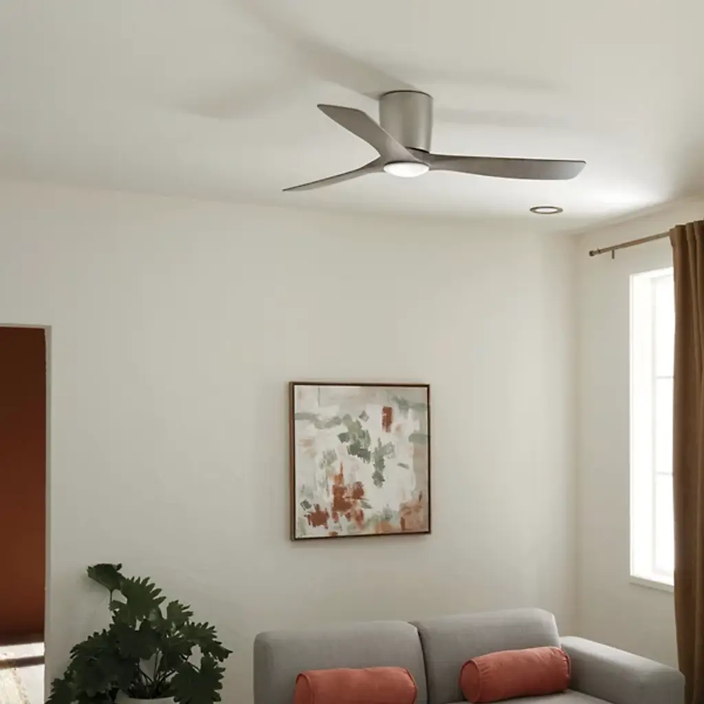 Bring an expressive elegance to your interiors with the simple, sculptural styling of the Volos LED Ceiling Fan from Kichler. Descending from a sleek steel housing that slightly contracts as it drops, three robust ABS blades extend from a sleek button hub, each fluidly extending into the other blades to provide a clever continuity of shape. Illumination is provided by an LED lamp integrated into the central hub in the middle of the blades, extending a warm wash of light through a lens of frosted white polycarbonate that coordinates well with the rest of the fan, bathing its surroundings in a pleasing glow of ambient light.