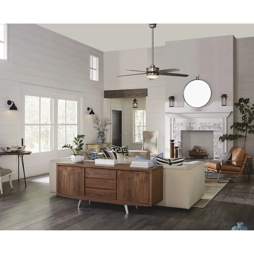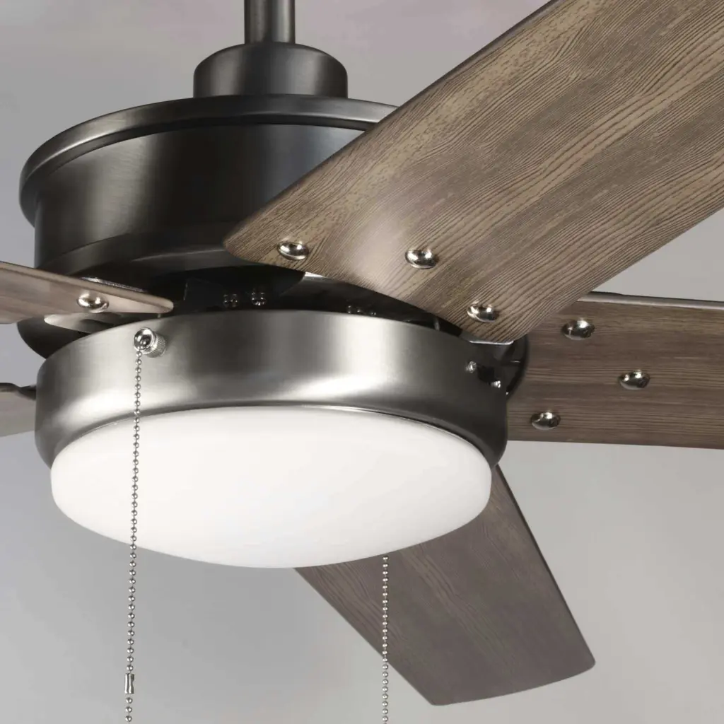 Refresh your indoor or covered outdoor living spaces with the crisp, clean style of the 60 inch Whirl fan. The stylish design comes in Antique Nickel with driftwood blades. The five-blade fan features an all weather damp location rating (ABS) to accommodate a variety of settings throughout the home. White opal glass shade with a 17W LED light source offers a warm 3000K-color temperature, energy savings and maintenance benefits for the home. Whirl features a dual mount system and a three-speed pull chain fan switch, as well as an on/off pull chain switch to operate the light.