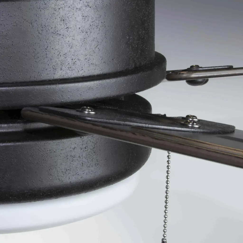 Refresh your indoor or covered outdoor living spaces with the crisp, clean style of the 60 inch Whirl fan. The stylish design comes in Forged Black with toasted oak blades. The five-blade fan features an all weather damp location rating (ABS) to accommodate a variety of settings throughout the home. White opal glass shade with a 17W LED light source offers a warm 3000K-color temperature, energy savings and maintenance benefits for the home. Whirl features a dual mount system and a three-speed pull chain fan switch, as well as an on/off pull chain switch to operate the light.