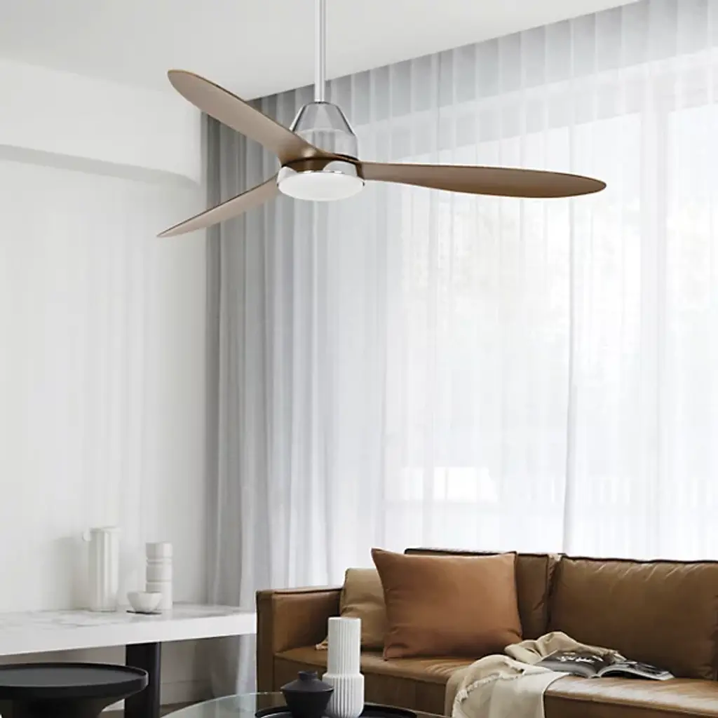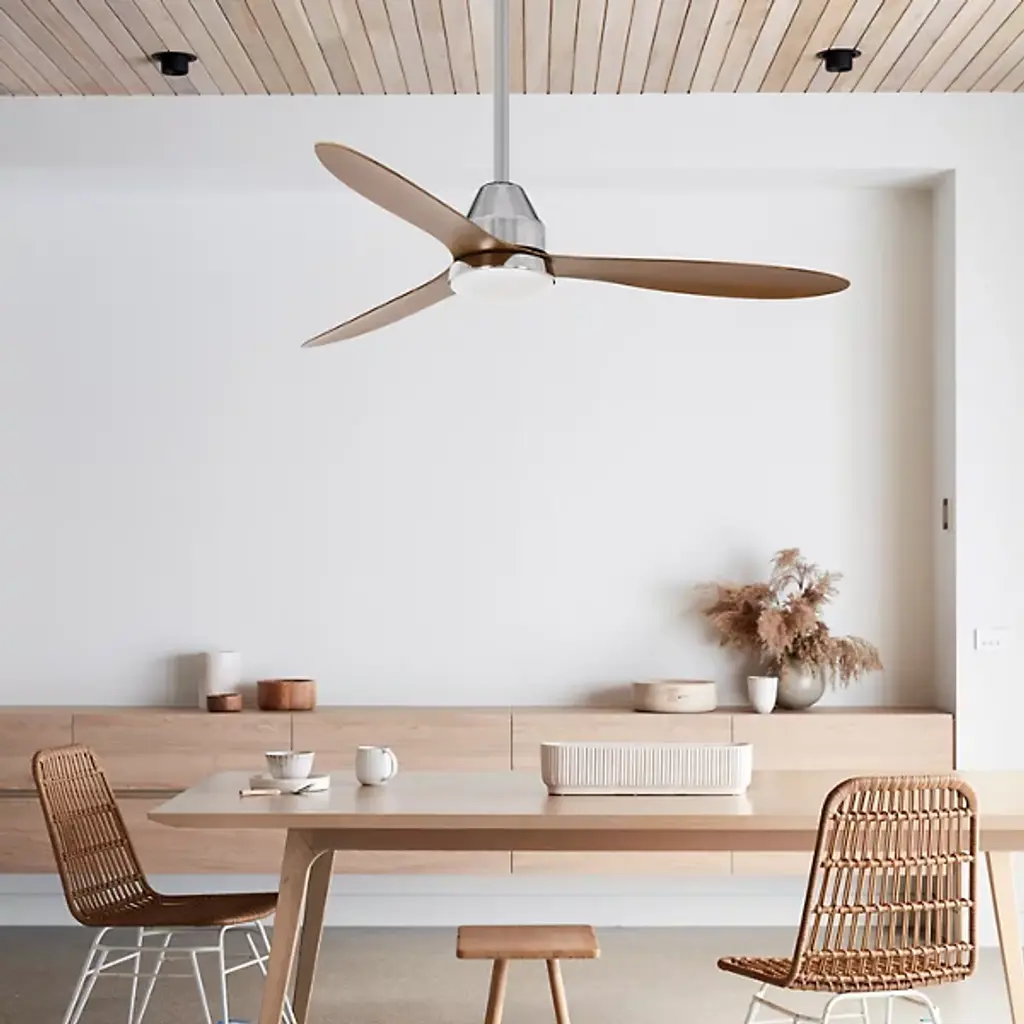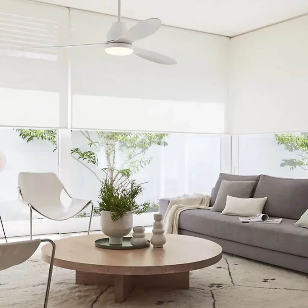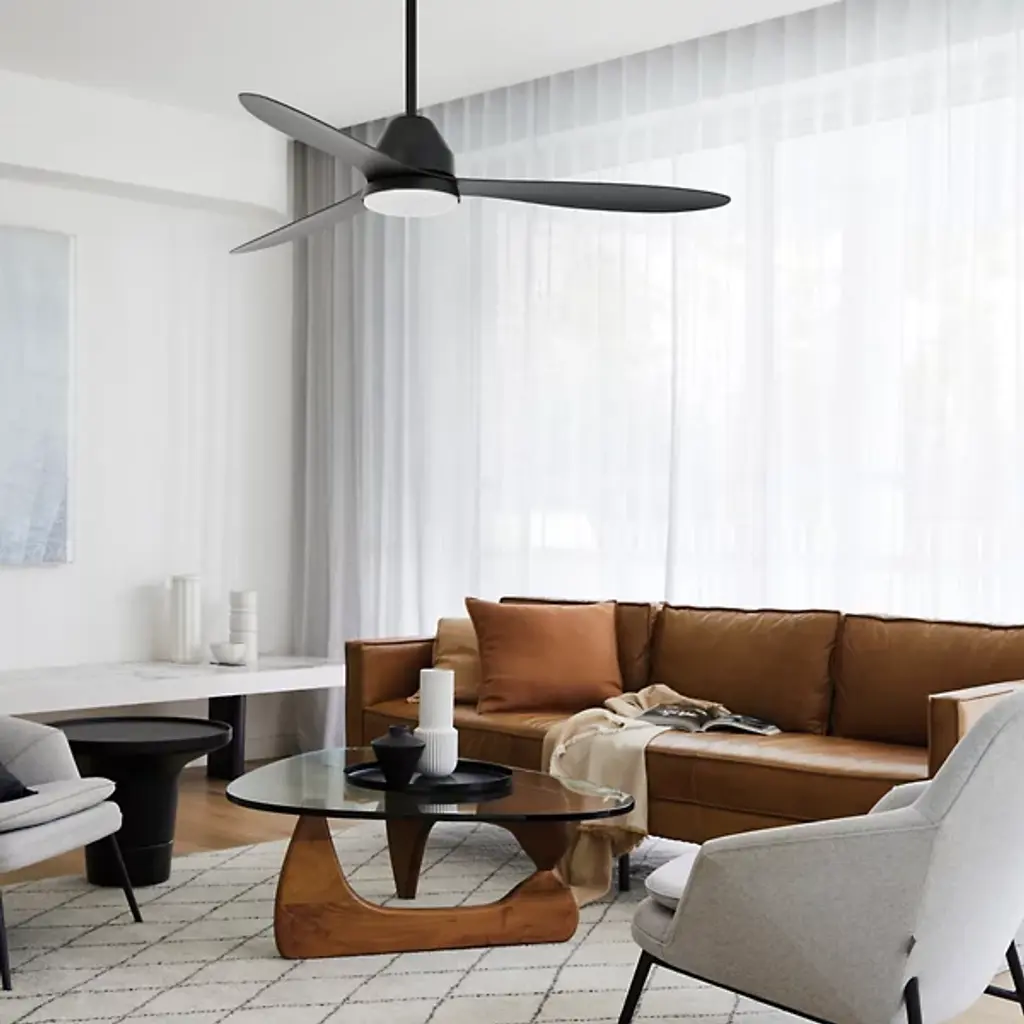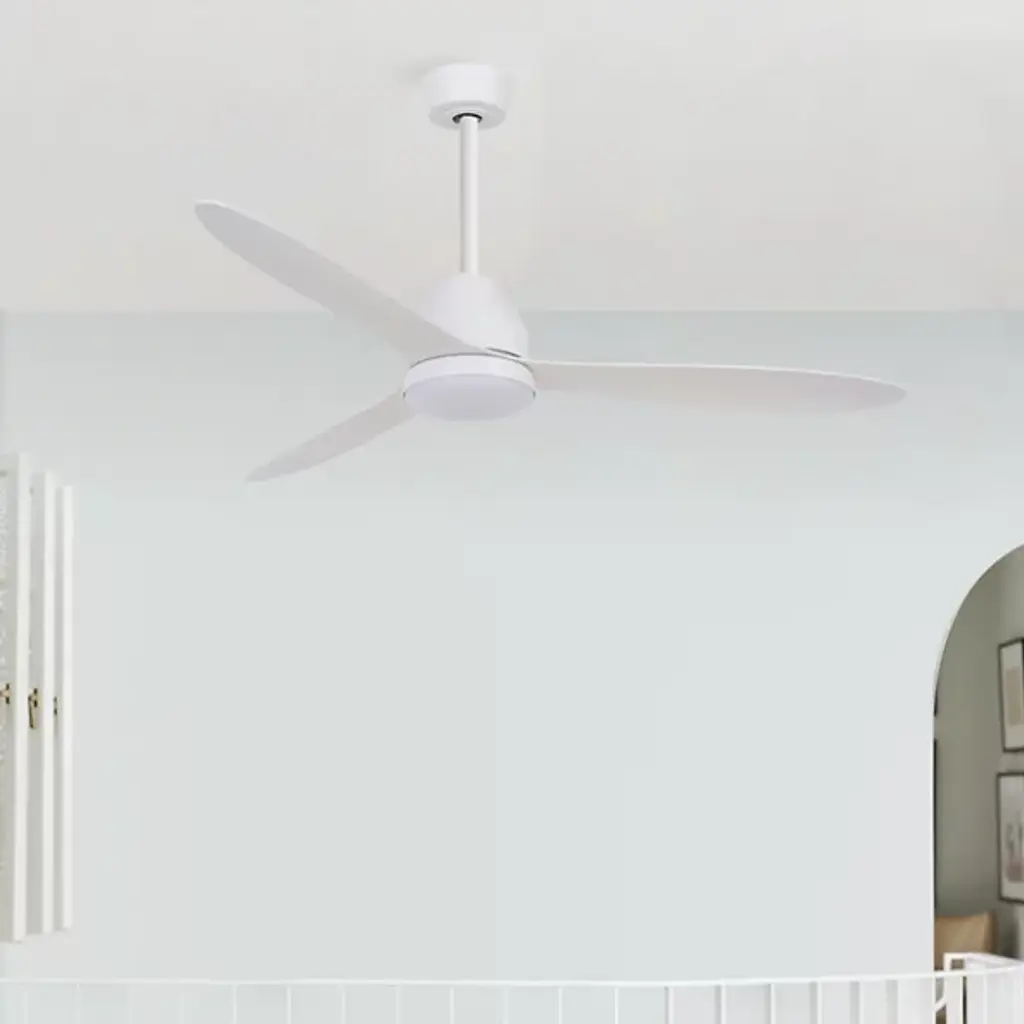 The Whitehaven Lucci Air Indoor / Outdoor Smart LED Ceiling Fan from Beacon Lighting pairs refined contemporary style with versatile performance. Designed by Lucci Air, it features three gracefully contoured ABS blades set at a 12-degree pitch, powered by a high-efficiency DC motor offering six fan speeds for precise airflow control. A conical canopy and smooth blade design contribute to the fan’s streamlined appearance, holding an integrated LED light with three dimming levels. The included handheld remote controls fan speed, light dimming, and reversible airflow for year-round comfort.