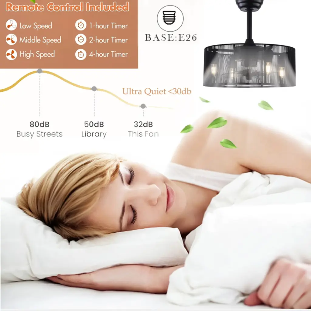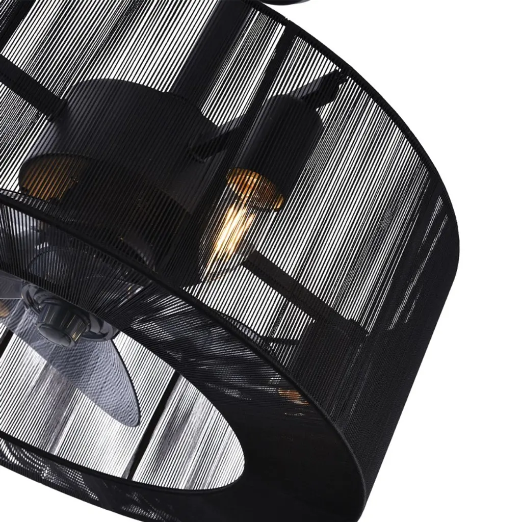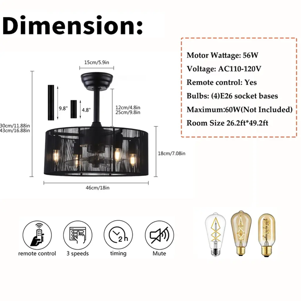This 18-inch ceiling fan light combines modern style with practical functionality, featuring a classic black finish and a round open lampshade for wide, ambient illumination. It is equipped with three durable ABS fan blades and a powerful, yet whisper-quiet pure copper motor that offers three adjustable speeds and a built-in timer for customized comfort. Controlled by an included remote, this 2-in-1 fixture efficiently cools your space while providing excellent lighting, making it a stylish and energy-saving addition to any room in your home. Specifications Material: Iron, ABS, Nylon, Copper Process: Spraying Paint Color: Black Style: Modern Efficiency: E Assembly Required: Yes Indoor/Outdoor Usage: Indoor Mounting Type: Ceiling Mount Control Method: Remote Control(Included), Wall Switch (Not Included) Remote Control Distance: 3-5m/9.84-16.4ft Battery Type: 2* AAA Batteries Light Source Type: 4* E26 Bulbs(Not Included) Motor Type: Pure Copper Motor Voltage: AC 110- 120V Max. Single Bulb Power: 60W Number of Fan Blades: 3 Wind Speed Gears: 3 Timing: 1/2/4H Light Applicable Area: 10-15m²/107.64-161.46ft² Motor Power: 56W Noise: 35dB Base Size: 15cm/5.9in Hanging Rod Length: 12.5cm/4.92in, 20cm/7.87in Product Height: 30.5cm/12in(With Short Rod), 38cm/14.96in(With Length Rod) Lampshade Size(D*H): 46*18cm/18*7.08in Base Diameter: 15cm/5.9 inches