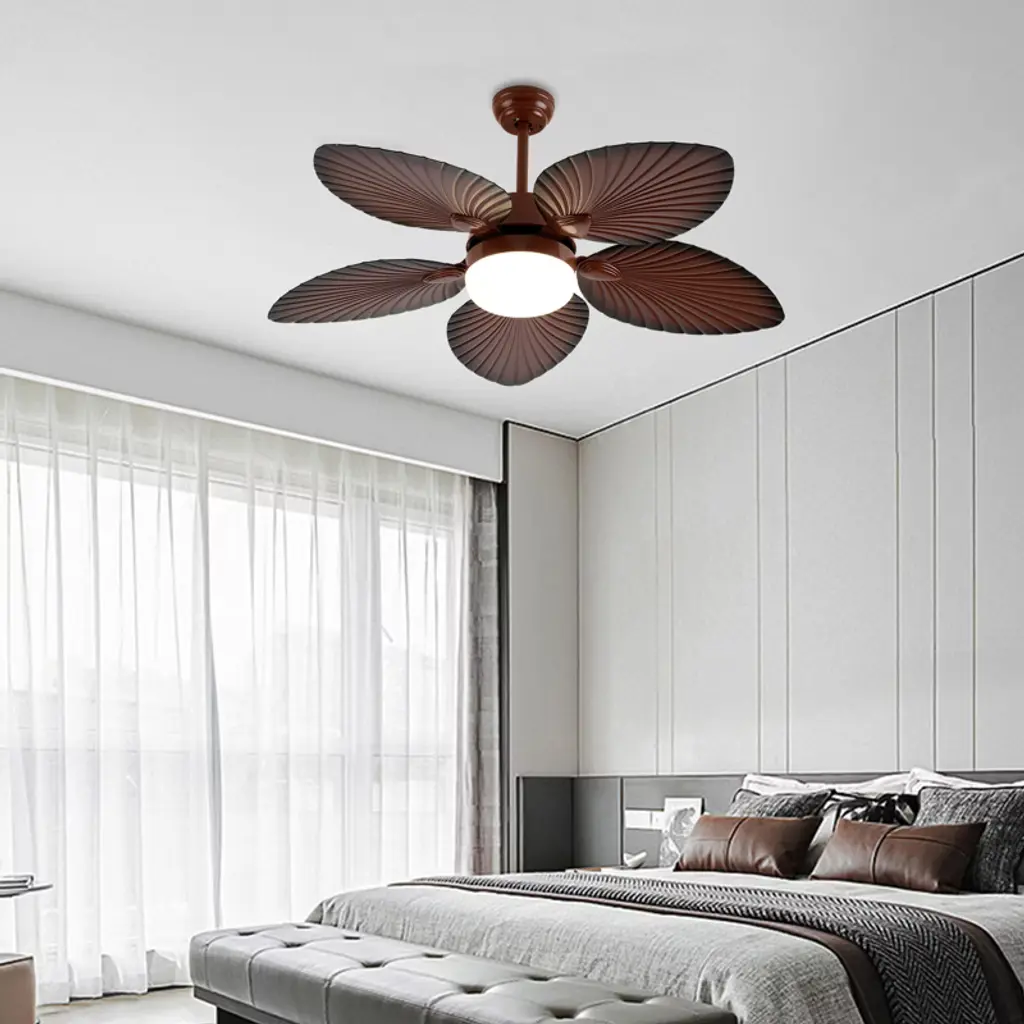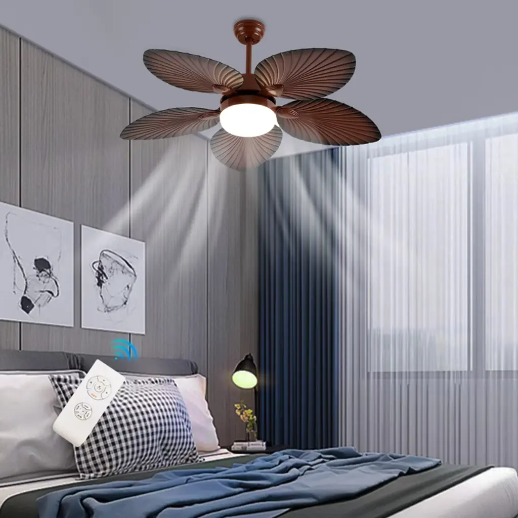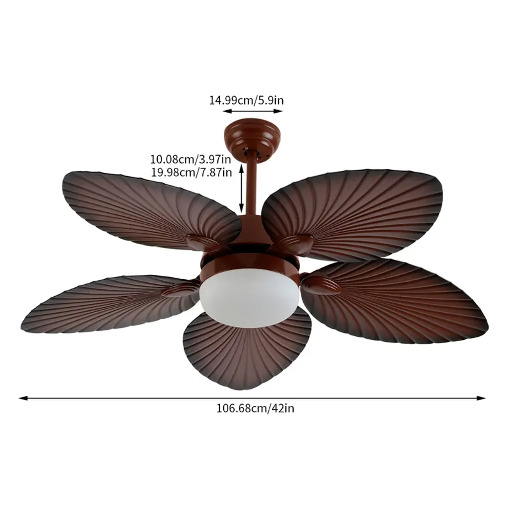Elevate your living space with this modern 42-inch ceiling fan light, a perfect fusion of style, comfort, and functionality. Designed with elegant leaf-shaped fan blades and a sophisticated brown-and-black finish, it serves as both a powerful cooling solution and a stunning centerpiece for any room. The integrated energy-saving LED light offers three color temperatures (warm, warm white, and white) to create the ideal ambiance, while the whisper-quiet pure copper motor delivers three adjustable fan speeds for year-round comfort. Control it all effortlessly with the included remote, and enjoy convenient features like a 1/2/4-hour timer and two downrod options for a custom fit. Ideal for living rooms, bedrooms, and more, this durable and easy-to-clean fixture is designed to enhance your home and simplify your life. Specification Material: Metal, Glass, Plastic, Copper Color: Black, Brown Motor Type: Pure Copper Motor Mount Type: Ceiling Mount Control Method: Remote Control(Included) Light Source: LED(Included) Efficiency: E Noise: Within 35dB Number of Fan Blades: 5 Wind Speed: 3 Gears Timing: 1/2/4H Motor Power: 56W Light Power: 24W(White Light)/24W(Warm Light)/48W(Warm White Light) Voltage: AC110-120V Light Color: White/Warm/Warm White Color Temperature: 3000K-4500K-6000K Applicable Ceiling Height: >2.4m/7.87ft Applicable Ceiling Load Capacity: >30kg/66.14lbs Lighting Area: Within 20m²/215.28ft² Air Supply Area: About 5m²/53.82ft² Remote Control Distance: Within 3m/9.84ft Rod Length: 10.08cm/3.97in, 19.98cm/7.87in Base Diameter: 14.99cm/5.9in Overall Product Diameter: 106.68cm/42in