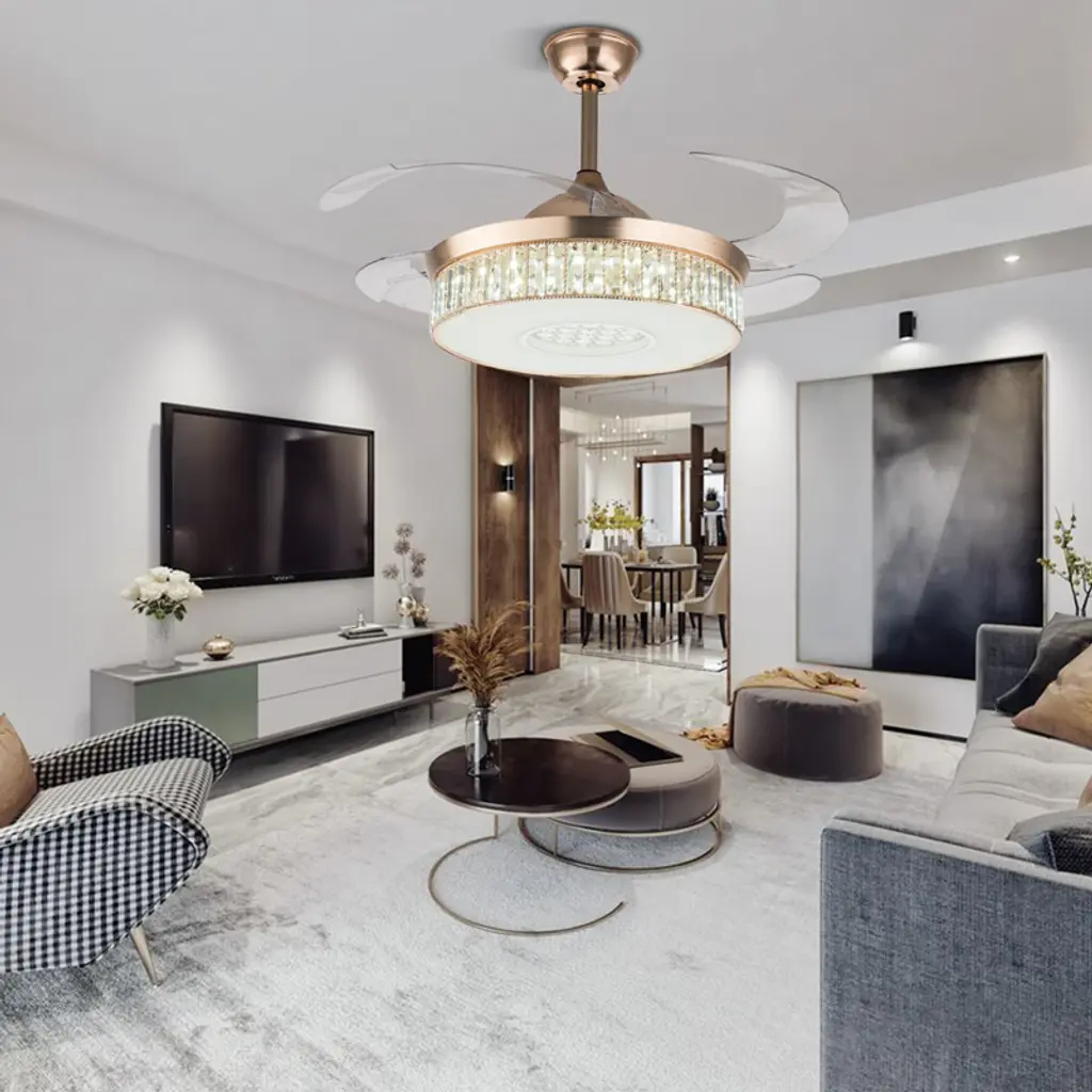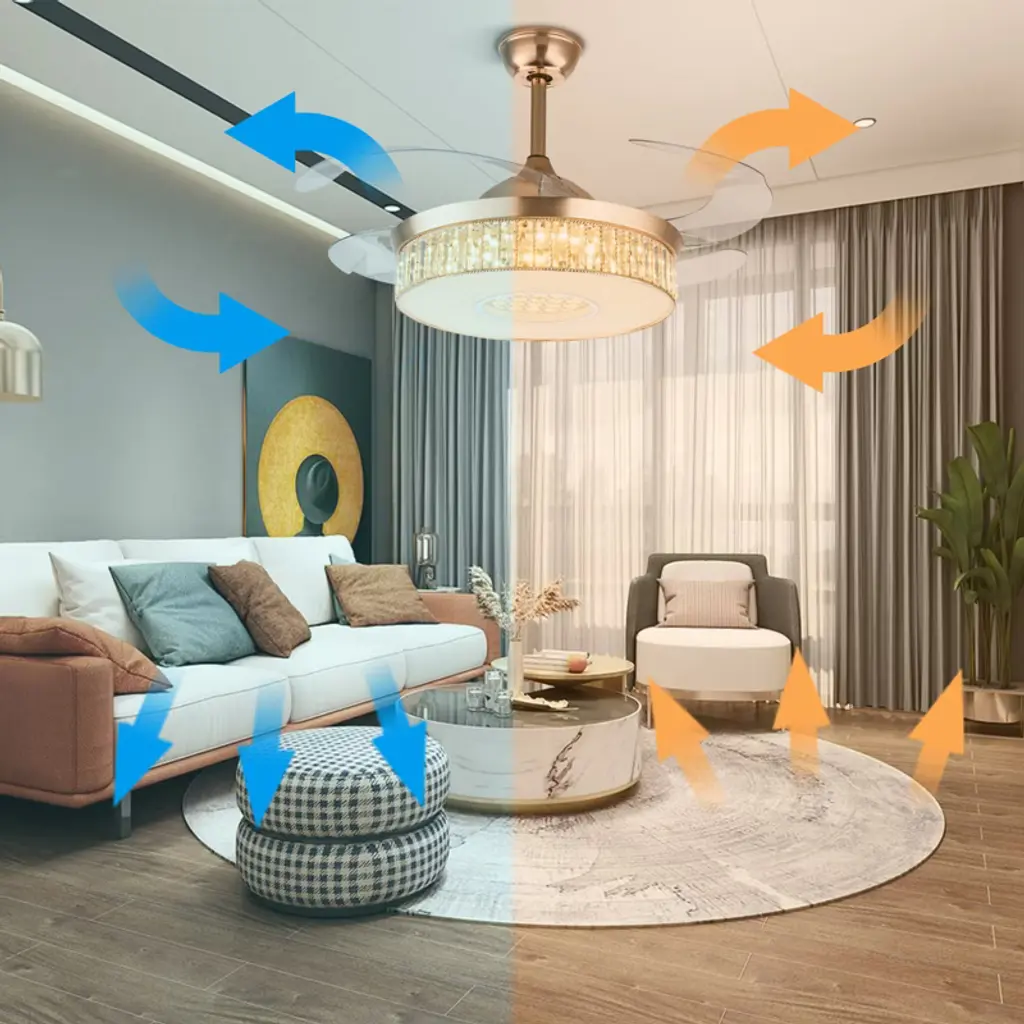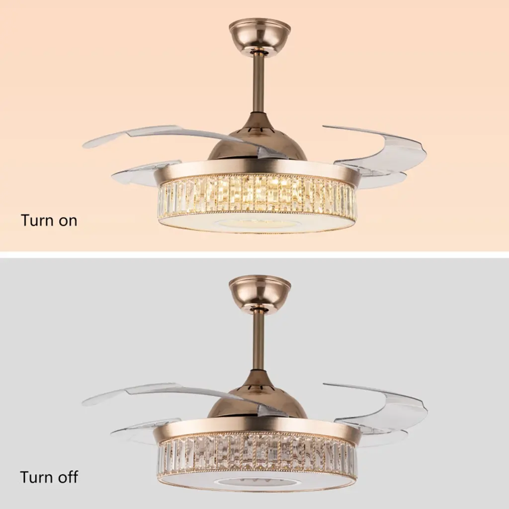 Our 42 in. ceiling fan lamp illuminates your space with an modern design, making it the perfect choice for chandelier lovers. Usually as an ordinary fan, it promotes air circulation very well. When closed, the blade retracts invisibly, leaving only a beautiful led chandelier. It's equipped with 4 retractable blades and a powerful quiet motor, the ceiling fan light can move a large amount of air. In the hot summer, it will meets all your expectations and needs. All operations can be controlled to the remote control, adjust the lighting switch of the ceiling fan (white light - warm light - yellow light), wind speed (low - medium - high), The fan or illumination can be turned on separately.