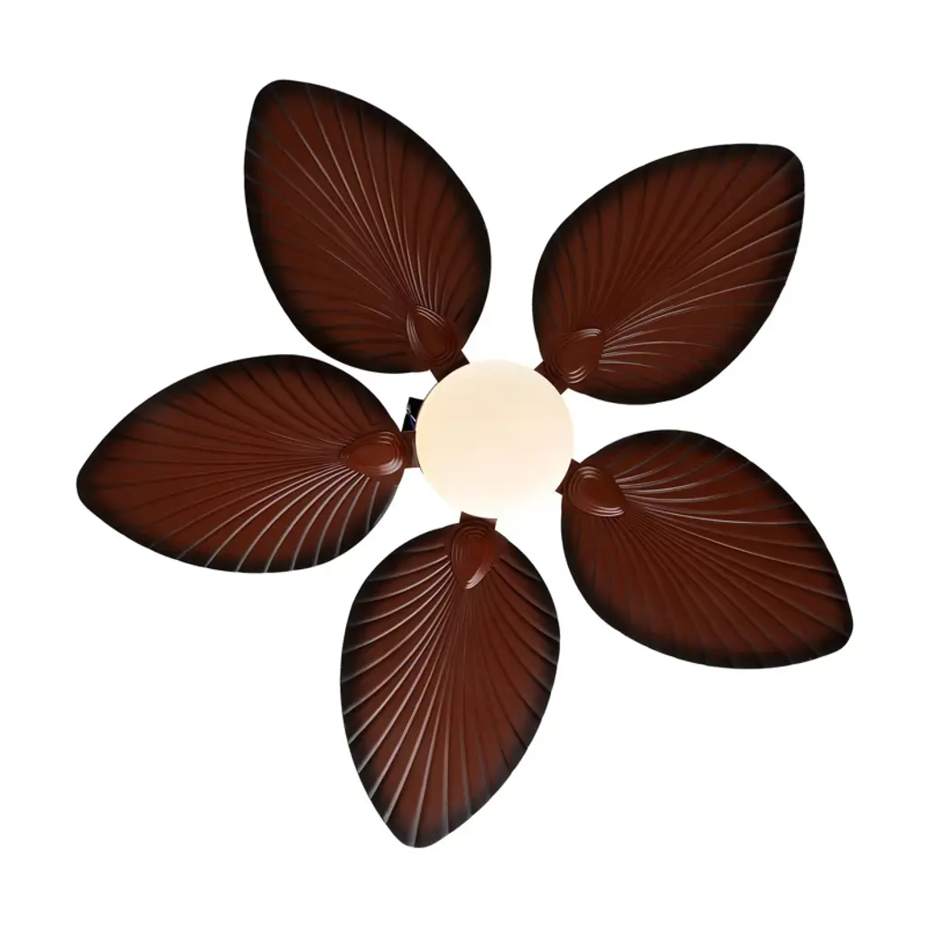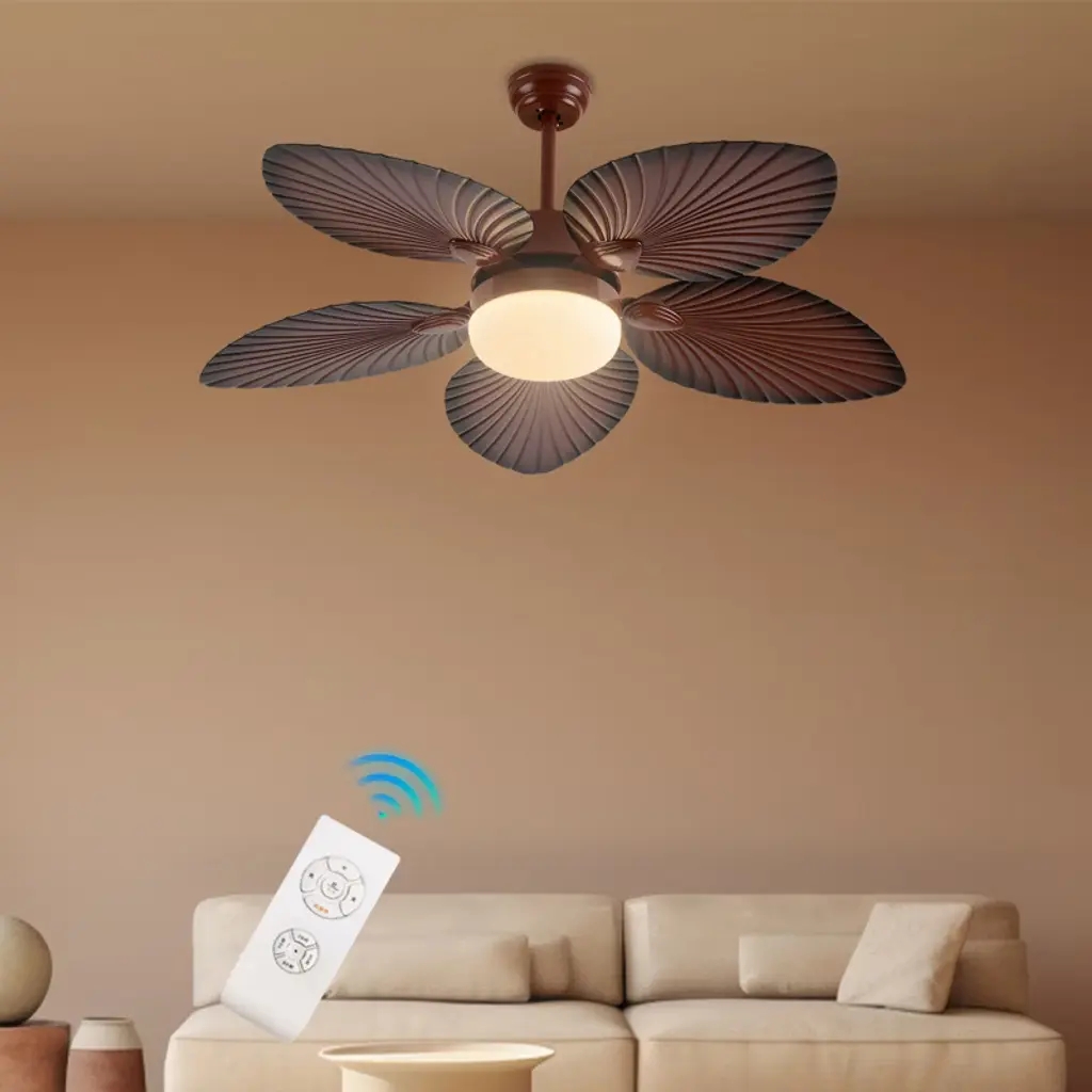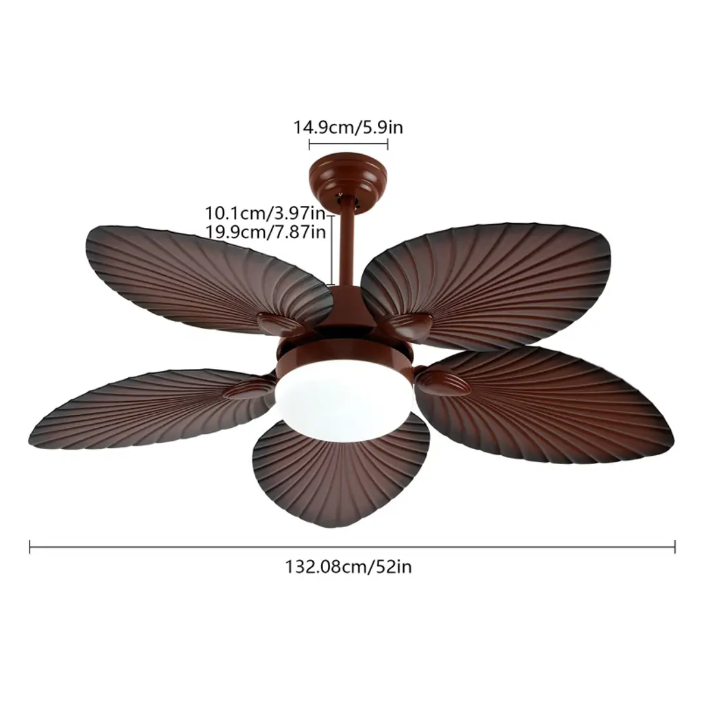 This elegant ceiling fan light features a stunning, leaf-blade design that enhances any home decor. It combines a powerful 6-speed fan with a versatile, energy-saving LED light, offering three color temperatures (3000K-6000K) to create the perfect warm or bright atmosphere. Enjoy year-round comfort with reversible airflow for summer cooling and winter heat circulation. Operated by a convenient remote control, this quiet (<35dB) and durable fixture is an ideal, practical addition to bedrooms, living rooms, and more. Specifications Material: Plastic, Glass, Copper, Iron Process: Baked Paint Color: Brown Style: Modern Efficiency: E Assembly Required: Yes Indoor/Outdoor Usage: Indoor Mounting Type: Ceiling Mounted Control Method: Remote Control(Included), Wall Switch(Not Included) Remote Control Battery Type: 2* AAA Batteries Remote Control Distance: Within 3m/9.84ft Light Color: Warm, White, Neutral Light Source: LED(Included) Color Temperature: 3000K-4500K-6000K Number of Fan Blades: 5 Timing: 1/2/4H Wind Speed Gears: 6 Noise: <35dB Voltage: 110V Light Power: 2*24W Motor Power: 38W Applicable Area: Within 25m²/269.1ft² Base Diameter: 15cm/5.9in Suspension Rod Length: 10cm/3.97in, 20cm/7.87in Product Overall Length: 132.08cm/52in