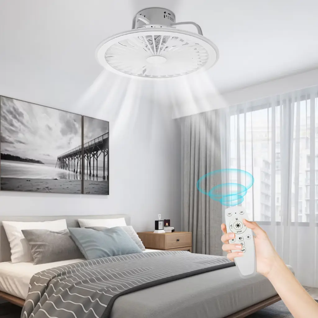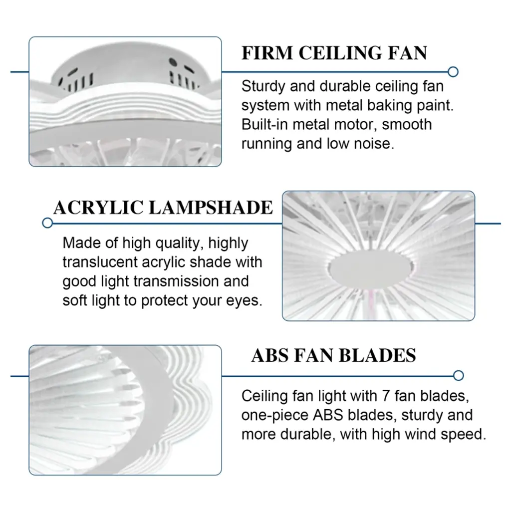 This elegant ceiling fan light combines a flower-shaped, ultra-thin design with powerful functionality, crafted from high-quality acrylic and metal for durability and heat resistance. It features an integrated LED light with adjustable color temperatures and a whisper-quiet, 7-blade fan with three speed settings, all controllable via remote. This space-saving fixture is perfect for adding a touch of modern elegance and comfort to any room, from living areas and bedrooms to dining spaces. Specification Light Source: Led Lighting Board (Include) 3 fan Speed: Low/Medium/High Voltage: 110v Wattage: 36w Applications: 8-25㎡/86.11-269.1ft² Diameter: 50cm/19.6inch Total Height: 18cm/7inch Material: Acrylic Electronic Materials: Steel, Copper Wire Installation 1. This fan needs basic assembly. Professional would be highly recommended. 2. If you have any problems, please feel free to contact us. We will reply and solve the problem for you as soon as possible.