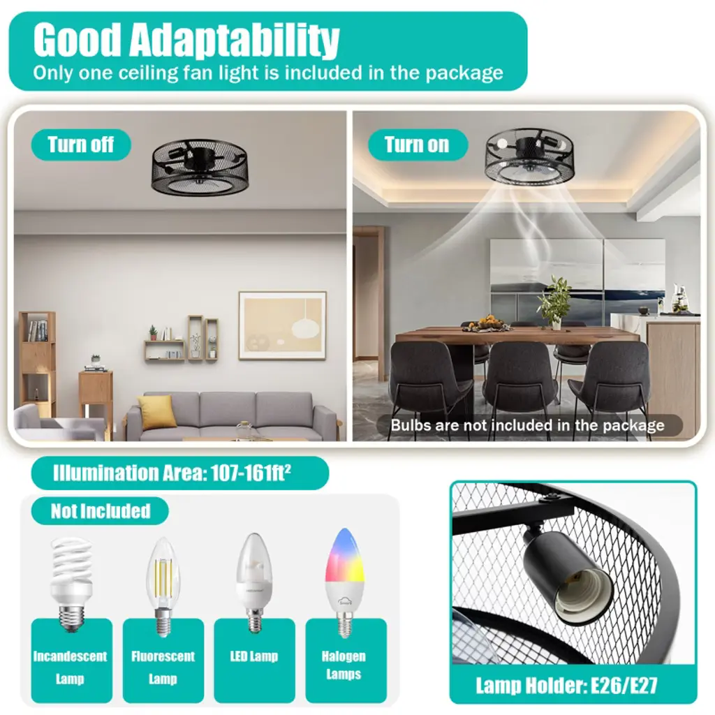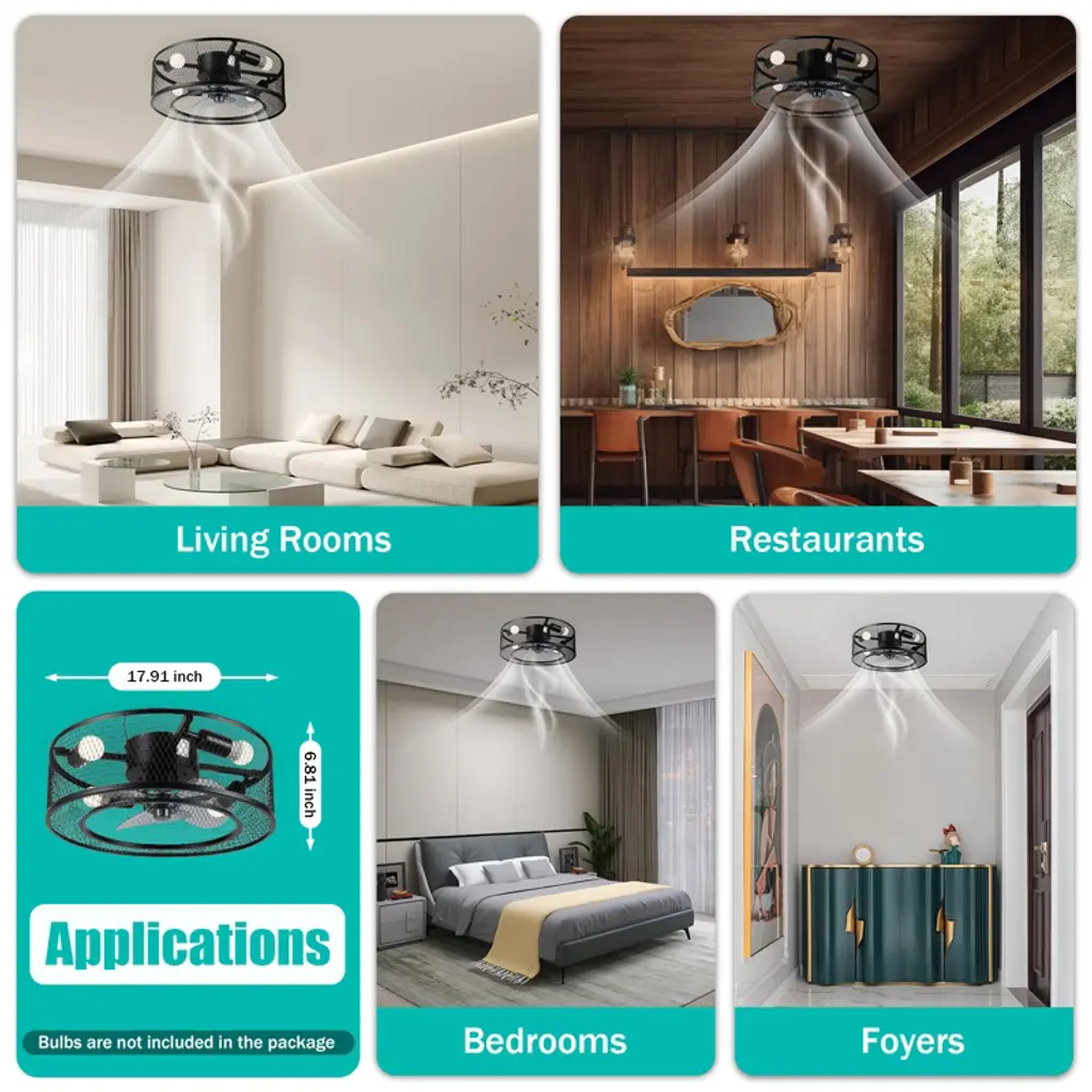 A ceiling fan light is an innovative home decoration that integrates the functions of lighting fixtures and fans. The ceiling-mounted design allows for easy installation, providing both soft lighting effects and cool air circulation for the room. Our product boasts a stylish and elegant appearance, energy efficiency, low noise, remote control, and multiple functions, making it suitable for various home scenarios and an ideal choice for an increasing number of consumers. Specifications Material: Iron, ABS, CopperColor: BlackShape: RoundRemote Control: YesSurface Treatment: Spray PaintInstallation Type: Ceiling Mount; Wall MountIndoor/Outdoor Usage: IndoorPlug: US StandardPower Source: Corded ElectricControl Method: Wall Switch (Not Included), RemoteLamp Holder: E26/E27 Timing: 1/2/4/8hWind Speed: Low, Medium, HighNoise: 30dBNumber of Bulbs: 4 (Not Included)Voltage: 110VMax Fan Power: 40WSingle Bulb Max Power: 40W Remote Control Distance: 3-5m/9.8-16.4ftIllumination Area: 10-15㎡/107-161ft²Wind Area: 10-15㎡/107-161ft²Suggested Installation Height: 2.5-3.5m/8.2-11.5ftCeiling Plate Size (D*H): 15.6*6.6cm/6.14*2.59inchProduct Size(D*H): 45.5*17.3cm/17.91*6.81inch