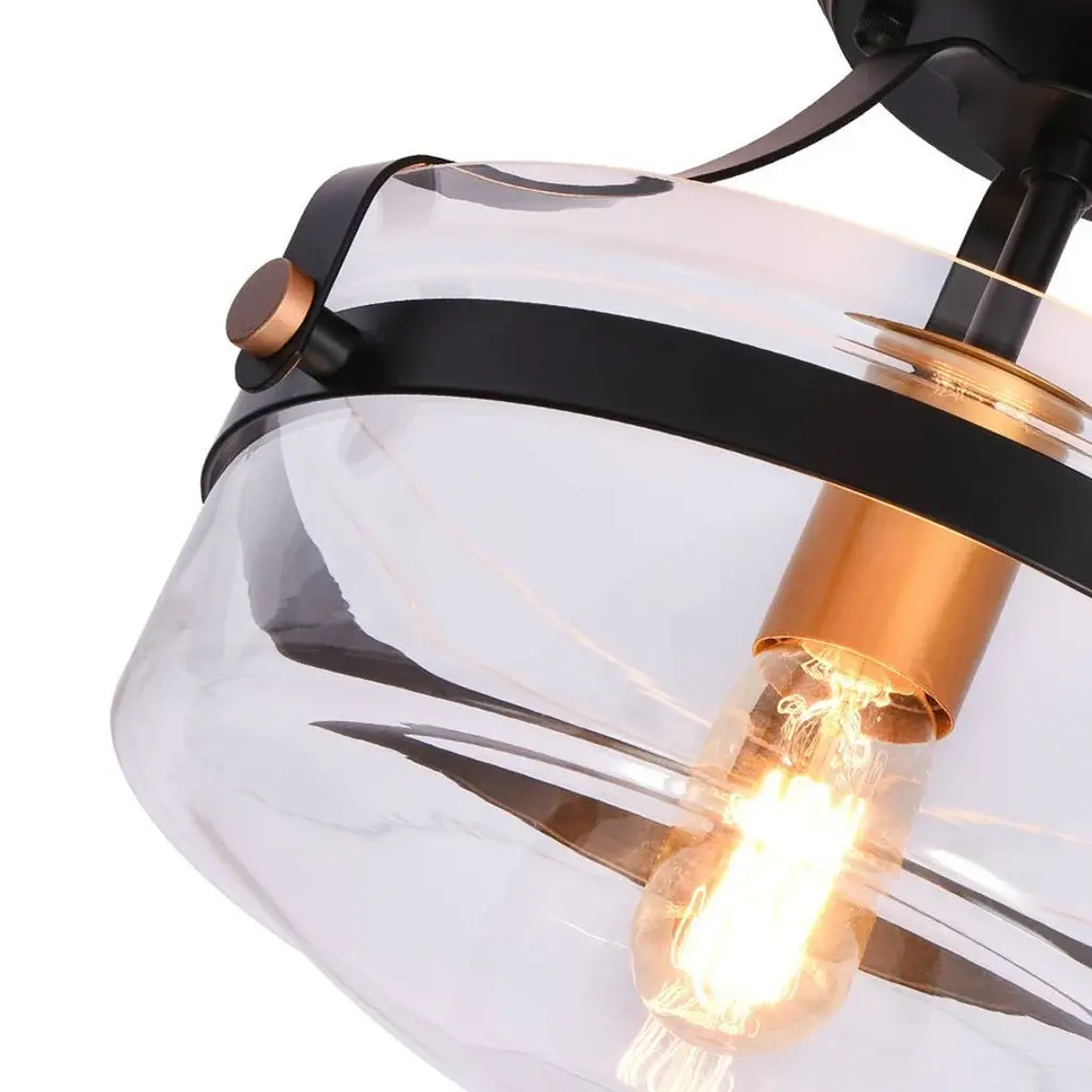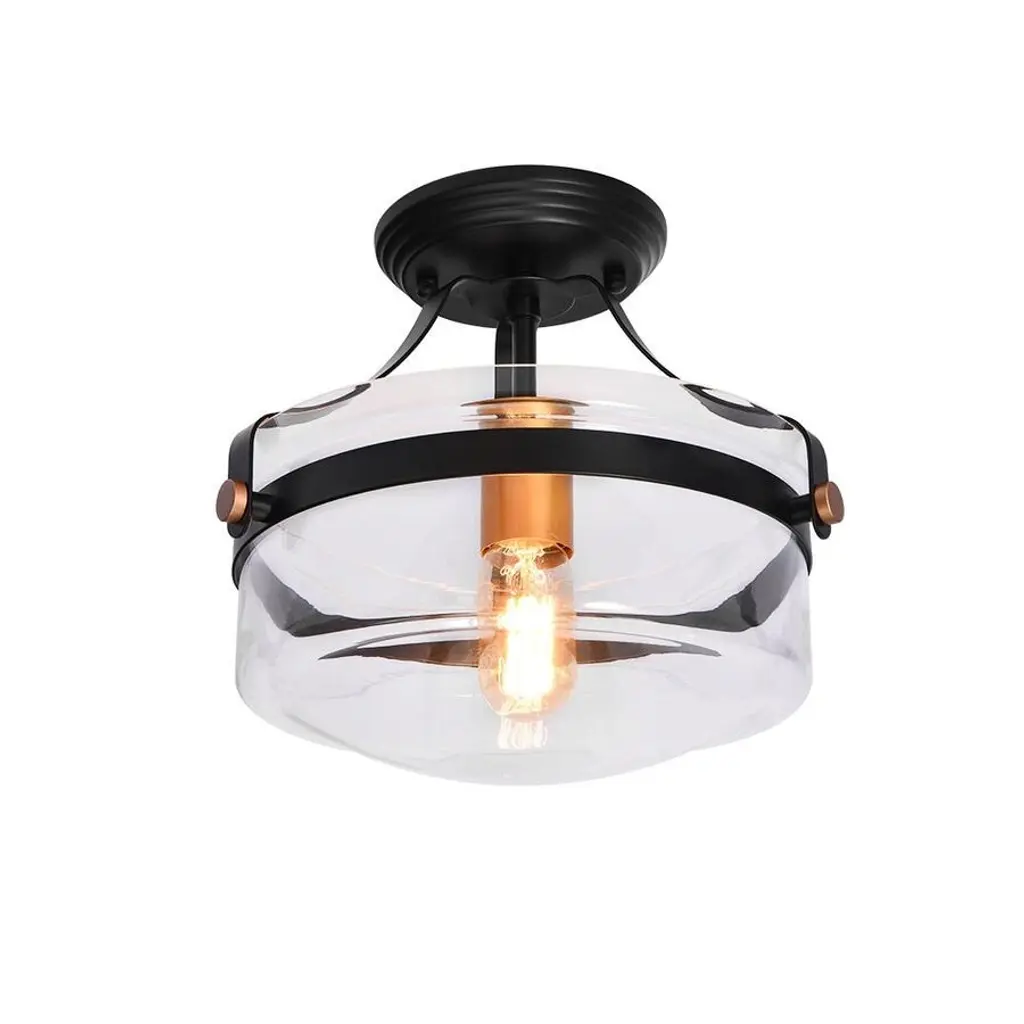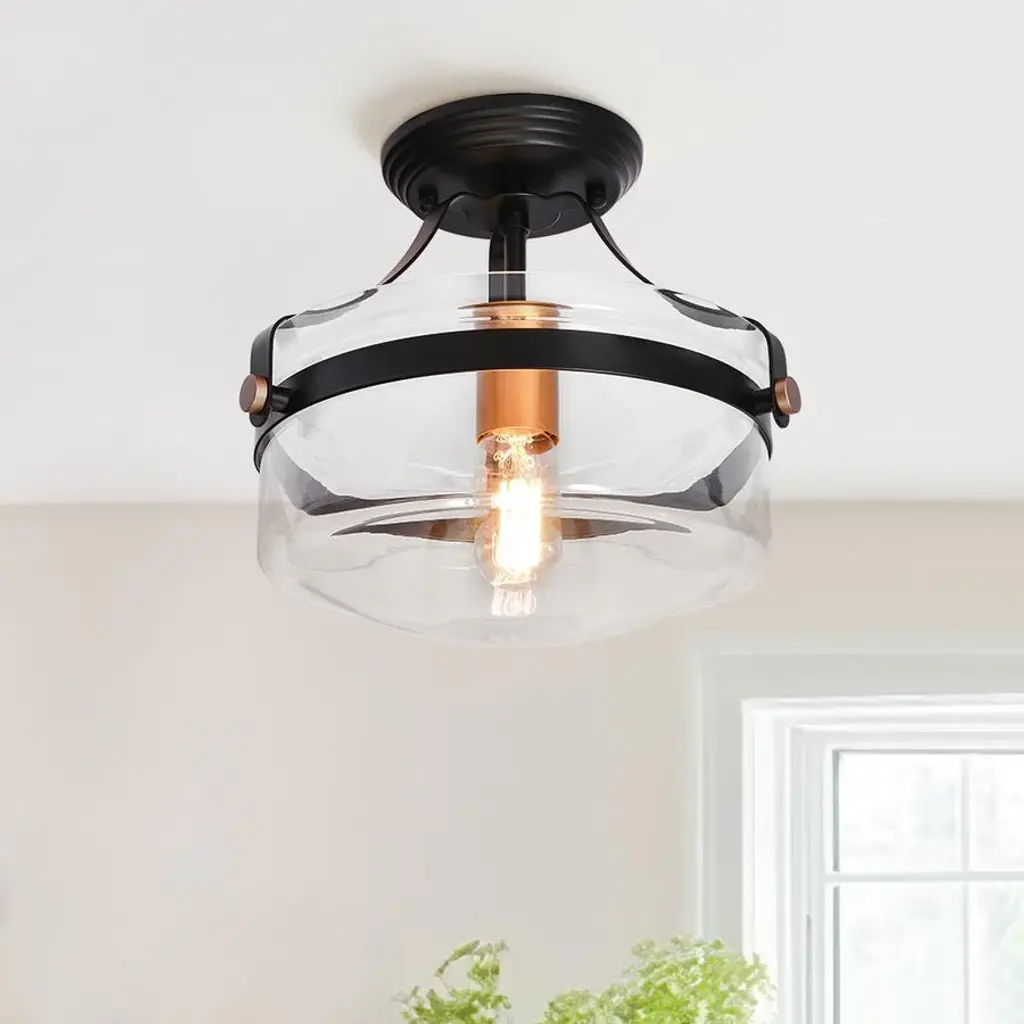1-Light Round Glass Semi Flush Ceiling Light - 11" Black Farmhouse - Black
