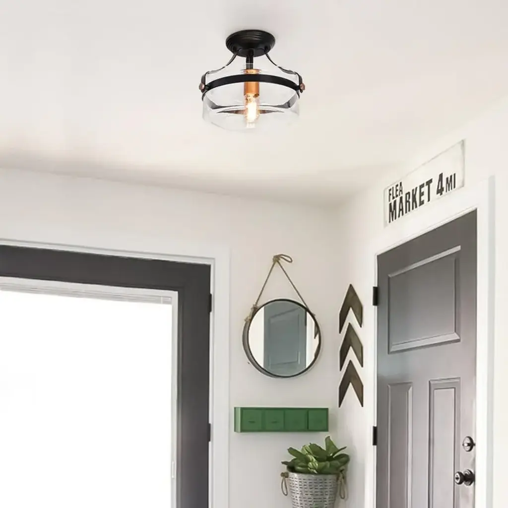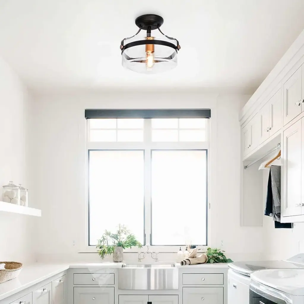 Simple but trendy in the look, this round glass ceiling light easily goes into any style decor. This 1-light semi flush mount features three arms with a circular bar holding a clear glass shade. Inside the drum glass shade, there is one E26-base bulb (excluded) to deliver task lighting. We recommend mounting the round glass semi flush ceiling light to brighten your kitchen, entry, bedroom, laundry, or bathroom.