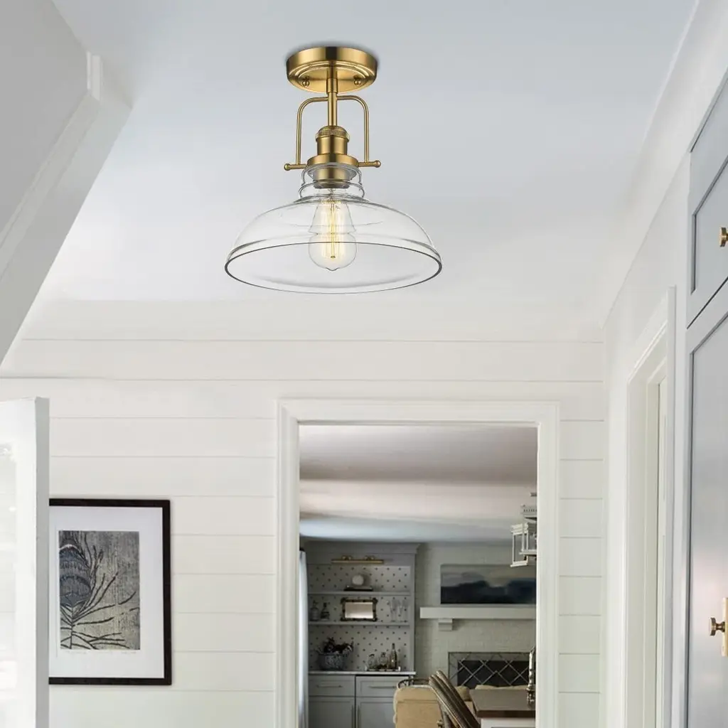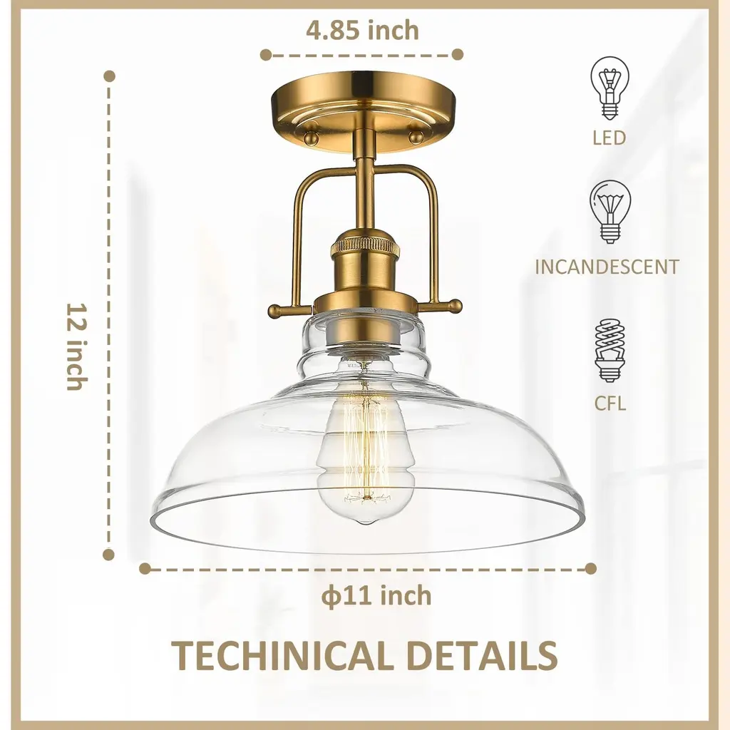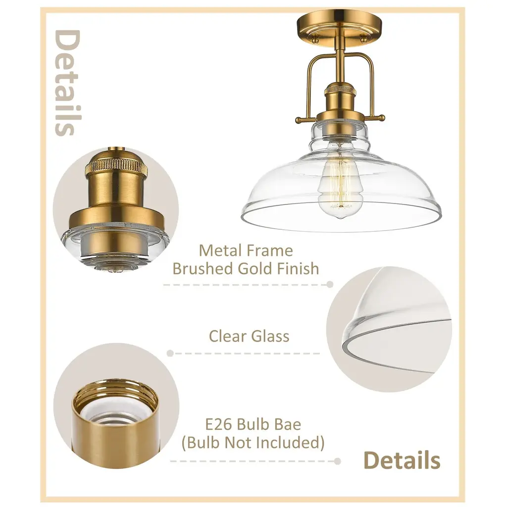 The semi flush ceiling light features a unique clear glass shade and vintage style oil rubbed bronze/Brushed Gold metal base, bringing a modern twist to its avant-garde retro design. It is time to breathe new life into the mundane every-day with a refreshed lighting design. Make your purchase today to begin your journey to a whole new lighting experience.Features