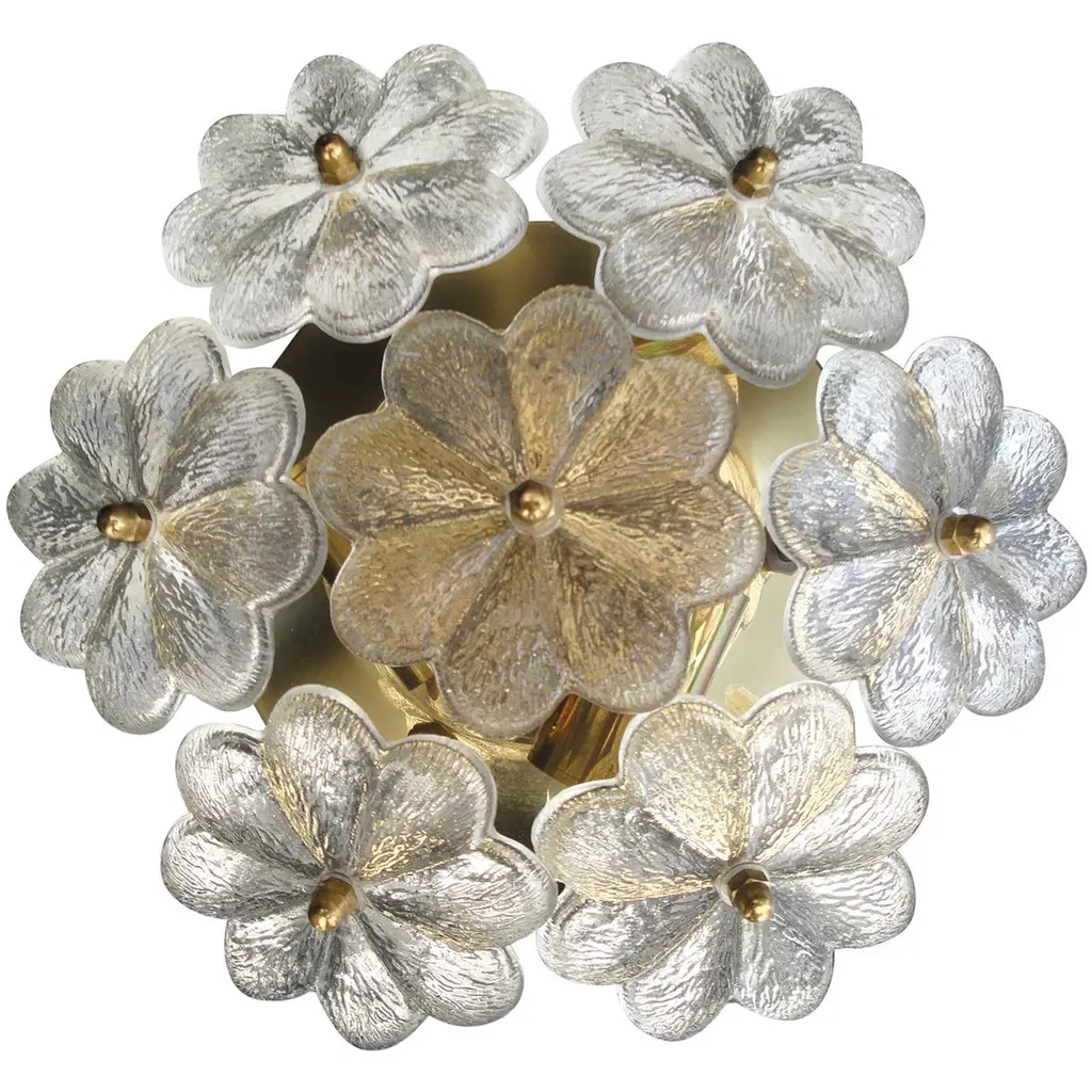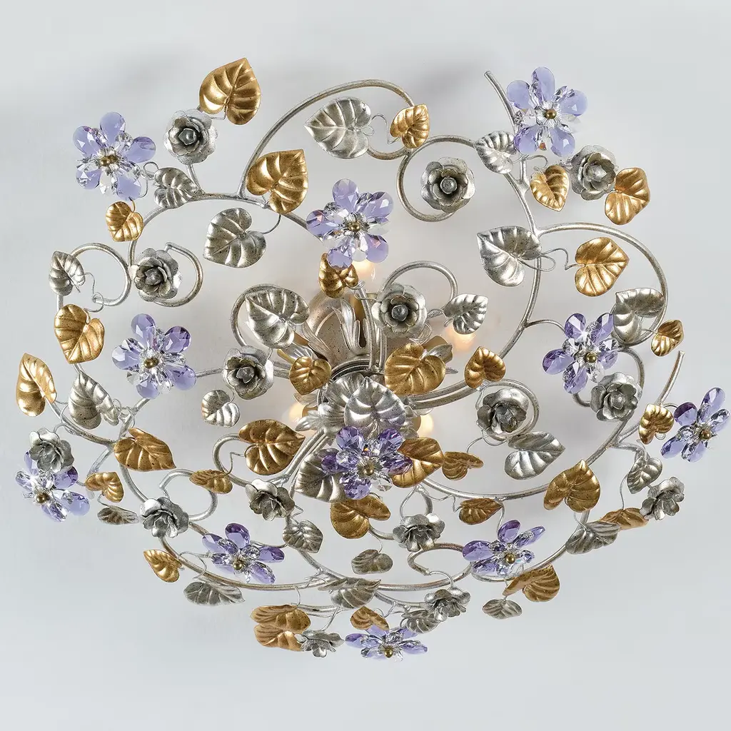 Delightfully elaborate and ornate, this stunning 5 Light Ceiling Lamp is beautifully crafted in metal and decorated with splendid antique silver and gold leaf detail. The exquisite flowers in a two-tone lilac crystal are the perfect complimenting elements to the precious metal work and add a touch of finesse to this stylish accessory.