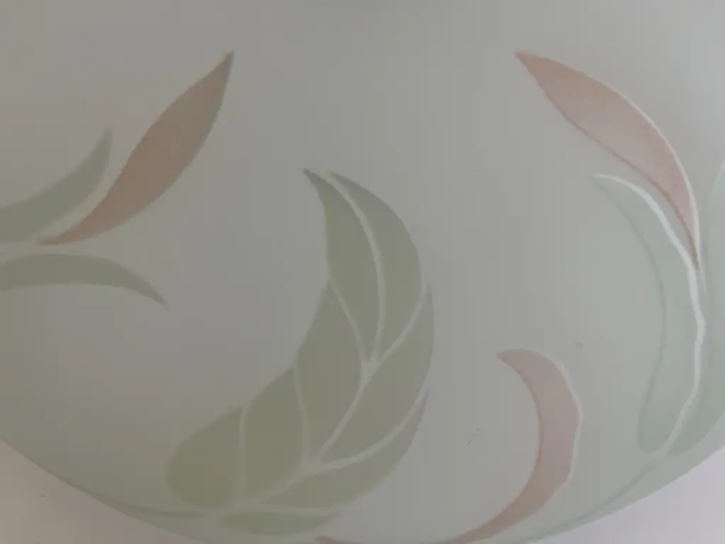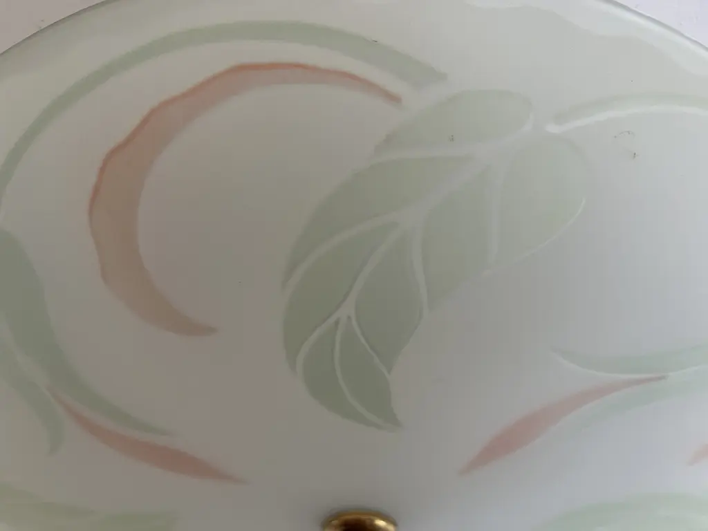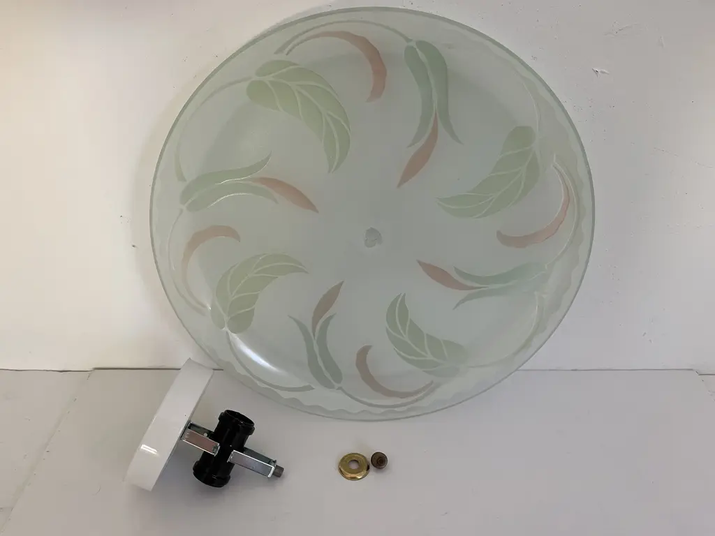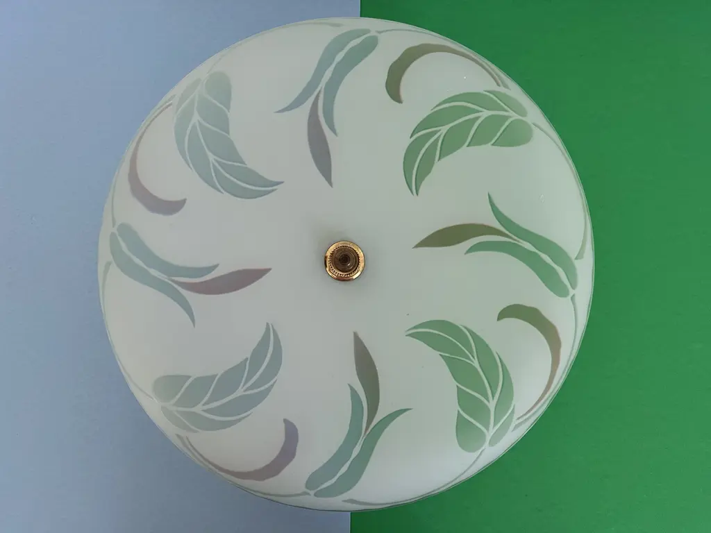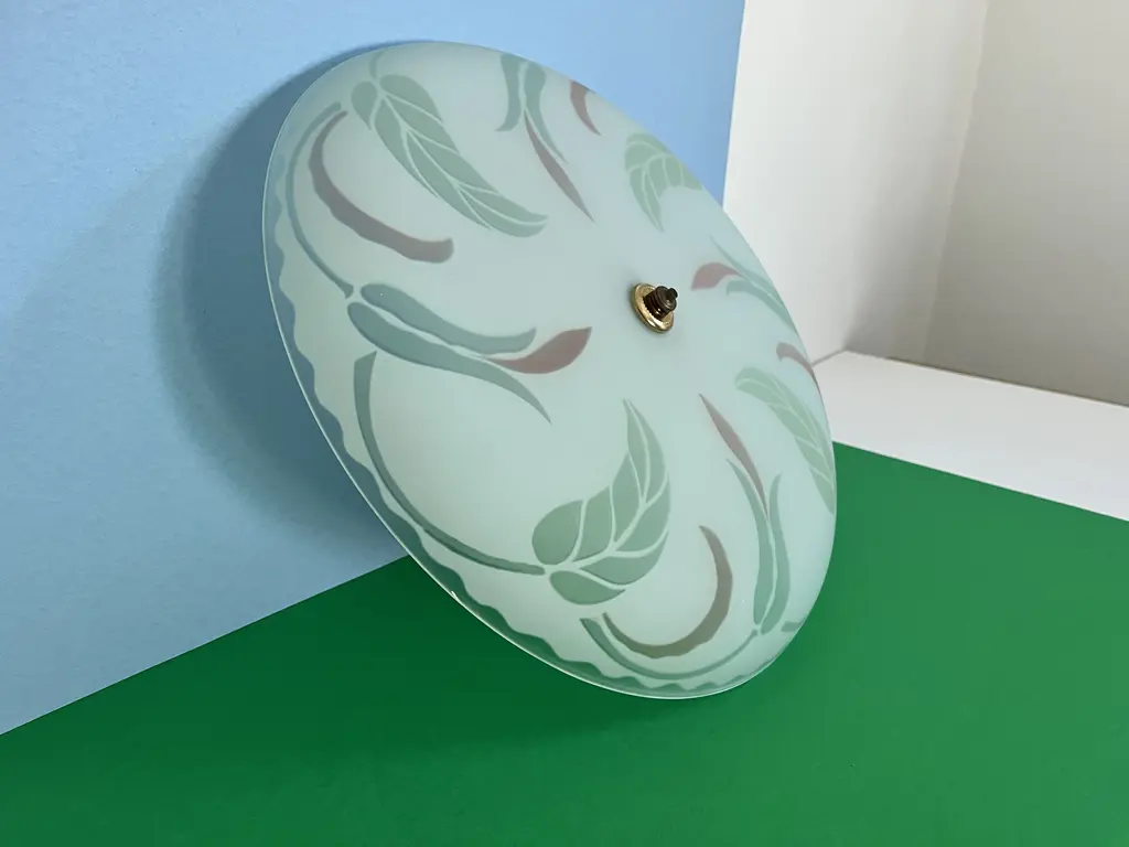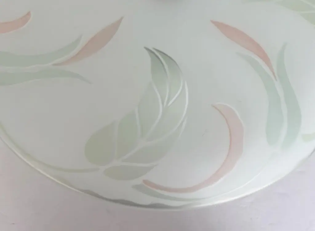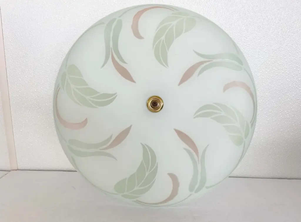 Large 1940s semi flush mount ceiling light featuring a disc-style frosted and reverse painted glass shade with swirling green leaves, coppery pink flowers and scalloped transparent border with two lights. New wiring and new sockets for standard bulbs. Comes ready to install with white metal mounting plate and hardware. Edge chip, patina.