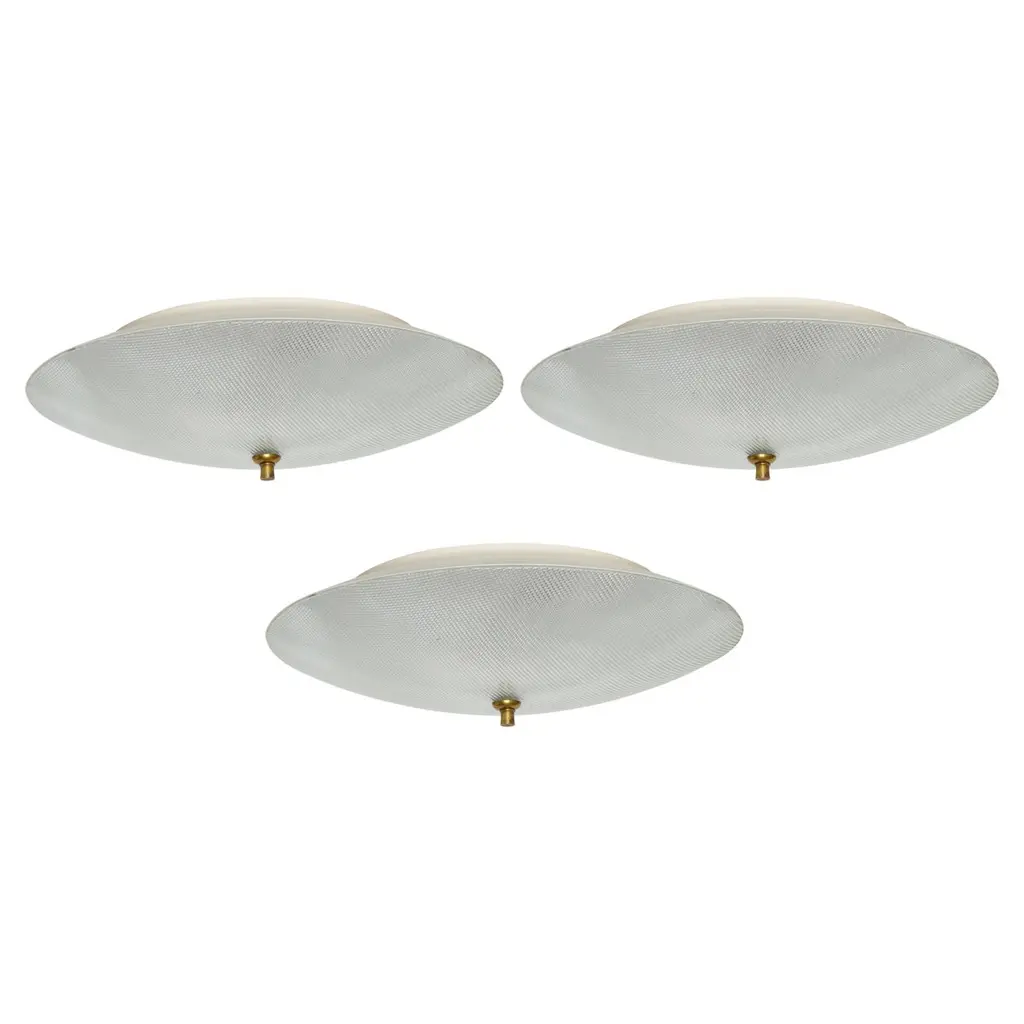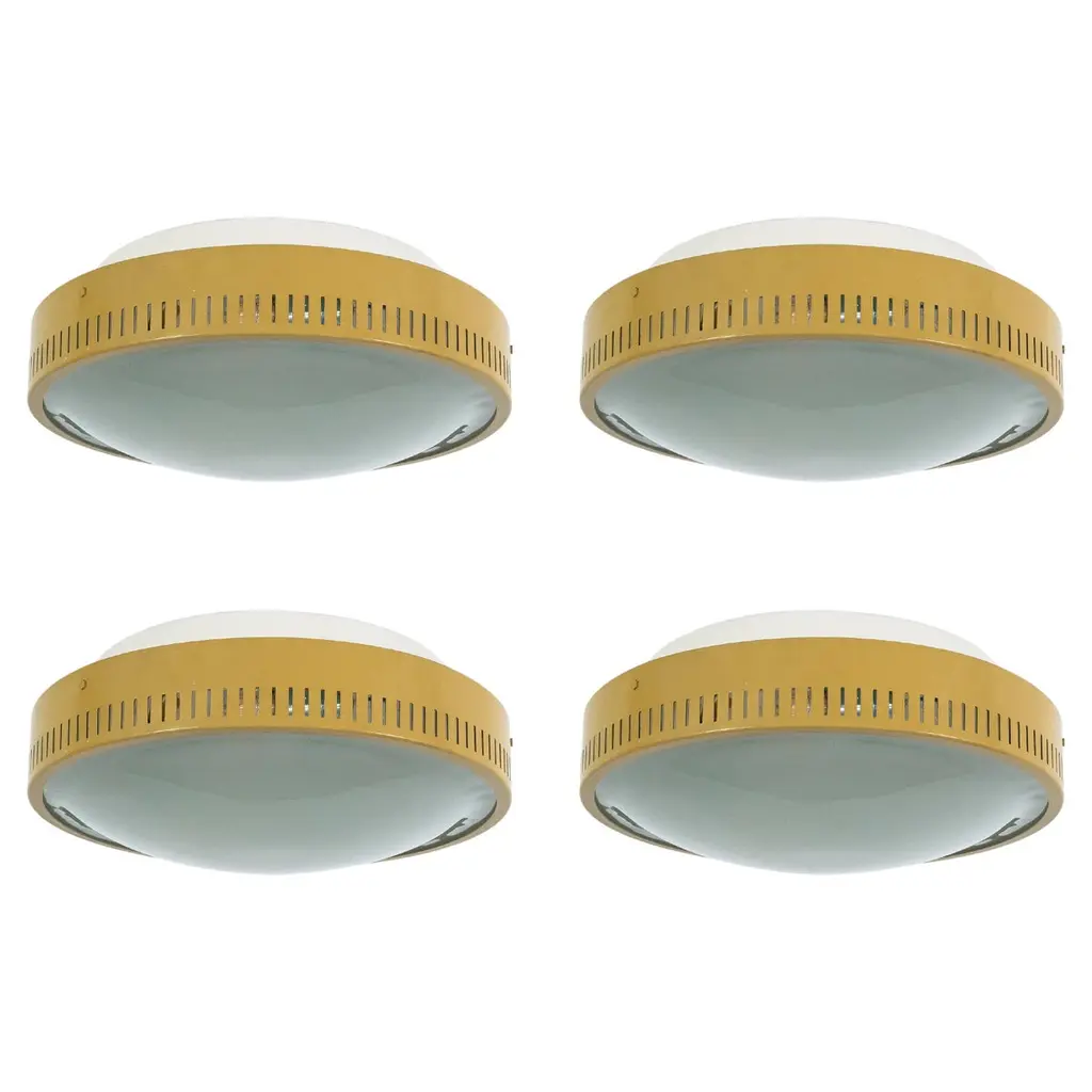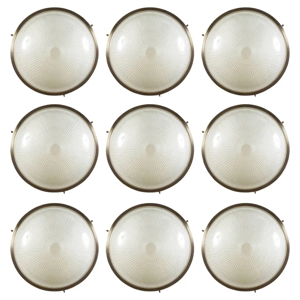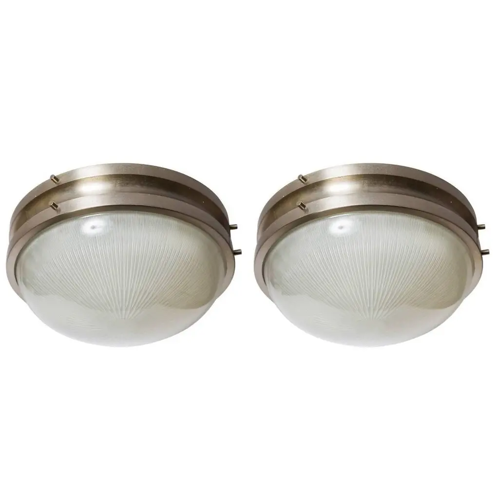 1960s Sergio Mazza 'Sigma' wall or ceiling light for Artemide, 1960s. Executed in nickeled brass and pressed opaline glass by Sergio Mazza for Artemide, Italy, circa 1960s. Each light has been professionally rewired for US electrical and accommodates two standard e27 60 watt max bulbs.Price is per item. Four lamps available.Born in Italy in 1931, Sergio Mazza created numerous iconic designs for Artemide throughout the 1960s, from a range of lighting to fiberglass molded seating and other home furnishings which due to their limited production runs have become highly collectible with their clean lines and intuitive utility.Not UL listed, but recommended UL listing possible from authorized 3rd party vendor upon request for an additional fee. Please note that only one representative example of these lamps is featured in the photos. Patina and wear vary some from lamp to lamp.