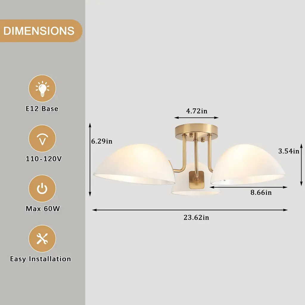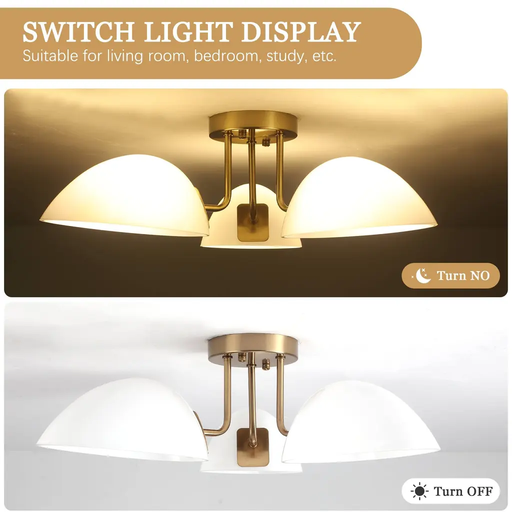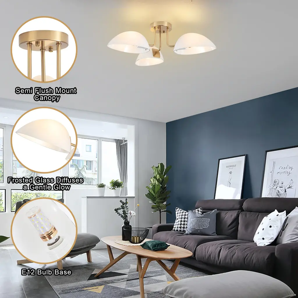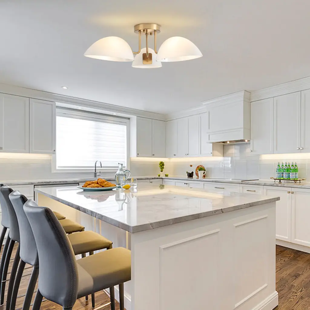 This ceiling light features three light bulbs set in sleek, milk white glass shades, offering a minimalist yet contemporary look. Its semi-flush mount design means the fixture is mounted just slightly below the ceiling, perfect for spaces with lower ceilings or where you want a light that is unobtrusive but still makes a statement. The frosted glass shades provide a gentle, diffused glow, reducing harsh glare and creating a warm, inviting atmosphere.Features: