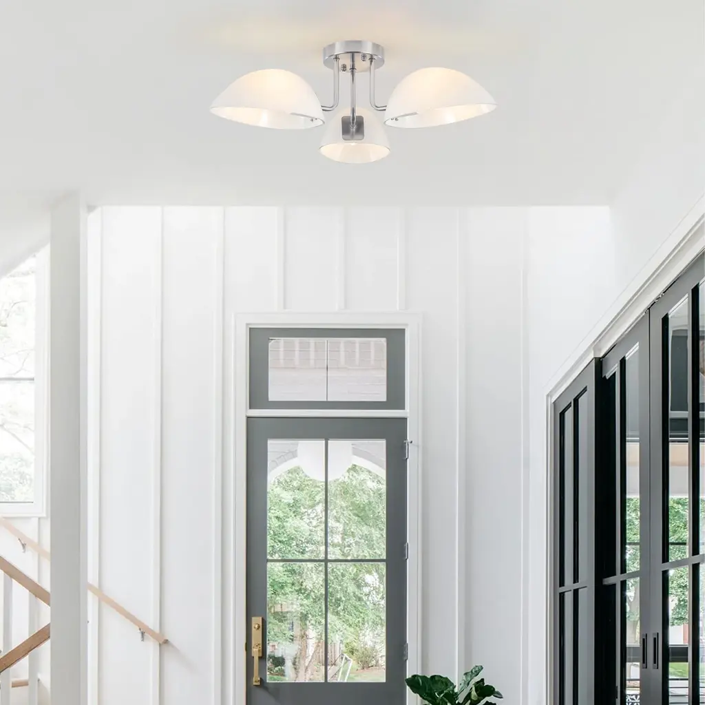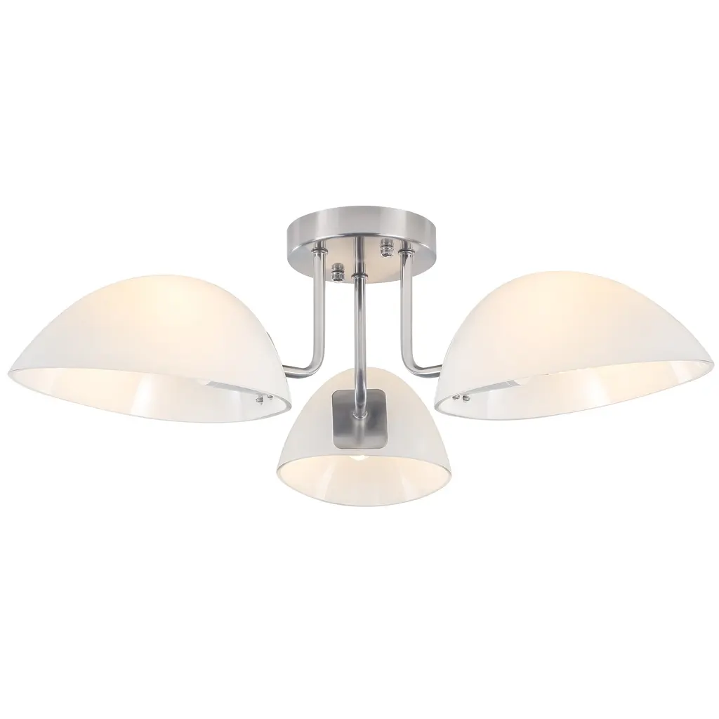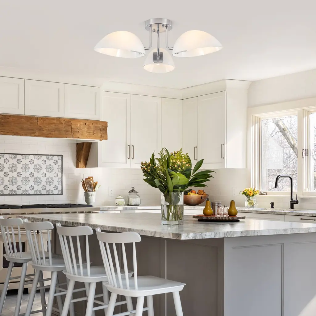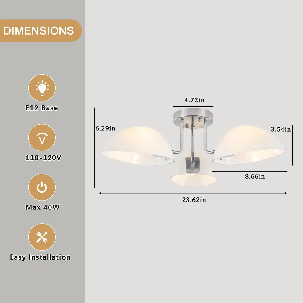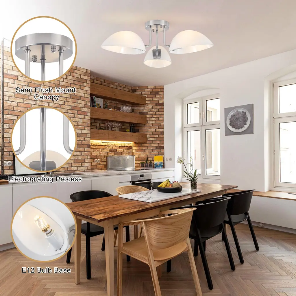This ceiling light features three light bulbs set in sleek, milk white glass shades, offering a minimalist yet contemporary look. Its semi-flush mount design means the fixture is mounted just slightly below the ceiling, perfect for spaces with lower ceilings or where you want a light that is unobtrusive but still makes a statement. The frosted glass shades provide a gentle, diffused glow, reducing harsh glare and creating a warm, inviting atmosphere.Features: