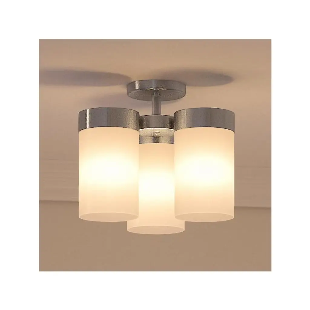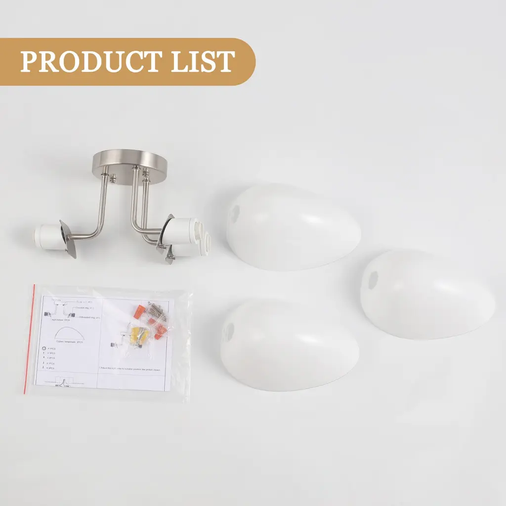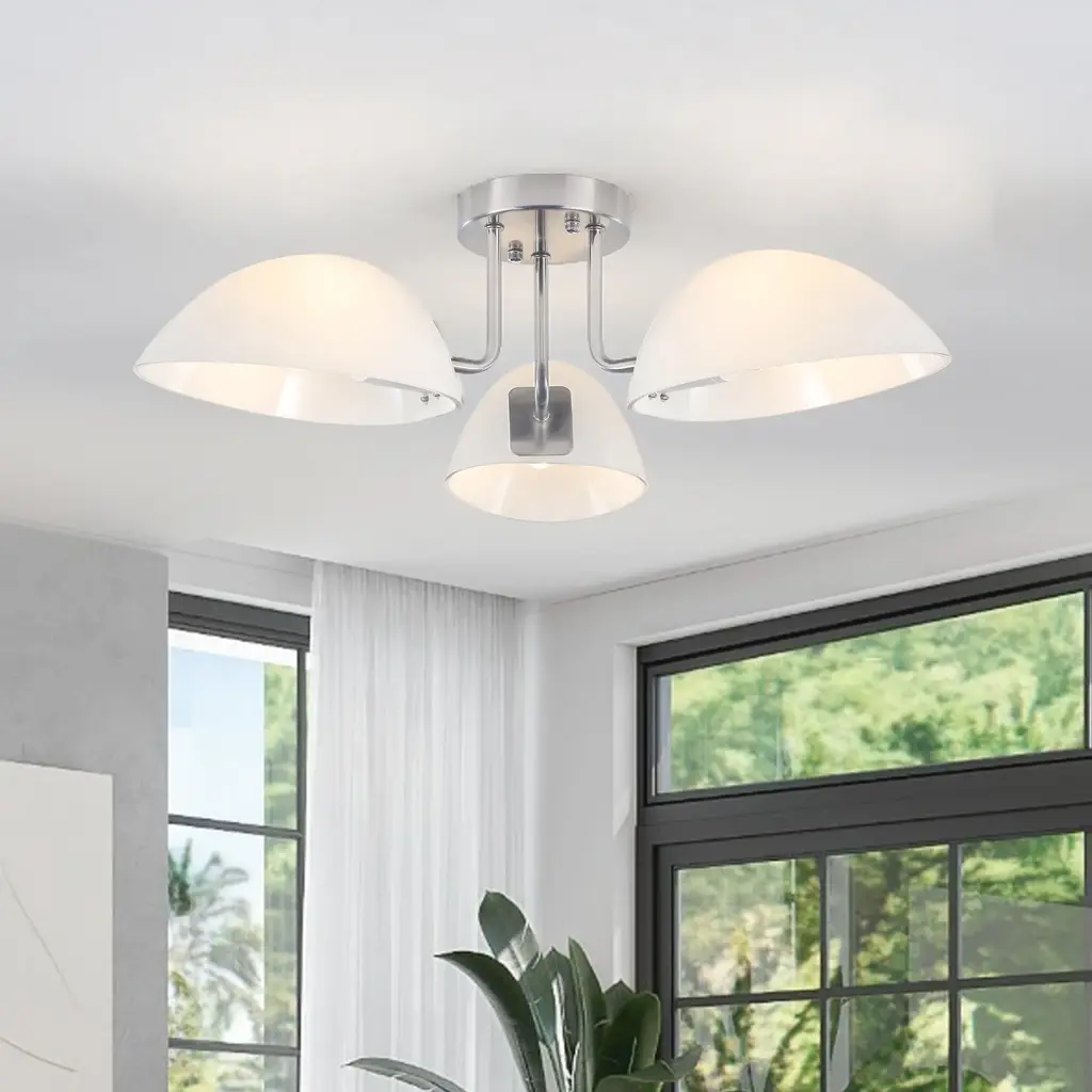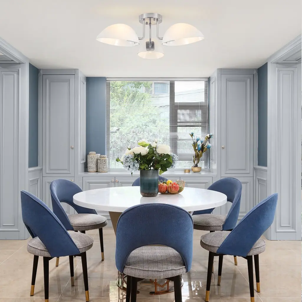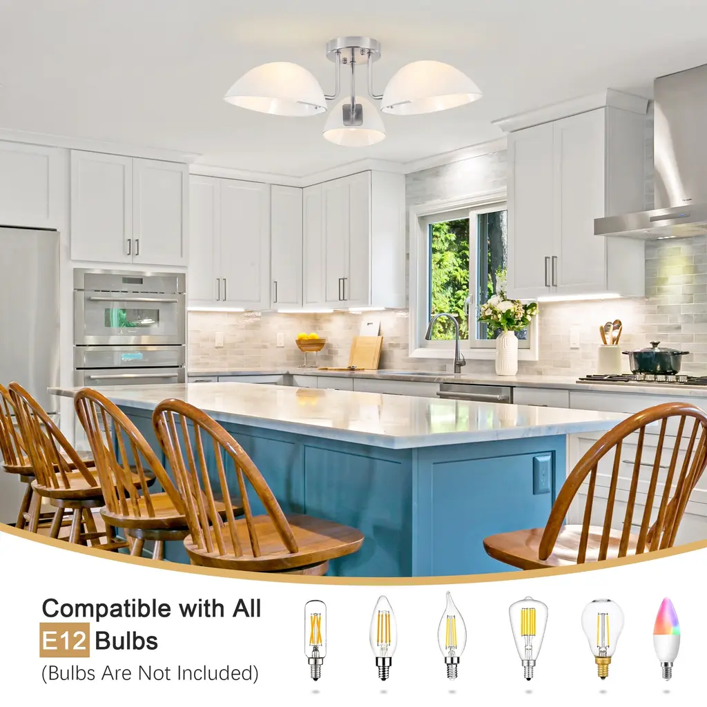 This ceiling light features three light bulbs set in sleek, milk white glass shades, offering a minimalist yet contemporary look. Its semi-flush mount design means the fixture is mounted just slightly below the ceiling, perfect for spaces with lower ceilings or where you want a light that is unobtrusive but still makes a statement. The frosted glass shades provide a gentle, diffused glow, reducing harsh glare and creating a warm, inviting atmosphere.Features: