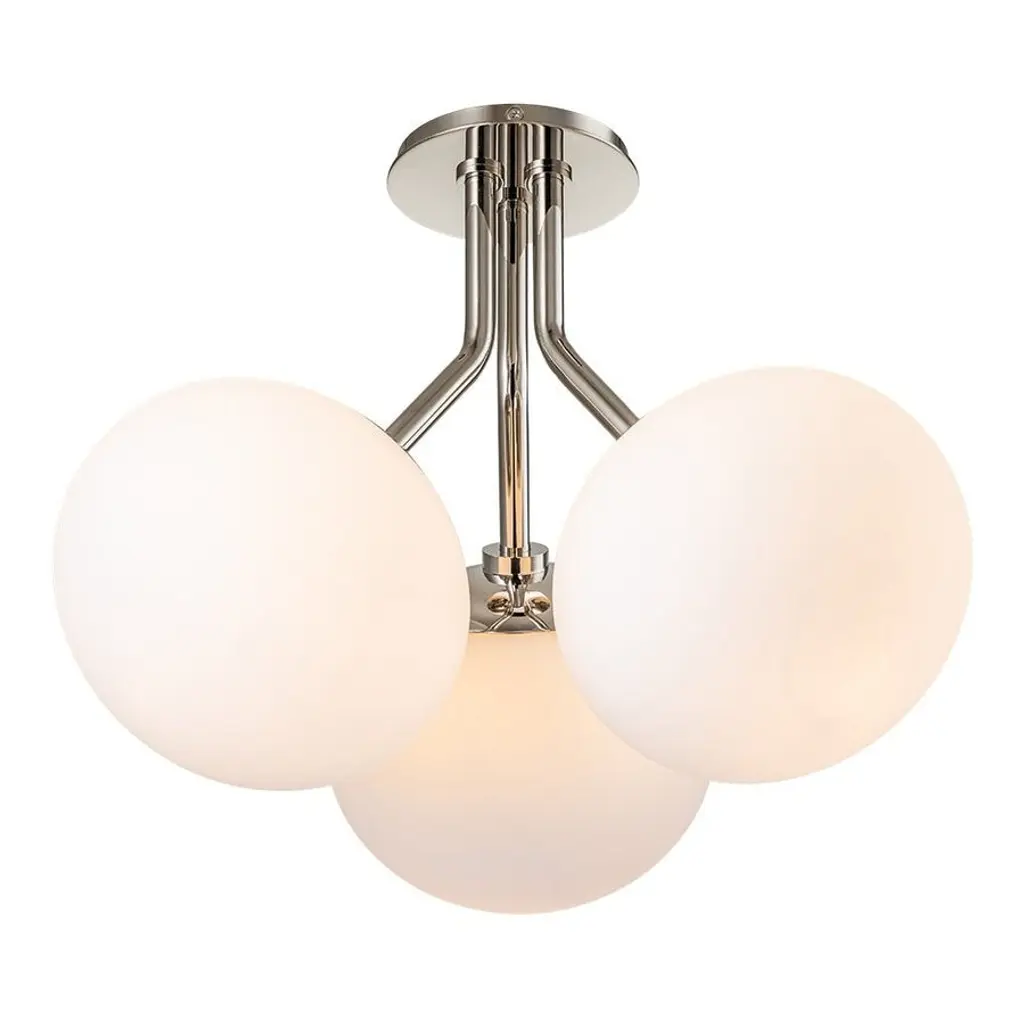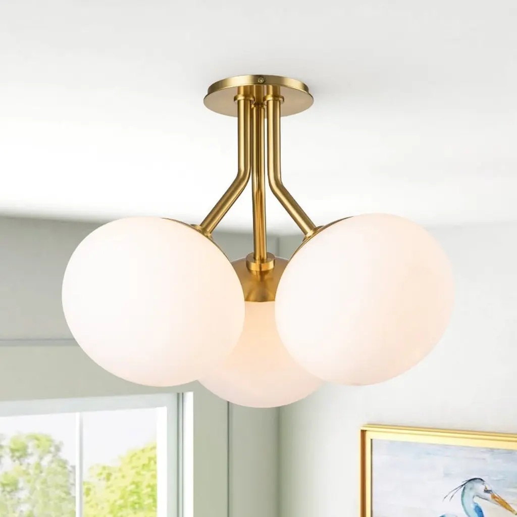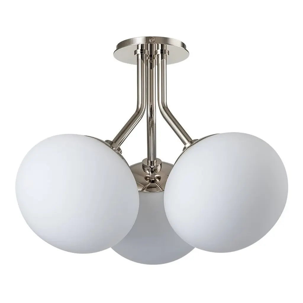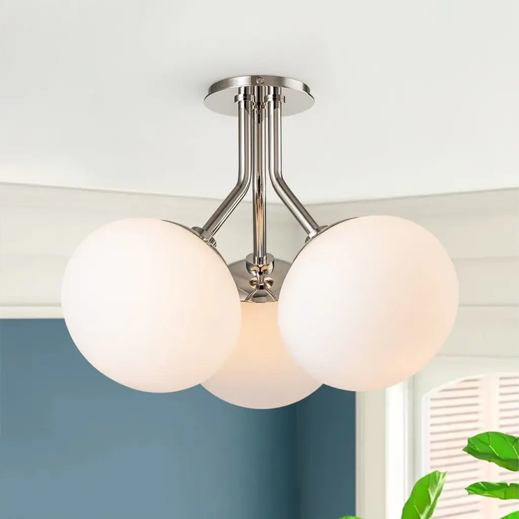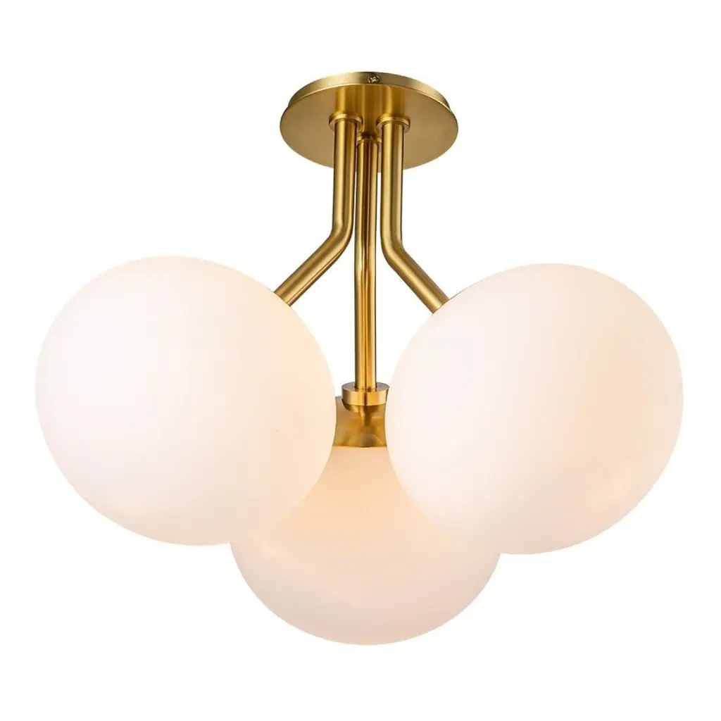 Glide through the world of mid-century modern elegance with this luxurious 3-light glass globe semi flush mount. Boasting a brass or nickel finish, three gracefully curved arms entwine three opal glass globes, creating an enchanting simple bubble silhouette radiating cozy and chic ambient lighting. This graceful glass globe bubble ceiling light is a delightful addition to any entryway, dining room, living space, kitchen, or bedroom.Features:Specification: