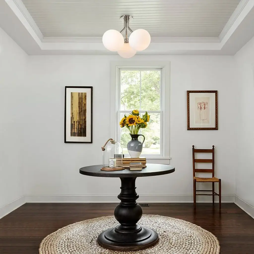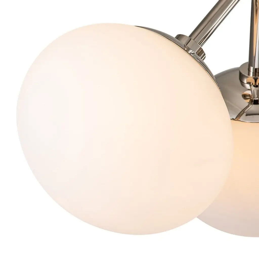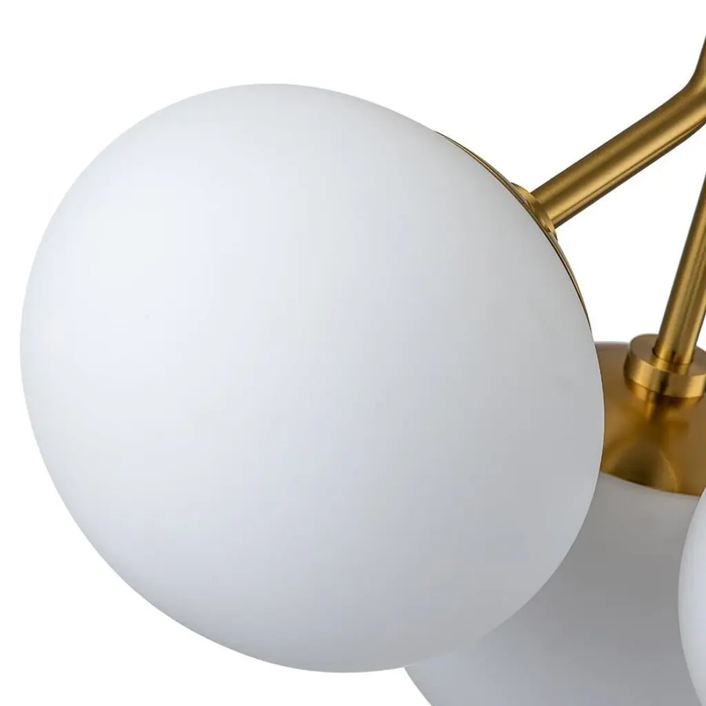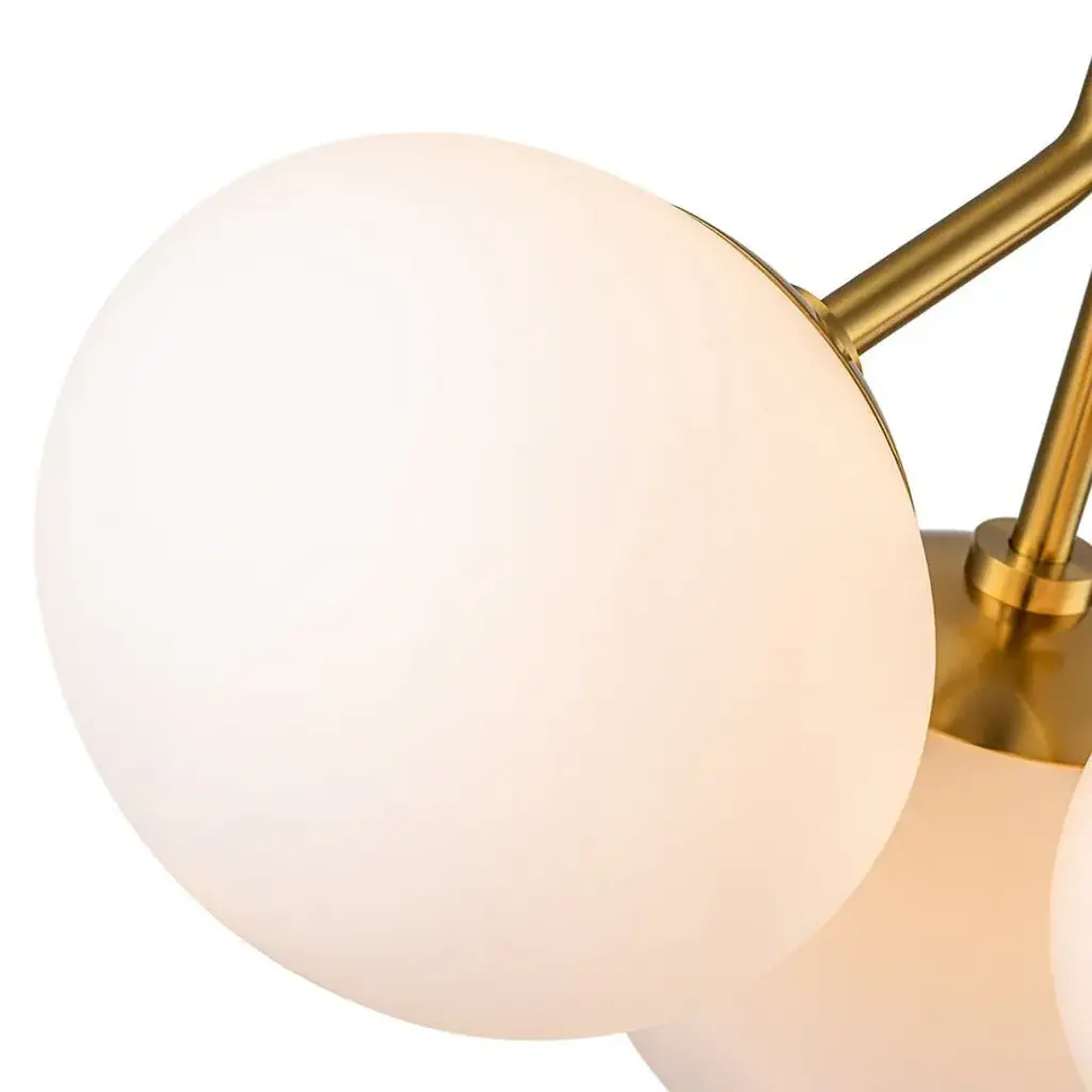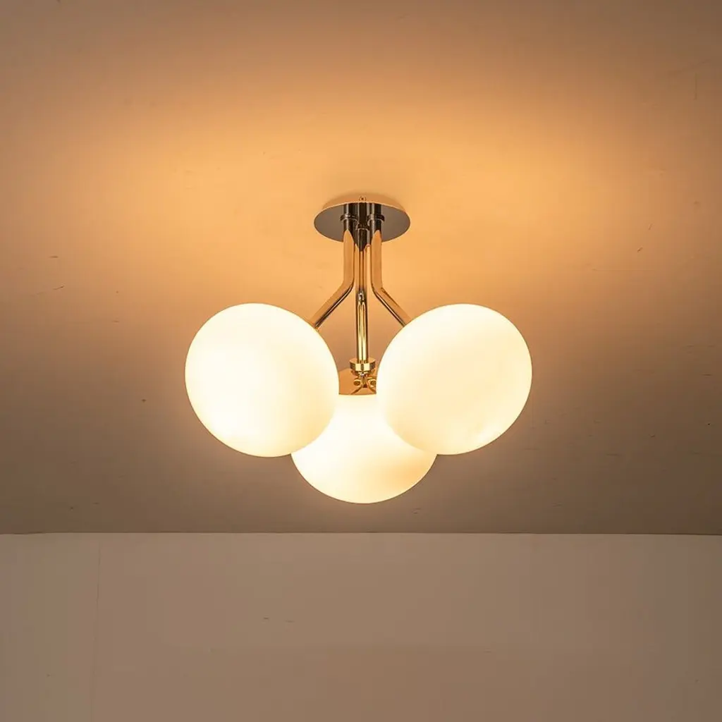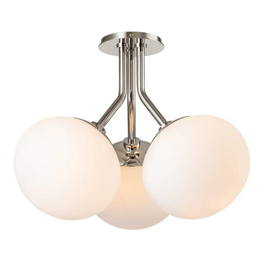 Glide through the world of mid-century modern elegance with this luxurious 3-light glass globe semi flush mount. Boasting a brass or nickel finish, three gracefully curved arms entwine three opal glass globes, creating an enchanting simple bubble silhouette radiating cozy and chic ambient lighting. This graceful glass globe bubble ceiling light is a delightful addition to any entryway, dining room, living space, kitchen, or bedroom.Features:Specification: