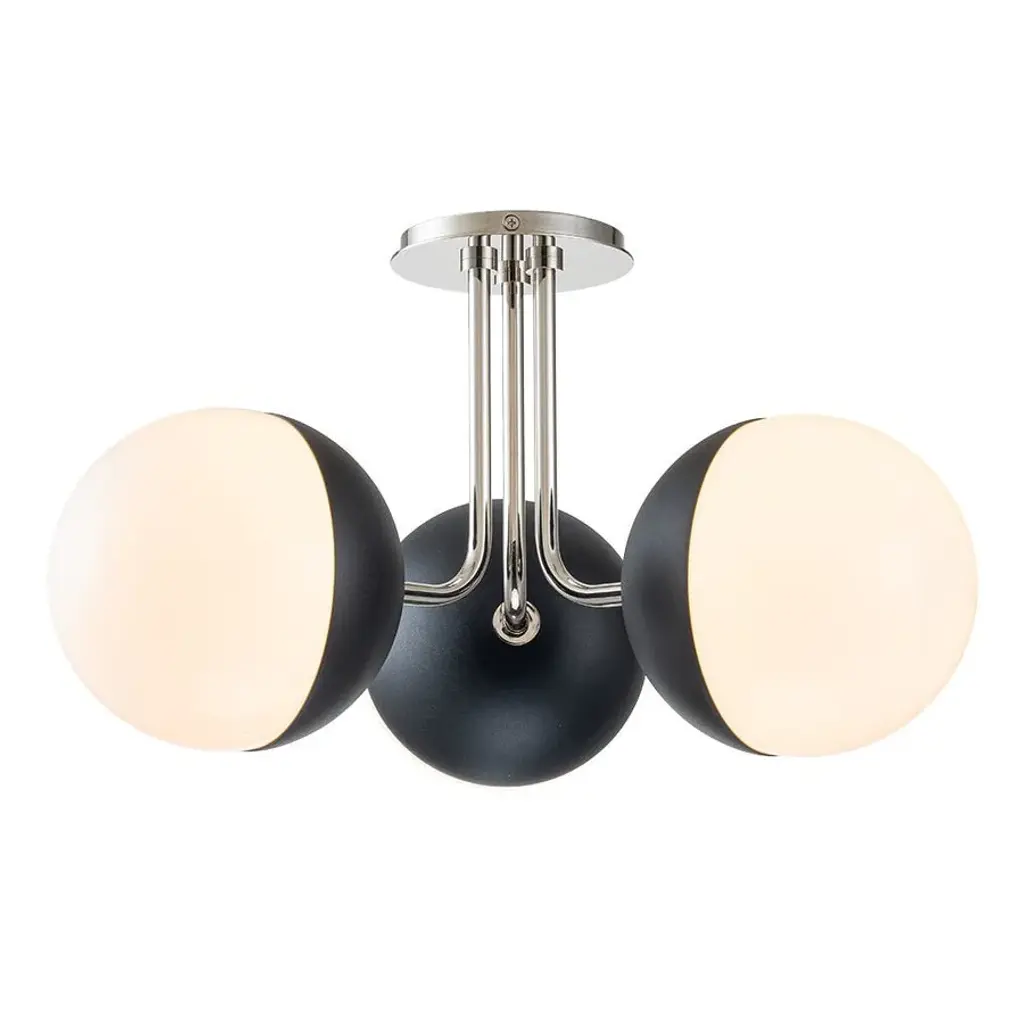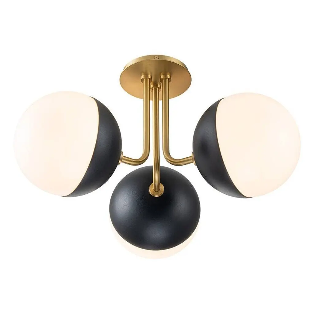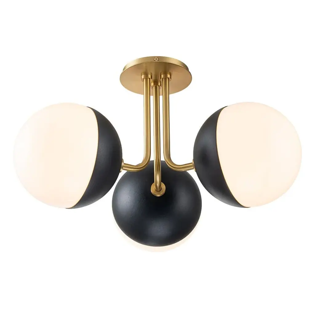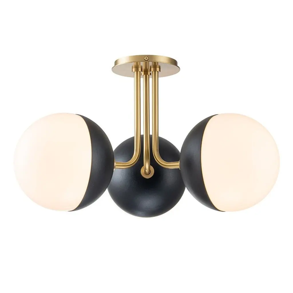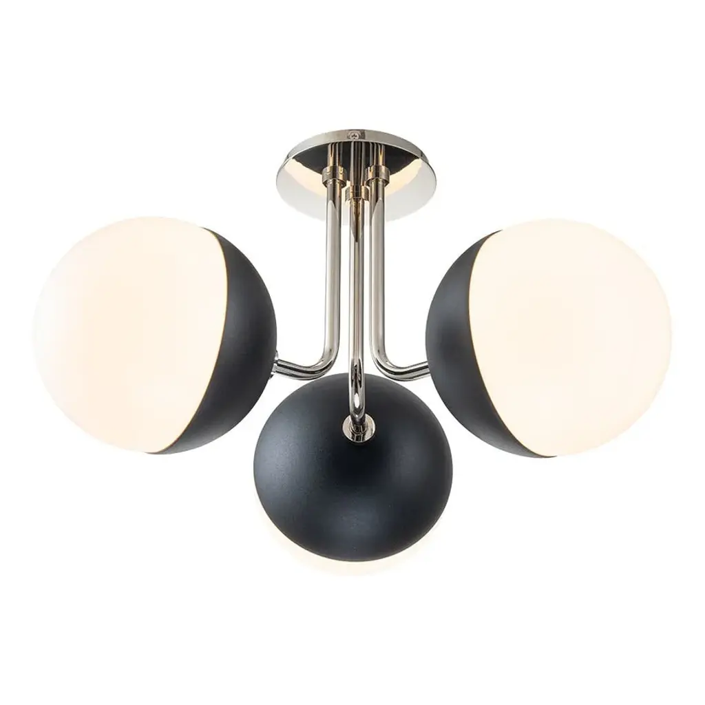 Bring a timelessly chic aesthetic to your home with this opal glass globe sputnik ceiling light. Three spherical shades with black domes are supported by curved arms finished in luxury brass or nickel, providing a warm and inviting glow to your entryway, bedroom, dining room, living area, or bathroom. With its sophisticated silhouette and opal white glass globes, this mid-century modern 3-light sputnik globe semi flush mount lighting is sure to amuse the eye and provide chic elegance to your decor.Features:Specification: