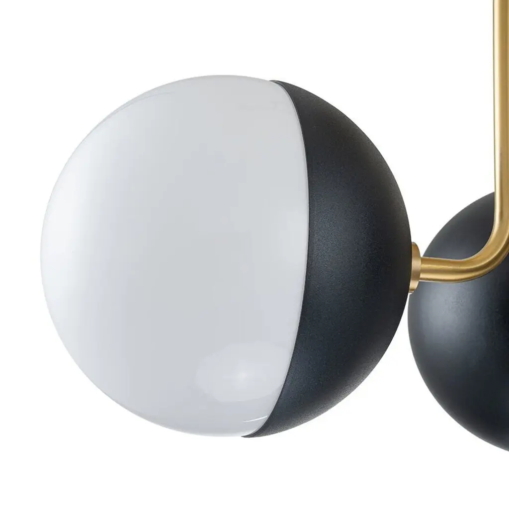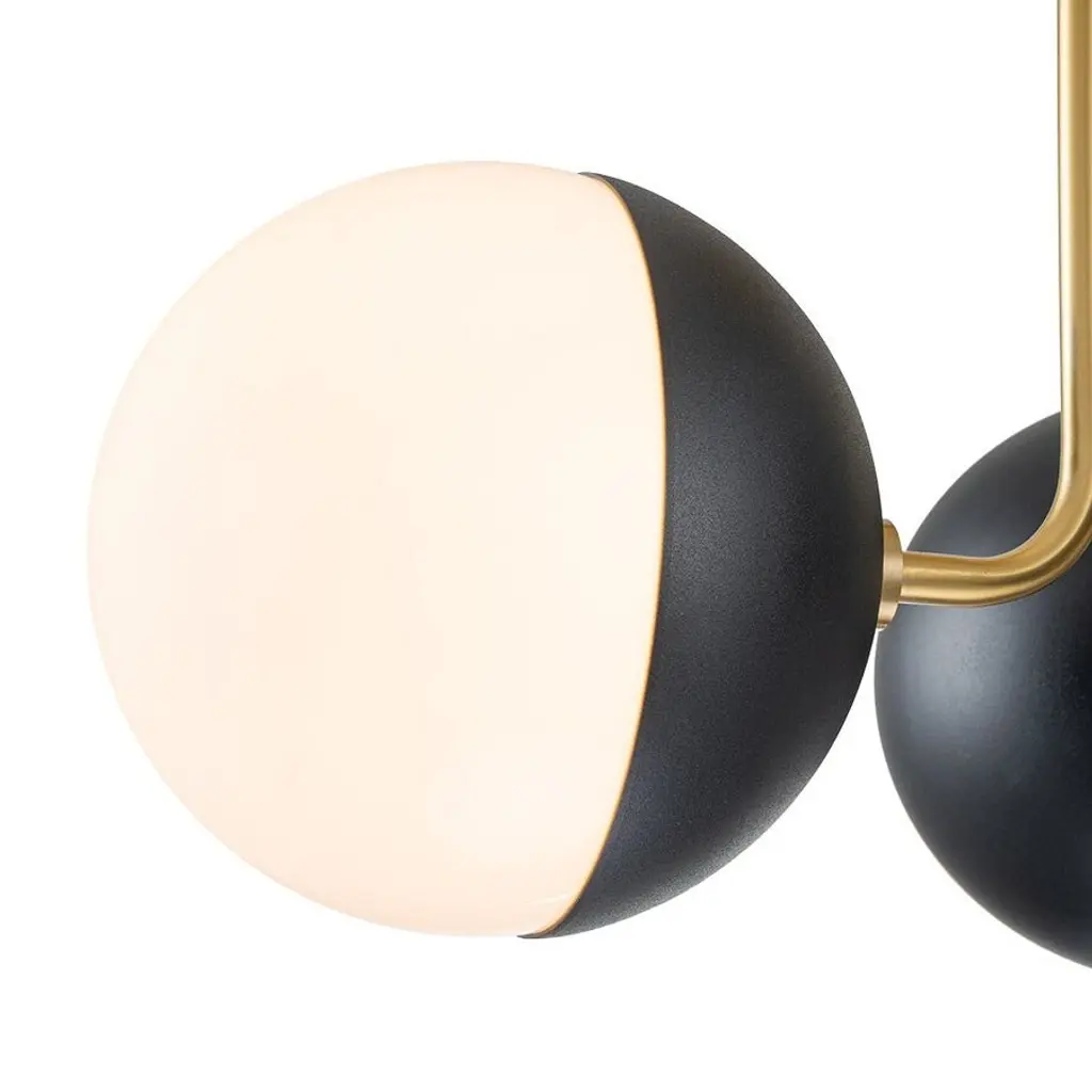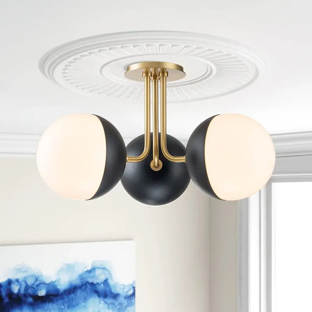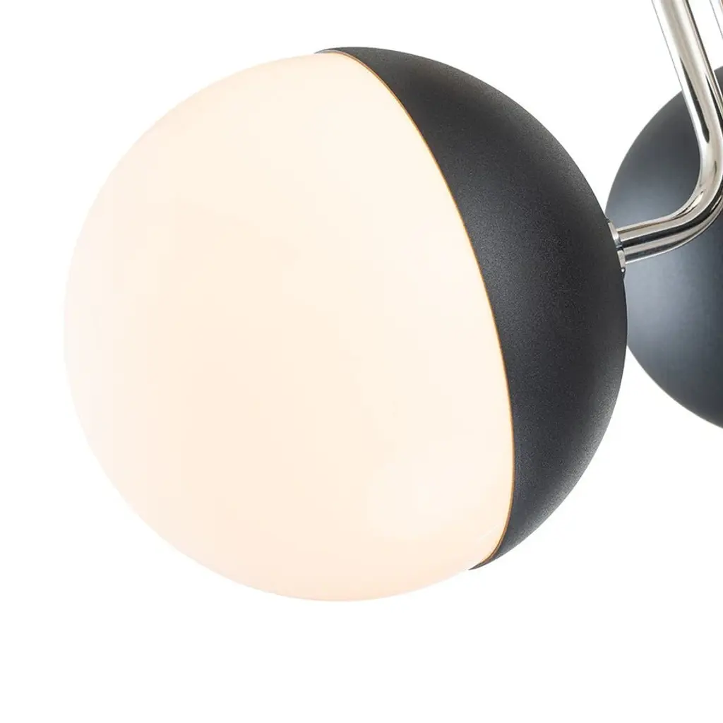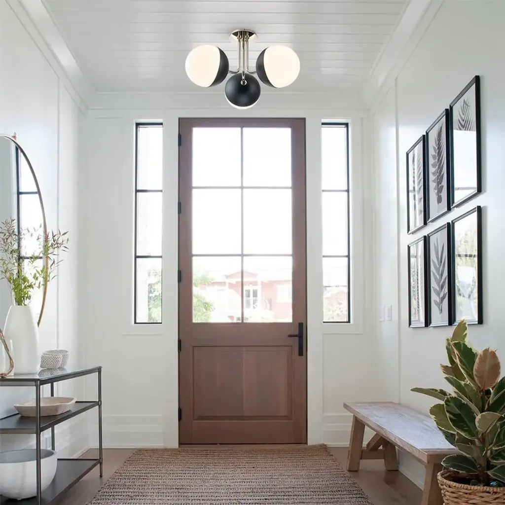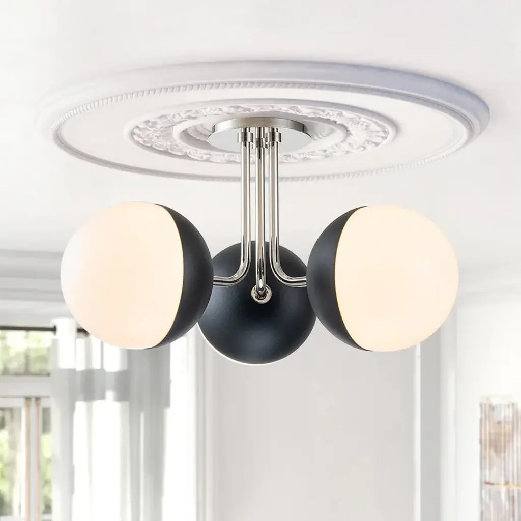 Bring a timelessly chic aesthetic to your home with this opal glass globe sputnik ceiling light. Three spherical shades with black domes are supported by curved arms finished in luxury brass or nickel, providing a warm and inviting glow to your entryway, bedroom, dining room, living area, or bathroom. With its sophisticated silhouette and opal white glass globes, this mid-century modern 3-light sputnik globe semi flush mount lighting is sure to amuse the eye and provide chic elegance to your decor.Features:Specification: