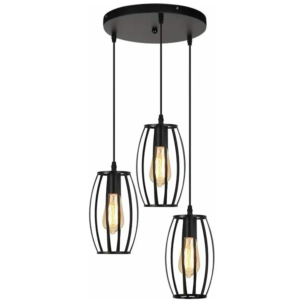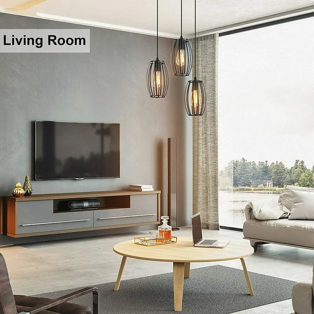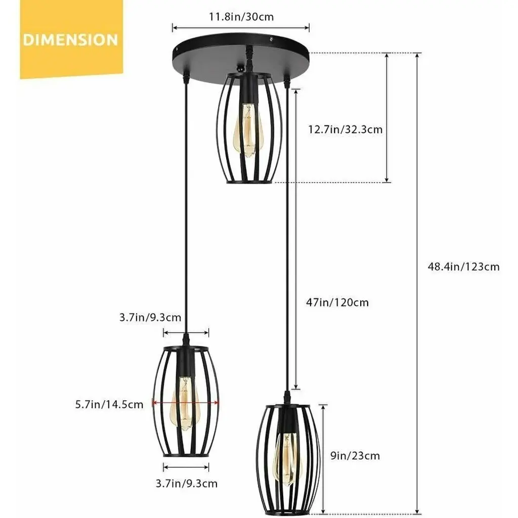 [PERFECT DESIGN]This 3-Light Industrial Pendant Lighting , designed with creative and fashionable vintage caged lampshade, with classic vintage looking bring illumination and warmth to your living space. It"s perfect suitable for kitchen, island, living room, dining room, bedroom, hall, aisle, bar, club, hotels, caffe and restaurant.[ADJUSTABLE HEIGHT]The pendant lights lenght is 48.4inch, Lampshade: 3.7*3.7*9 inch (L x W x H); Ceiling Backplate: Diameter 11.8inch, 1inch(H).The hanging length cable can be adjust, Max 47.24 inch (120cm), It\'s also suitable for sloped ceiling, you can customize the length to get the better lighting you want. please confirm the size before purchasing it.[E26 STANDARD BASE]The industrial chandelier with E26 universal standard base socket, Max 60 watts (Not included bulbs).Compatible with most kinds of Edison bulbs, incandescent lamps, LED, CFL and halogen bulbs. The lantern-shaped lampshade casts beautiful light and shadow under the lighting.