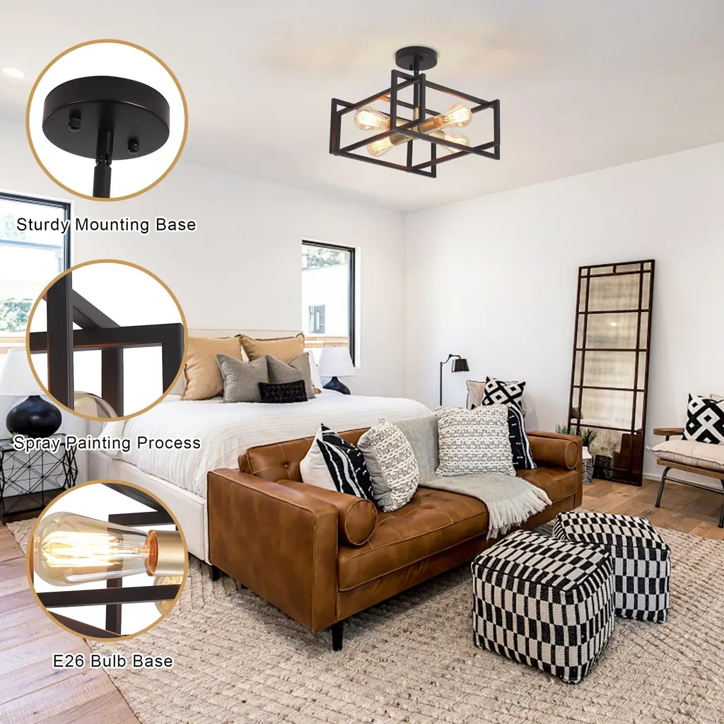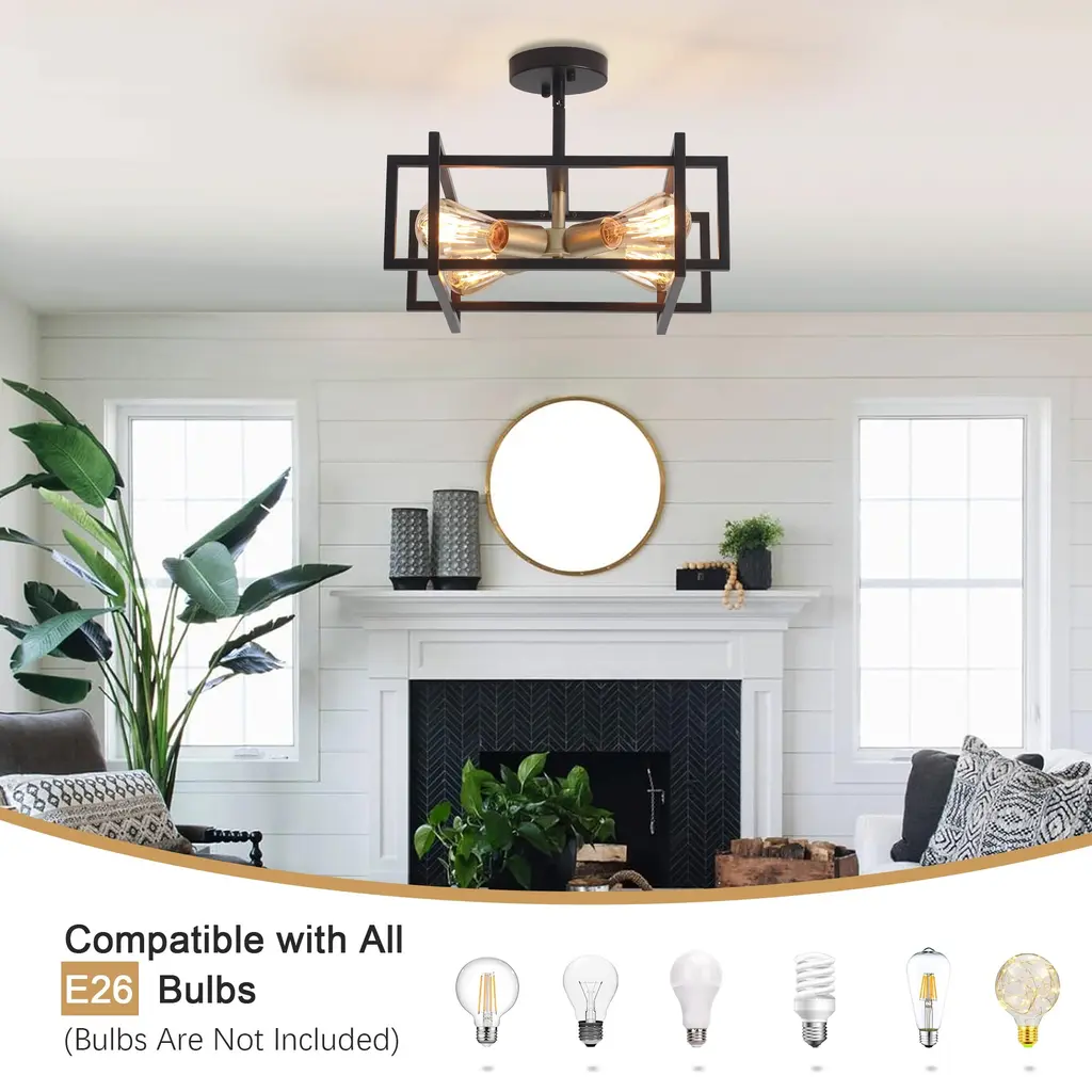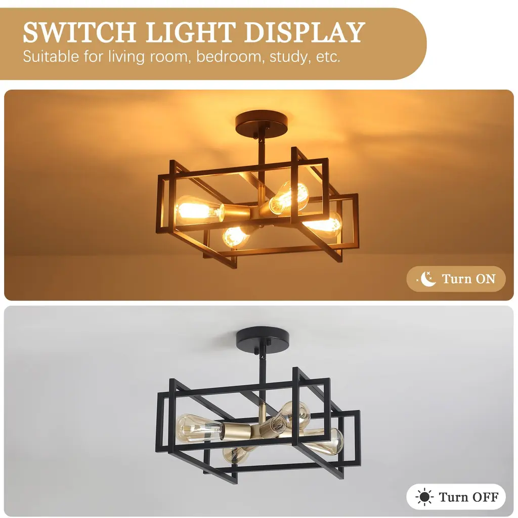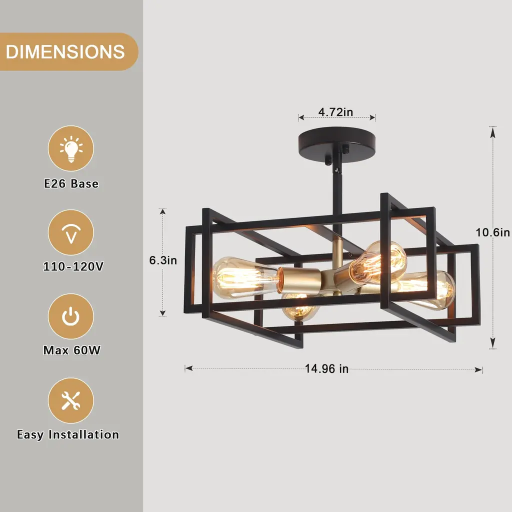 This industrial farmhouse semi flush mount ceiling light features a distinctive open rectangular frame design with a 4-light bulb holder. Its matte finish provides a comfortable and cozy ambiance which enhances its vintage charm, blending farmhouse, industrial, modern, rustic, and vintage styles. Suitable for dining rooms, living rooms, bedrooms, kitchens, entryway,and more. Features: