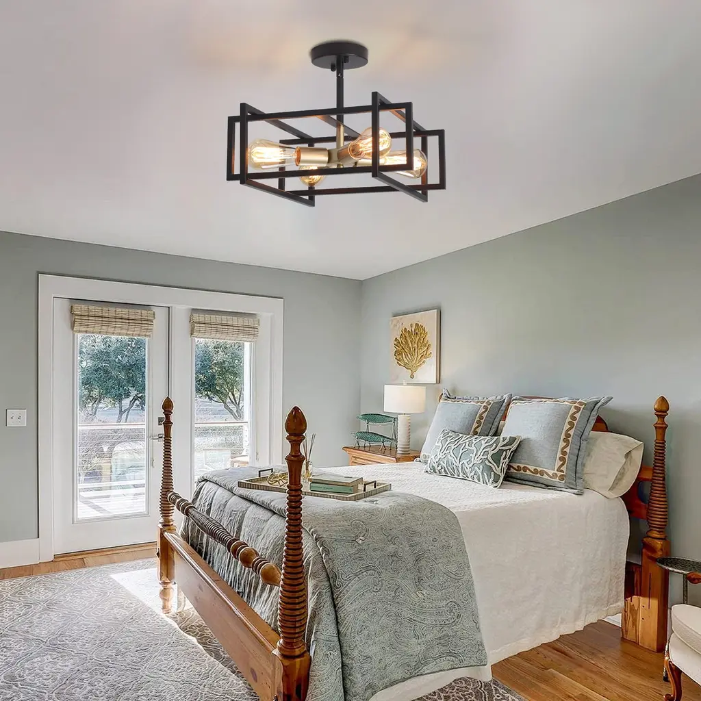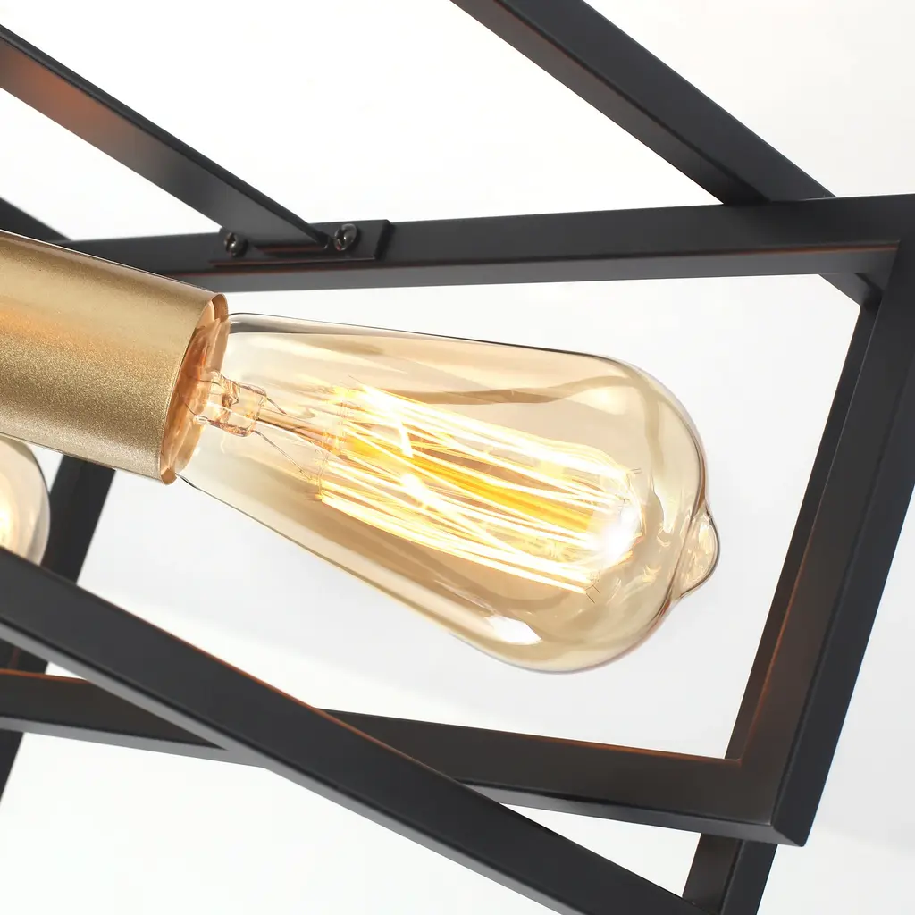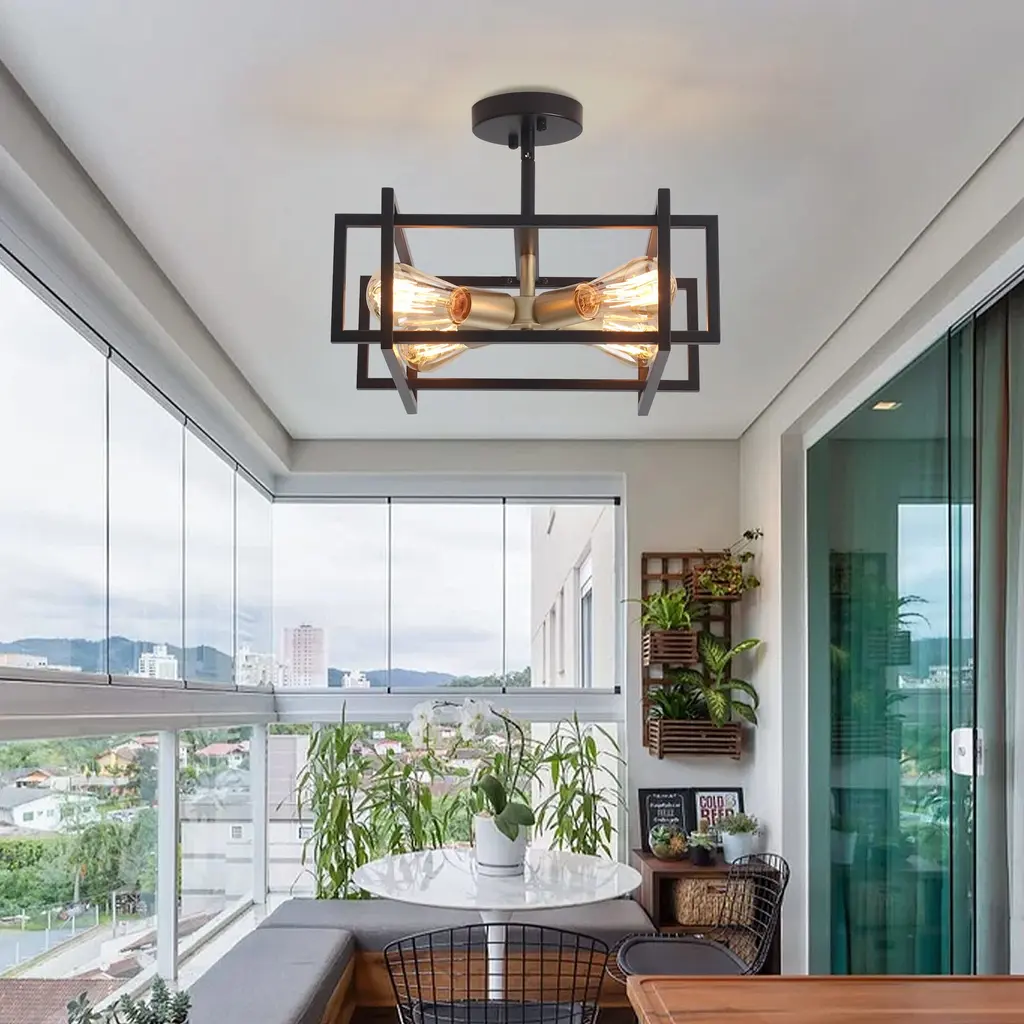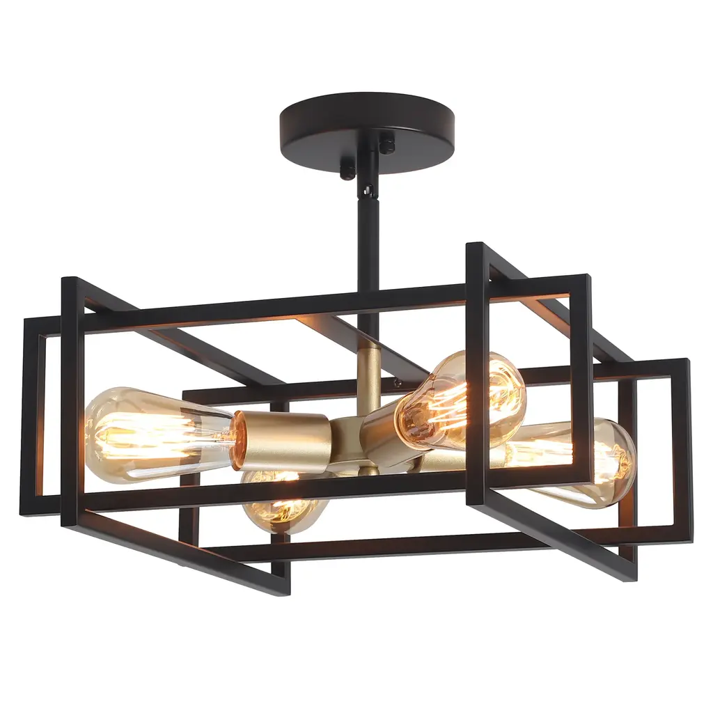 This industrial farmhouse semi flush mount ceiling light features a distinctive open rectangular frame design with a 4-light bulb holder. Its matte finish provides a comfortable and cozy ambiance which enhances its vintage charm, blending farmhouse, industrial, modern, rustic, and vintage styles. Suitable for dining rooms, living rooms, bedrooms, kitchens, entryway,and more. Features: