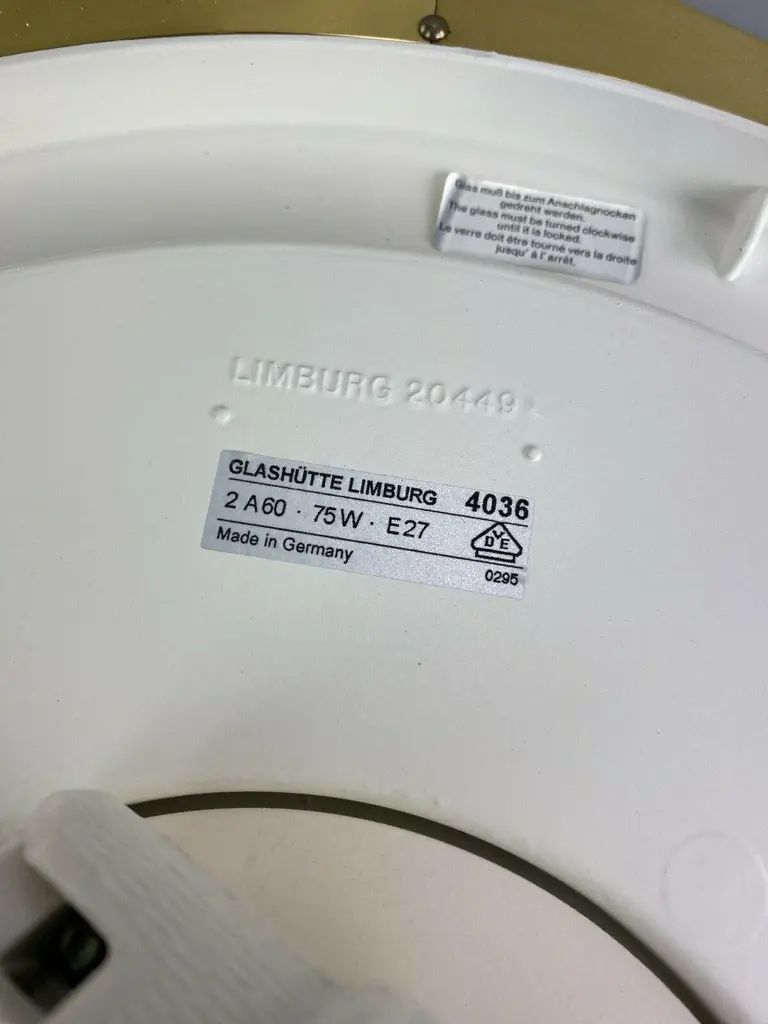 70s Limburg Glashütte Plafoniere ceiling lamp glass space design lamp 70sObject: lampManufacturer: Limburg lights 4036Condition: goodAge: around 1960-1970Dimensions:Diameter = 46cmHeight = 15cmOther notes:The pictures serve as part of the description!Please keep in mind that we are offering used goods for sale here - they are notnew goods - this means that the items may show signs of wear!