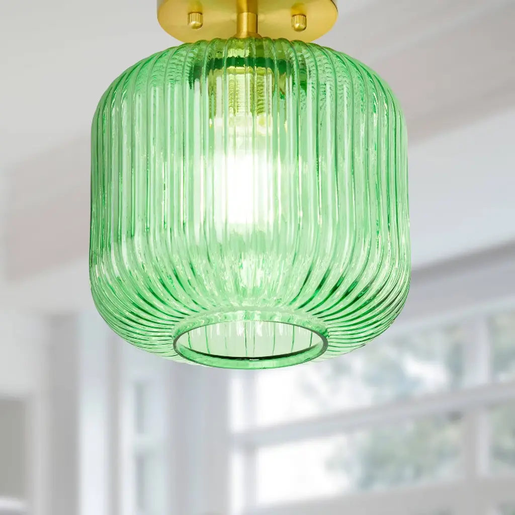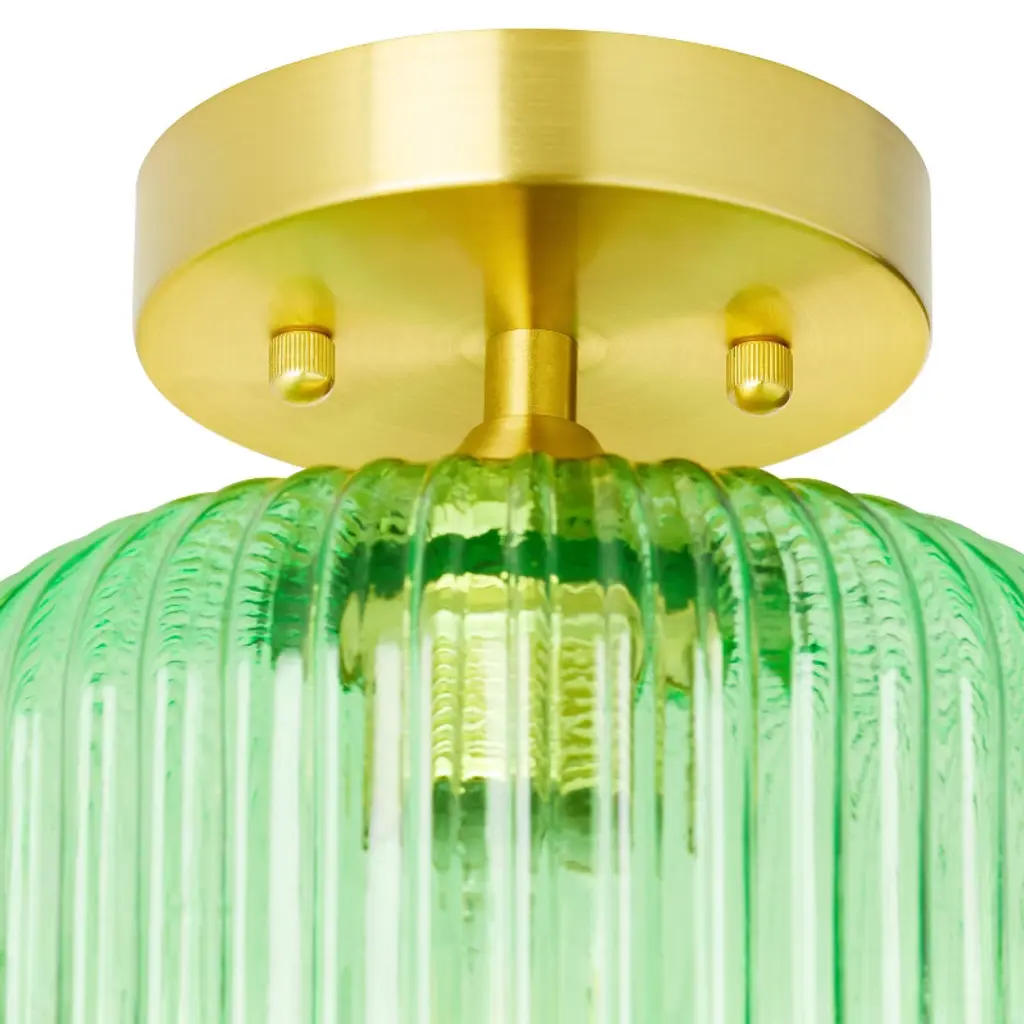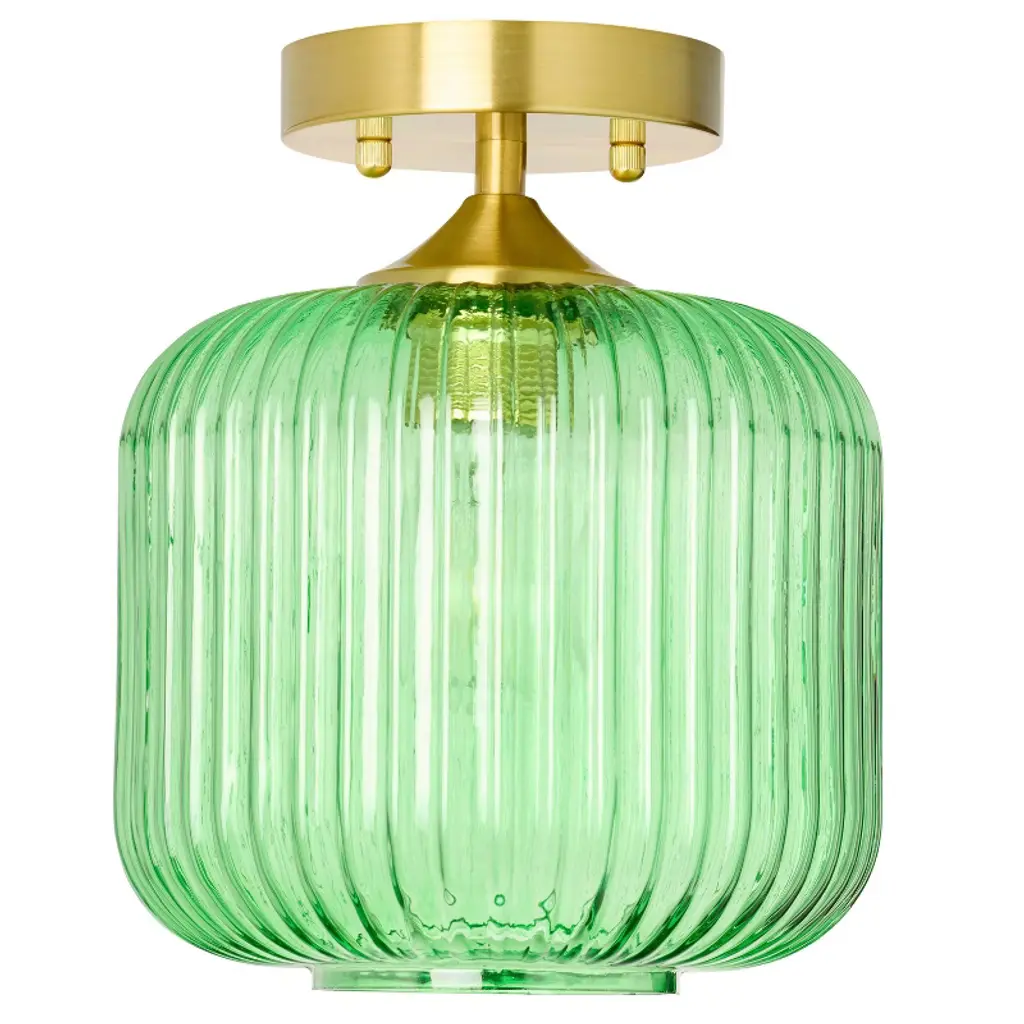 The 10.25" H William Green Globe Ceiling Light from River of Goods gives you a fun, retro-style lighting option for any space in your home. This ceiling light showcases a green glass globe shade and a brushed gold-finish metal base for eye-catching contrast. It requires one 40-watt E26 bulb (not included), and it's also LED compatible. Easy to pair with a variety of retro or contemporary decor schemes, it's sure to cast a soft, warm glow in whatever room you install it in.