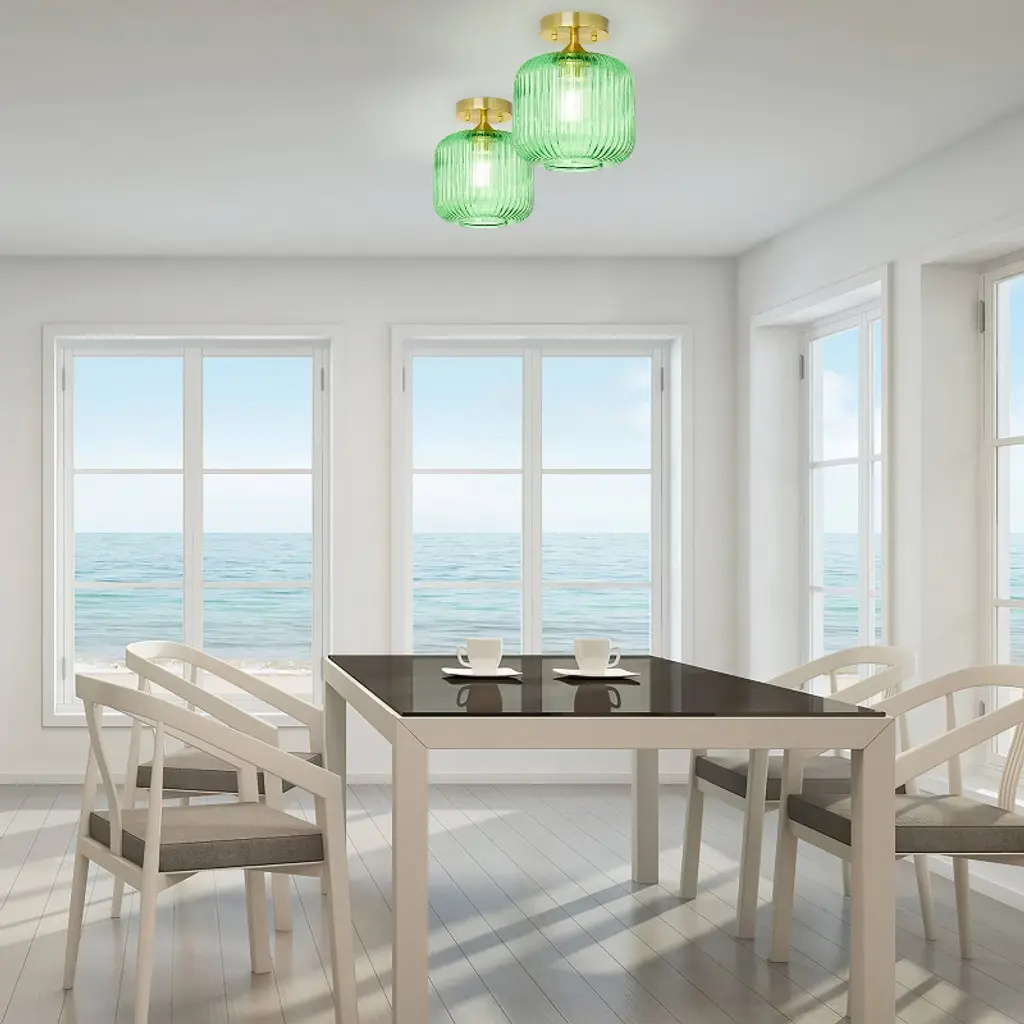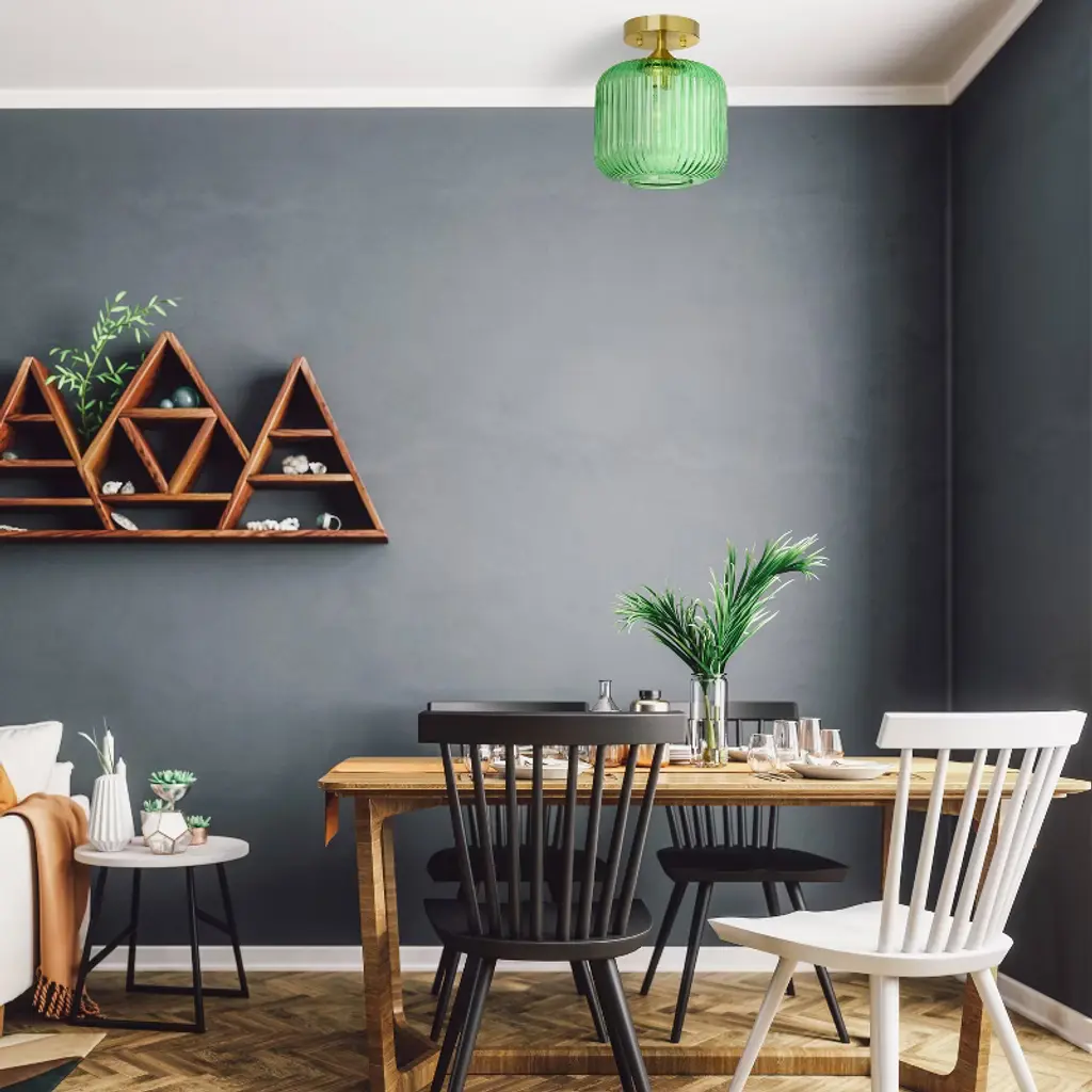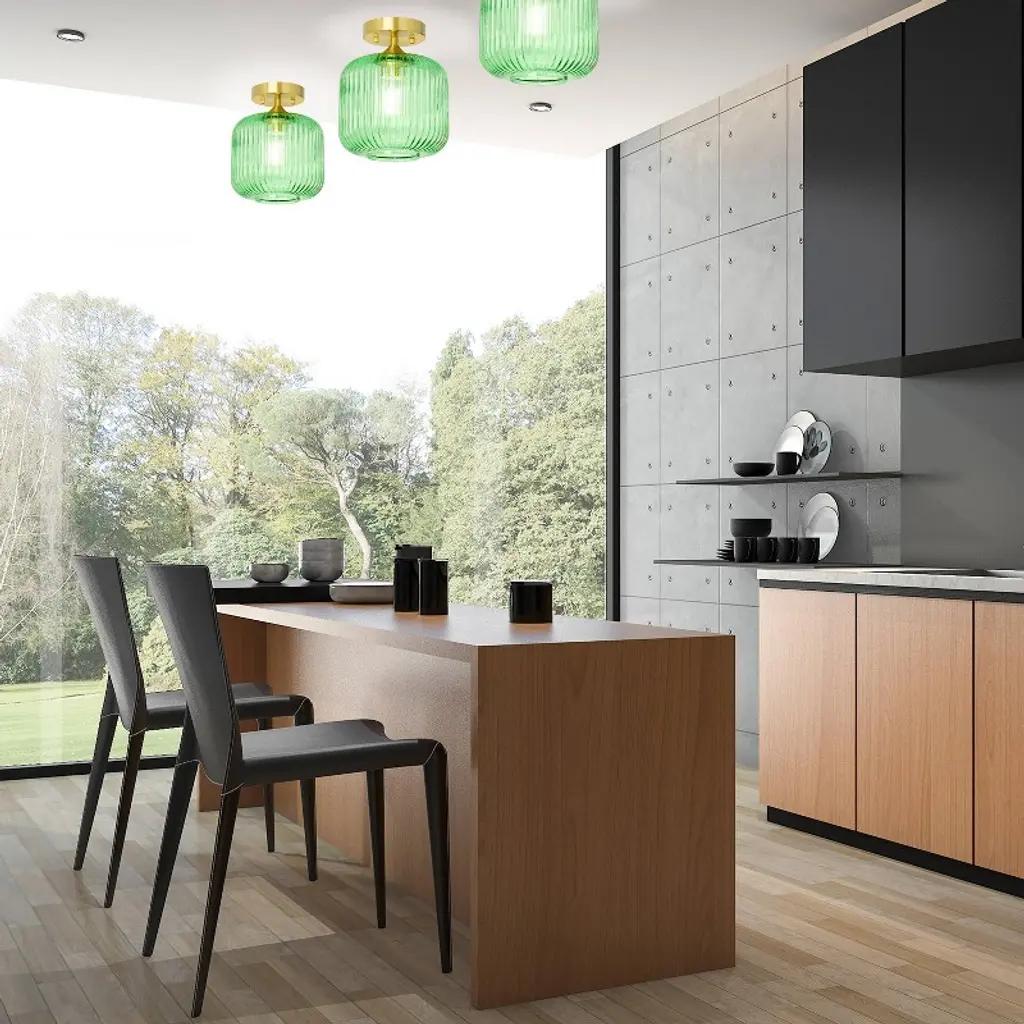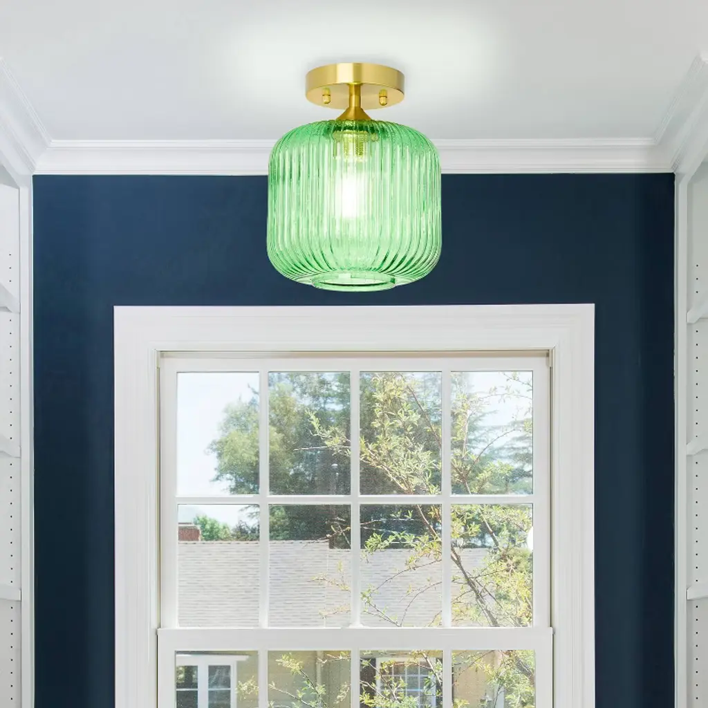 The 10.25" H William Green Globe Ceiling Light from River of Goods gives you a fun, retro-style lighting option for any space in your home. This ceiling light showcases a green glass globe shade and a brushed gold-finish metal base for eye-catching contrast. It requires one 40-watt E26 bulb (not included), and it's also LED compatible. Easy to pair with a variety of retro or contemporary decor schemes, it's sure to cast a soft, warm glow in whatever room you install it in.