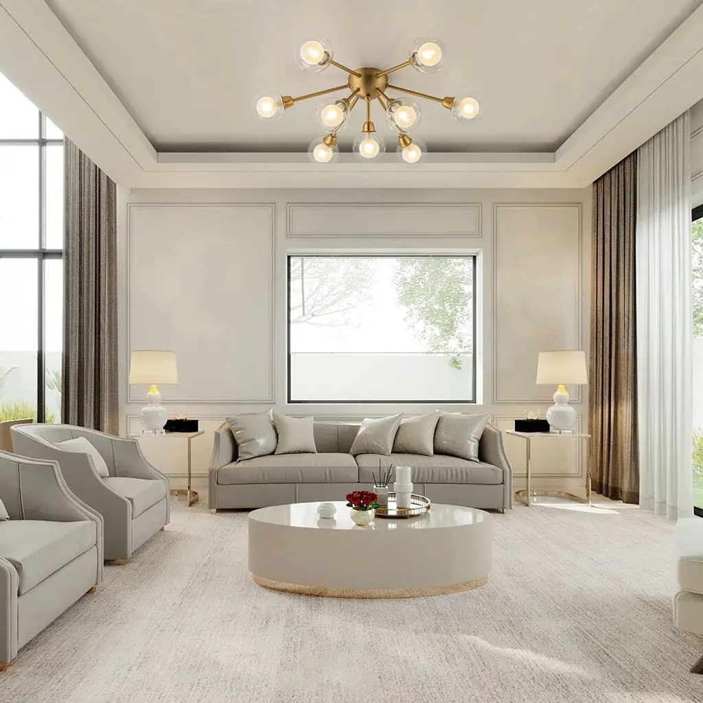 Add a touch of mid-century charm and contemporary elegance to your entryway, bedroom, foyer, kitchen, dining area, or bathroom with this stunning sputnik ceiling light. Crafted of brushed brush or matte black, this 9-light semi flush mount features nine short rods extending in various directions. Each rod ends with a transparent glass globe shade encasing a smaller milky white glass globe, softly diffusing the light from G9 bulbs (not included). This design creates a warm, stylish ambiance, evoking a delicate gypsophila, perfect for adding an inviting glow to any space.FeaturesSpecification