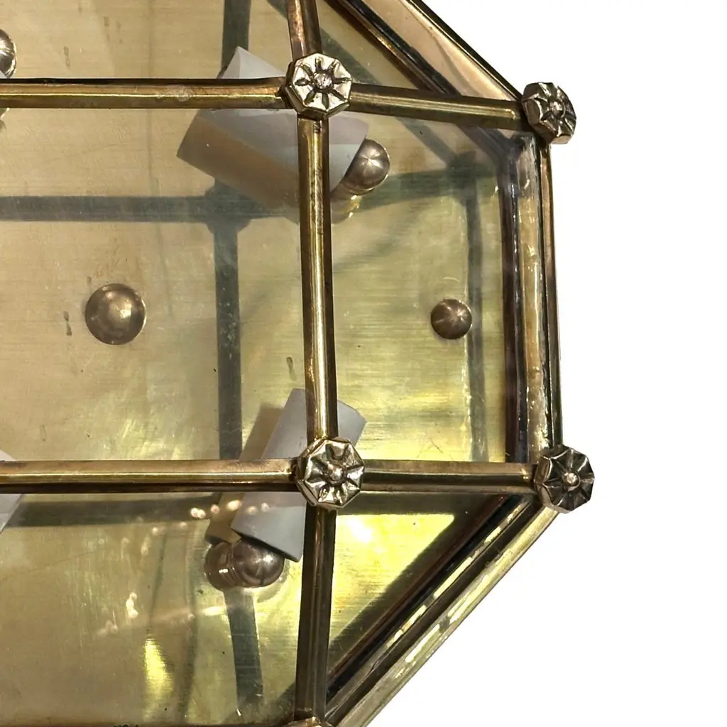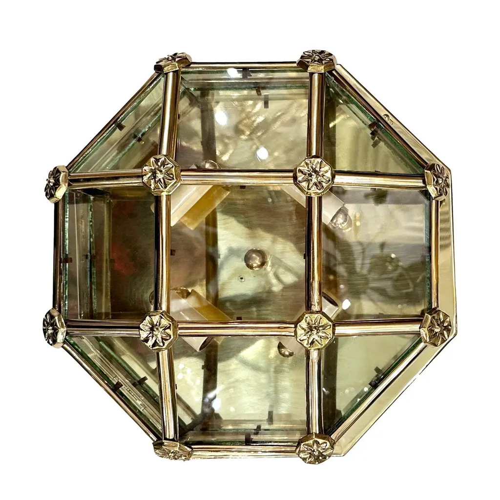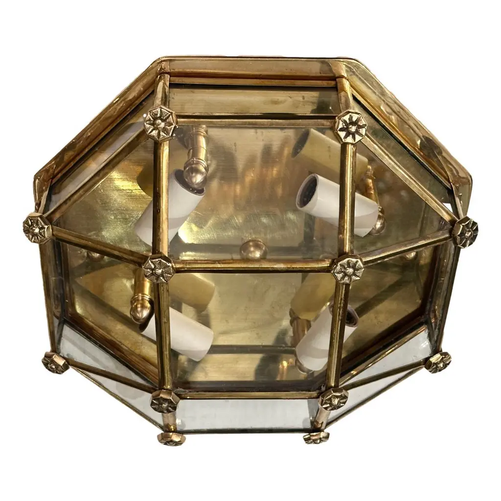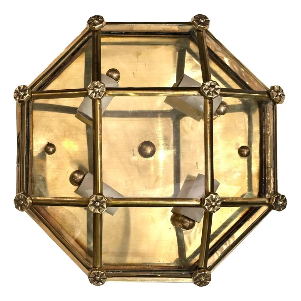 A set of 13 circa 1950's English bronze light fixtures with 4 interior lights each. Sold and priced individually.Measurements:Drop: 3″Diameter: 13″