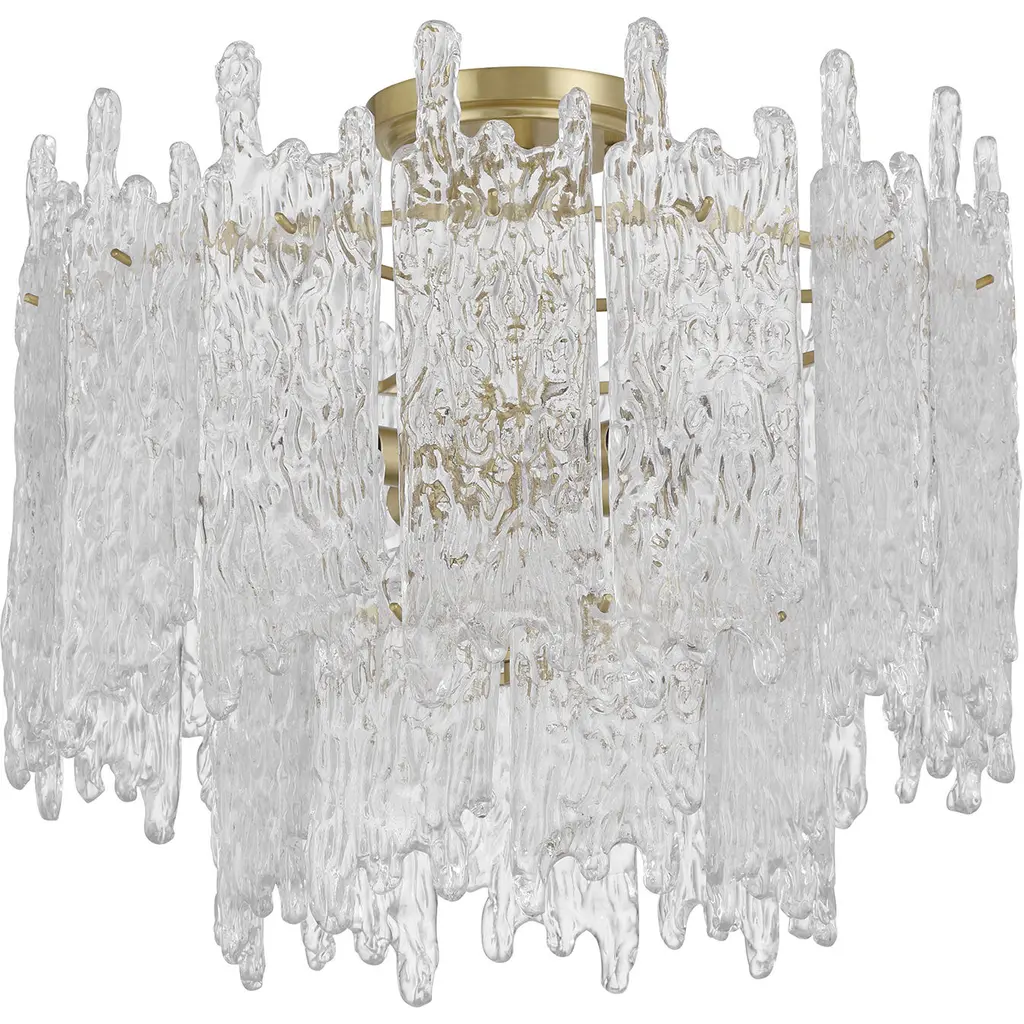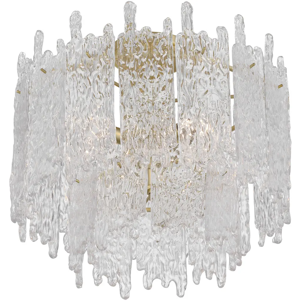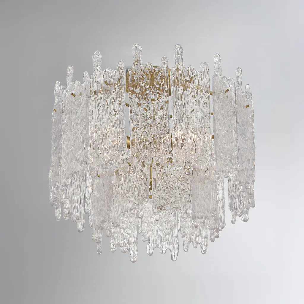 The Ackerly Collection showcases stunning ice glass, a textured material that resembles frozen or cracked ice. Its frosted, crystalline surface uniquely scatters light, producing a soft, diffused glow. This organic, sculptural effect adds a modern yet slightly retro touch to the design. The Ackerly Collection combines elegance with an artistic, edgy aesthetic, making it a standout in any space.