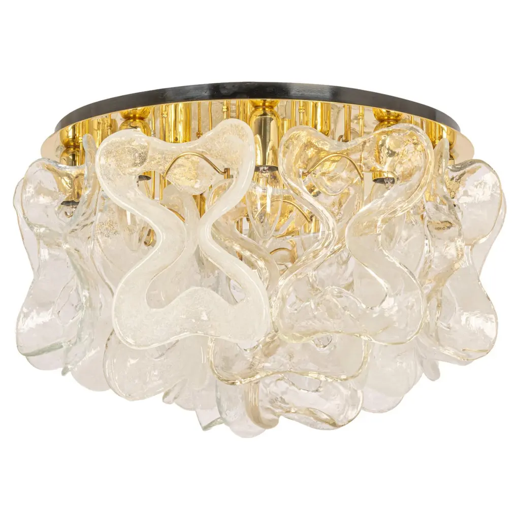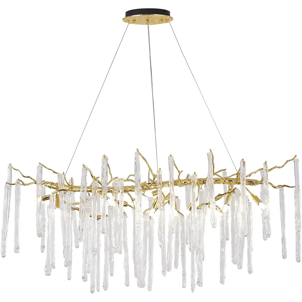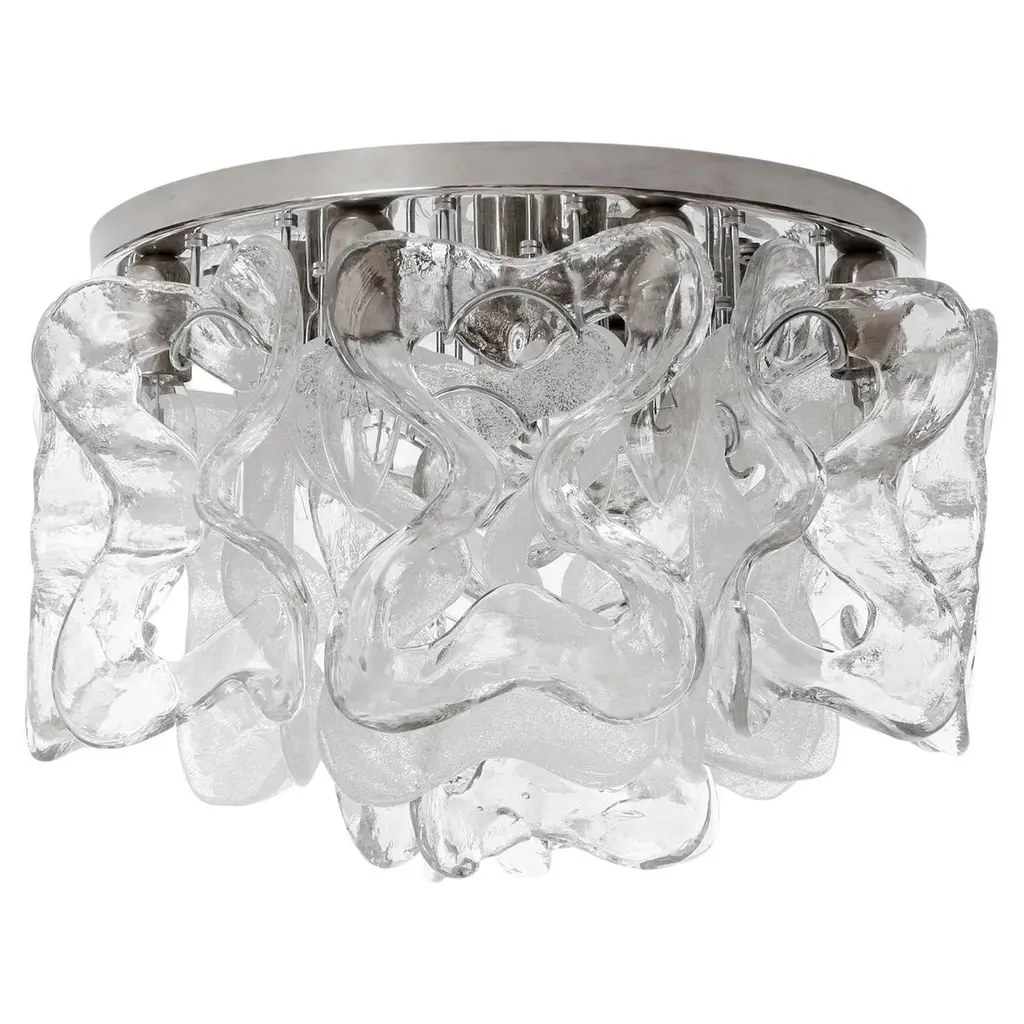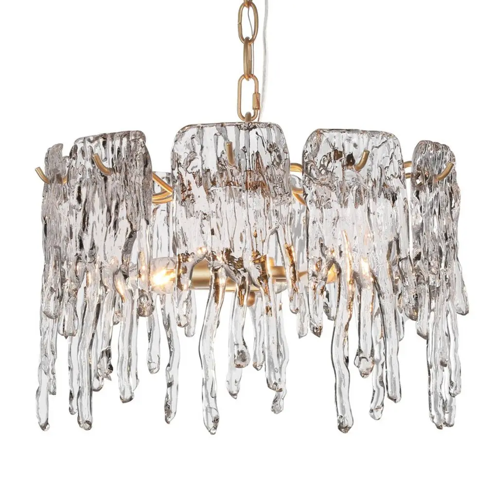 The Ackerly Collection showcases stunning ice glass, a textured material that resembles frozen or cracked ice. Its frosted, crystalline surface uniquely scatters light, producing a soft, diffused glow. This organic, sculptural effect adds a modern yet slightly retro touch to the design. The Ackerly Collection combines elegance with an artistic, edgy aesthetic, making it a standout in any space.