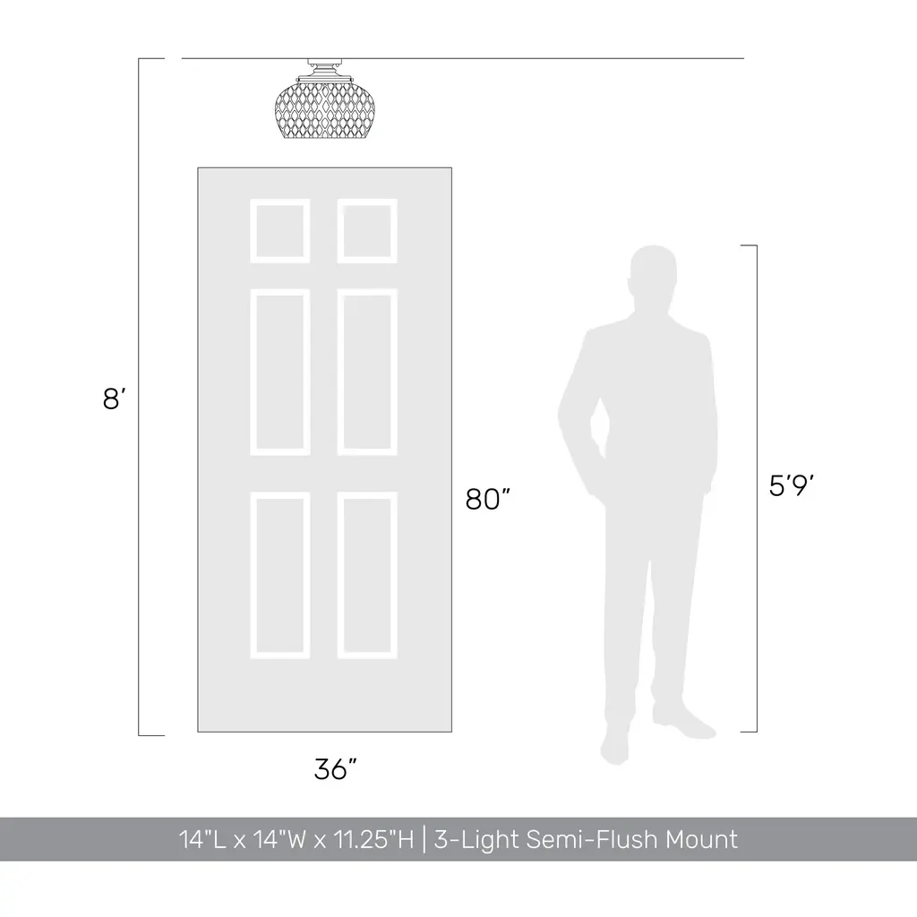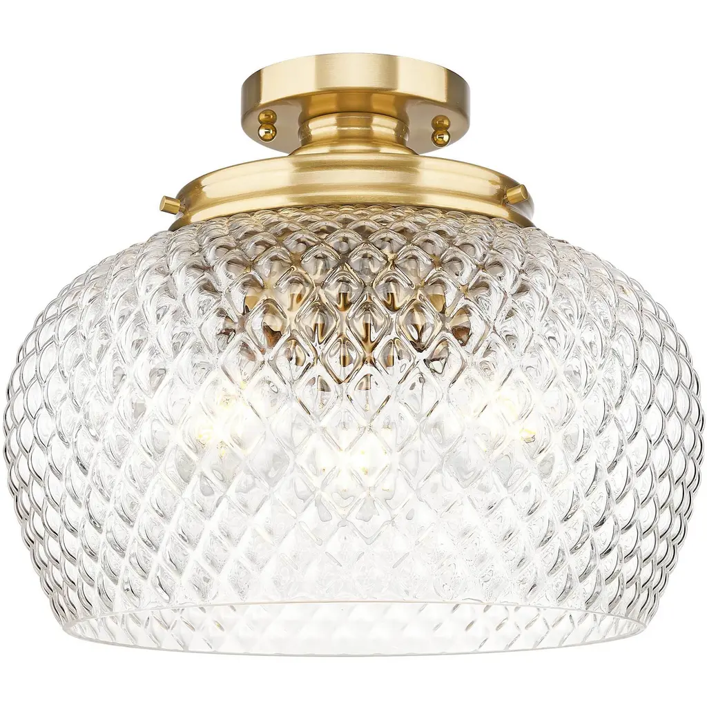 Bring farmhouse elegance into your home with the Golden Lighting Adeline 3-light Semi-Flush Mount. Featuring a glass shade and a Modern Brushed Gold frame, it creates a welcoming atmosphere.The clear glass shade allows for brilliant, unobstructed light, perfectly showcasing the warmth and character of your bulb. Its polished finish enhances the overall aesthetic while providing a vintage-inspired touch.The Modern Brushed Gold finish radiates warmth and contemporary appeal, diffusing light beautifully for a soft, inviting glow.Ideal for spaces with mid-height ceilings, this fixture is damp location rated, making it suitable for covered areas with occasional moisture. Requires 3 E26 Medium base bulbs (not included) with a maximum wattage of 60 per bulb.Overall Dimensions: 14"W x 11.25"H x 14"D.Illuminate your home with a blend of modernity and charm, ensuring both style and practicality.