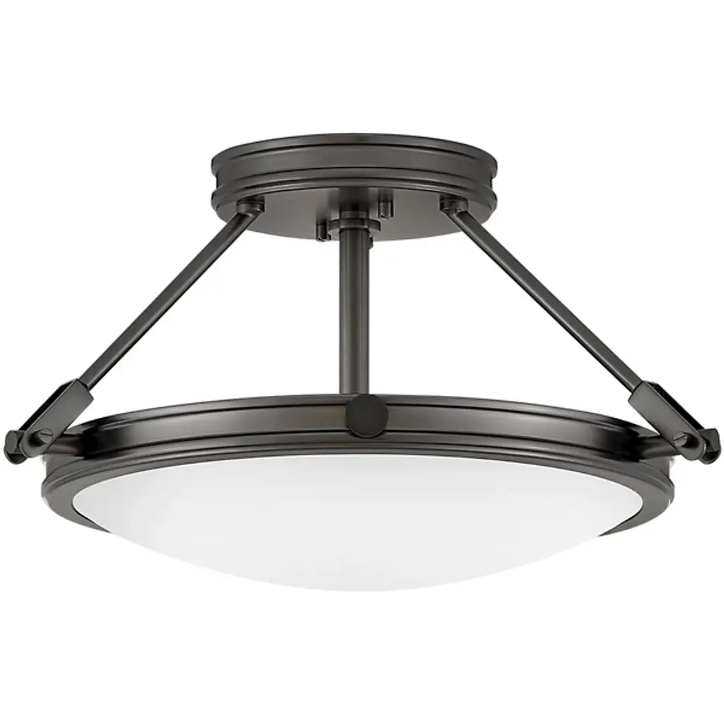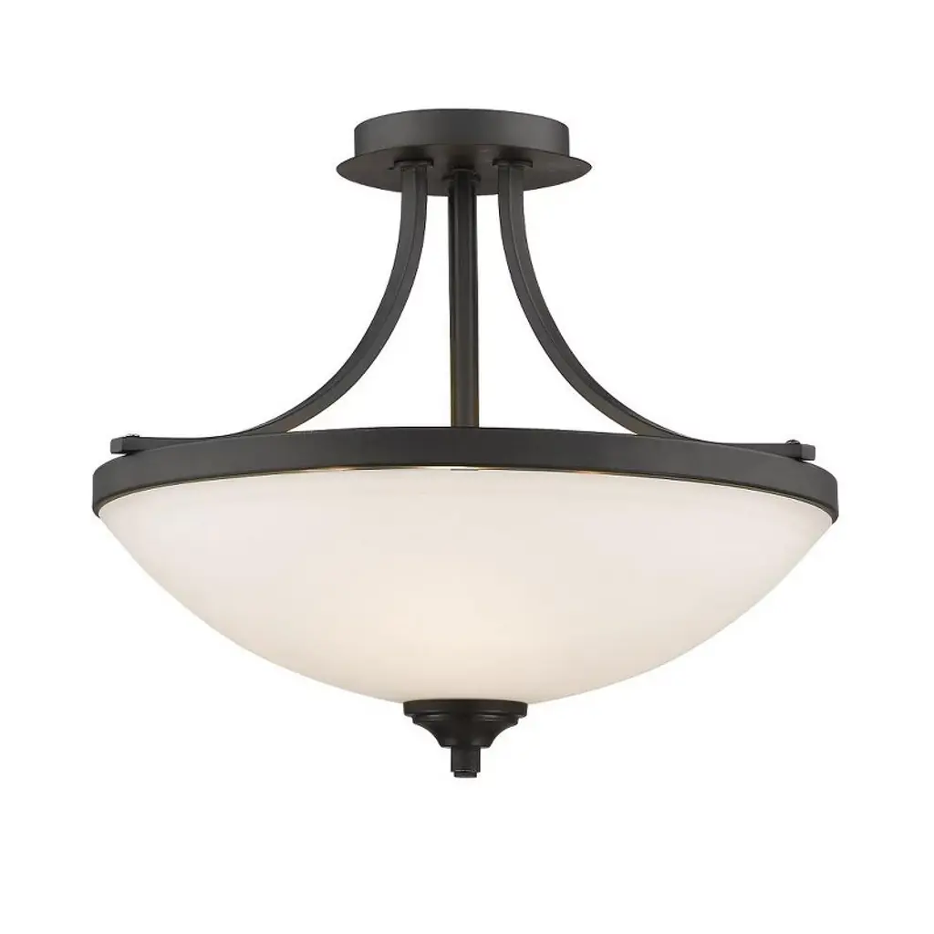 A simple and clean design make the 3-light semi flush fixture in Olde Bronze from the Alkire collection a modern classic. The semi-flush style provides a generous amount of light, while the metal work hook and eye design adds visual interest overhead.