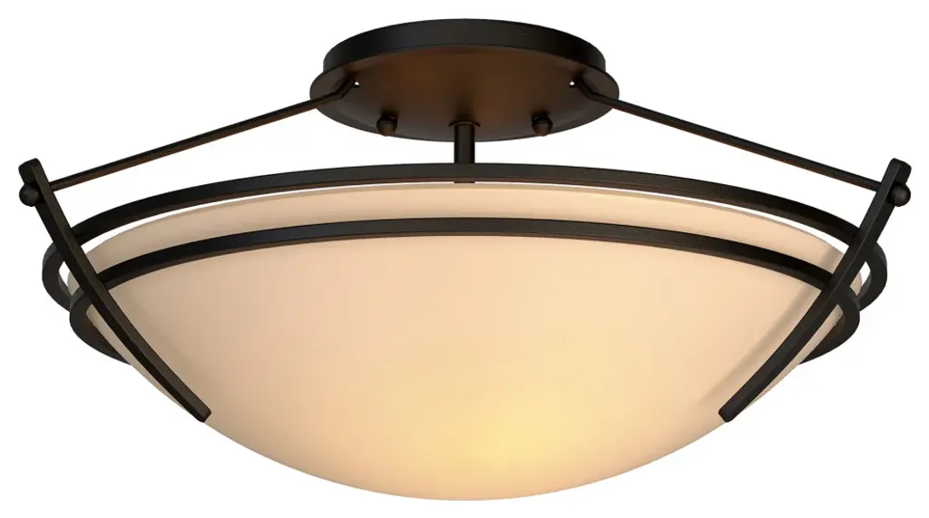 A simple and clean design make the 4-light semi flush fixture in Olde Bronze from the Alkire collection a modern classic. The semi-flush style provides a generous amount of light, while the metal work hook and eye design adds visual interest overhead.