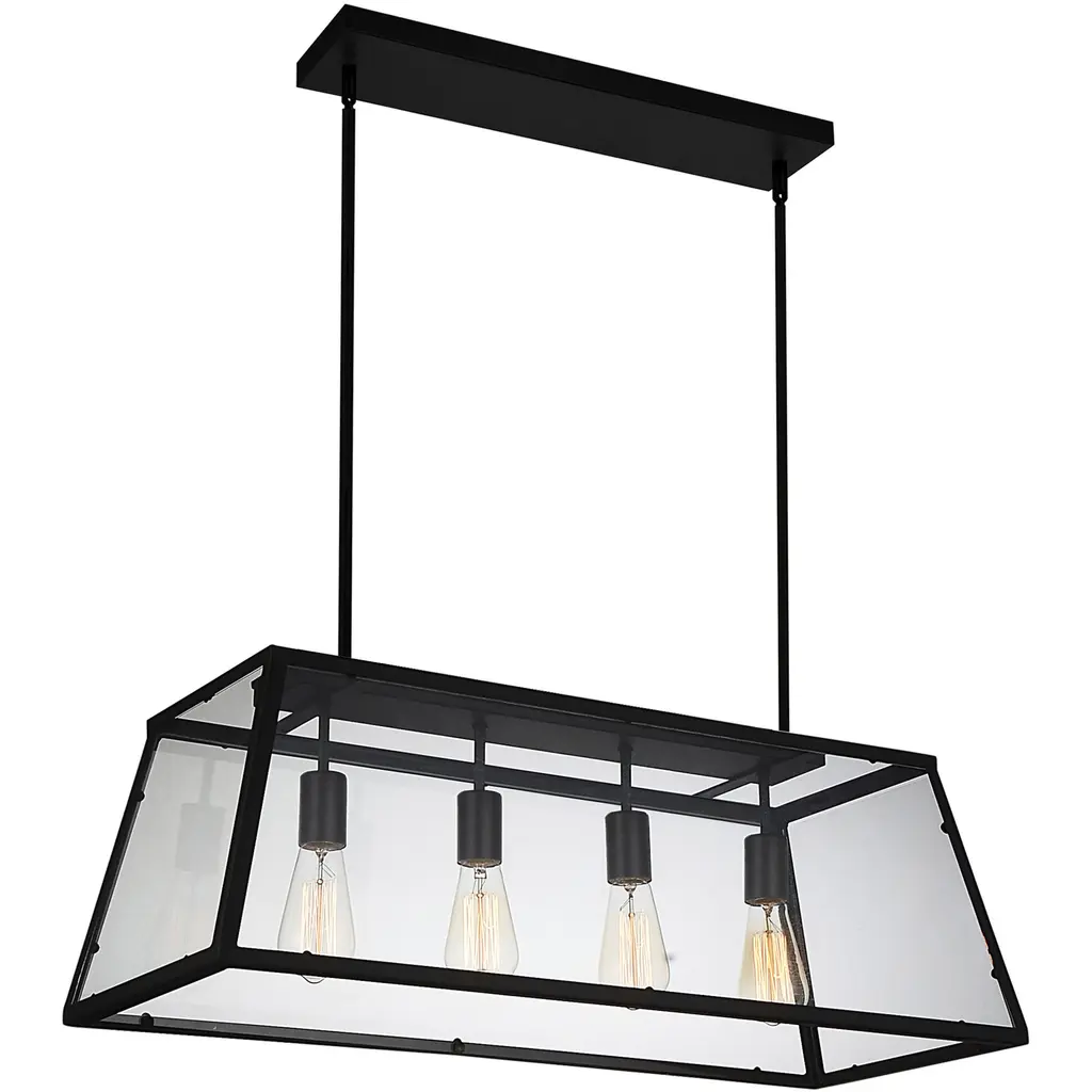 The Alyson 5 Light Chandelier clearly exudes that rustic warmth and industrial simplicity. This down chandelier has a 36 inch long glass and metal shade holding five exposed bulbs. This oversized light fixture can certainly cozy up a cottage-style kitchen or a rustic industrial dining room.