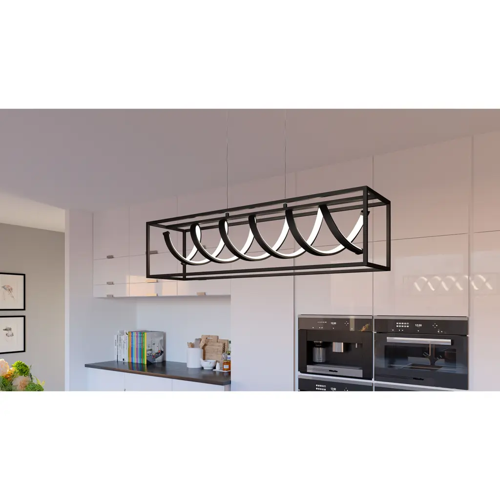 Functional lighting meets modern art. The Amaranth island light features an integrated light source for a continuous ambient glow. A matte black finish underscores its bold, futuristic design style.