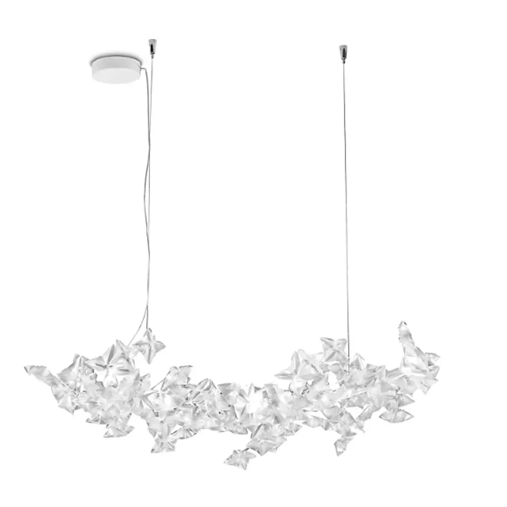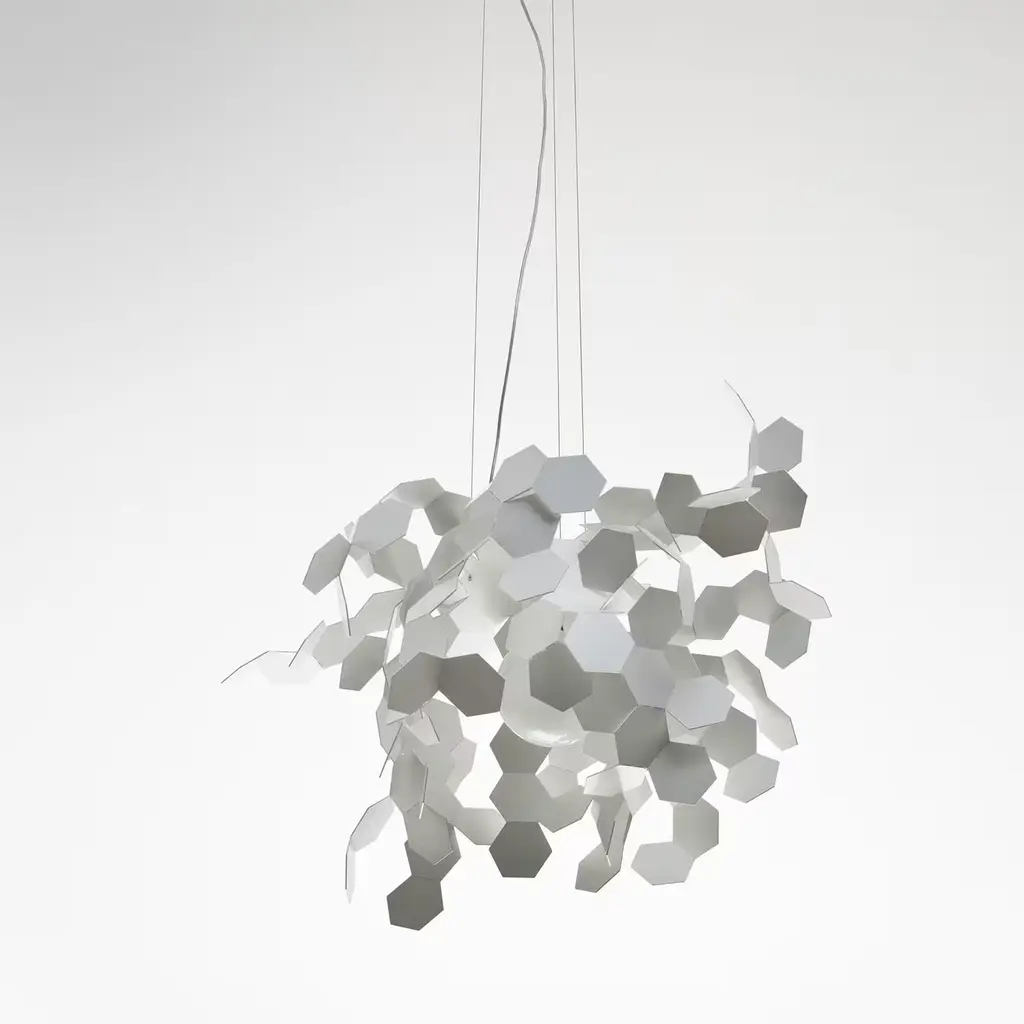 Designed by Paolo Ulian, this suspension lamp is finished in white to enhance the luminous effect of its unique diffuser. Perfect for contemporary interiors, the mesmerizing, organic effect is created by hexagonal aluminum modules arranged in a dynamic, irregular shape that is suspended from a round ceiling rose (Ø22 x H 4 cm) with cables. This lamp is available in three different dimensions and also in black. It holds one E27 max 100W bulb (not included).
